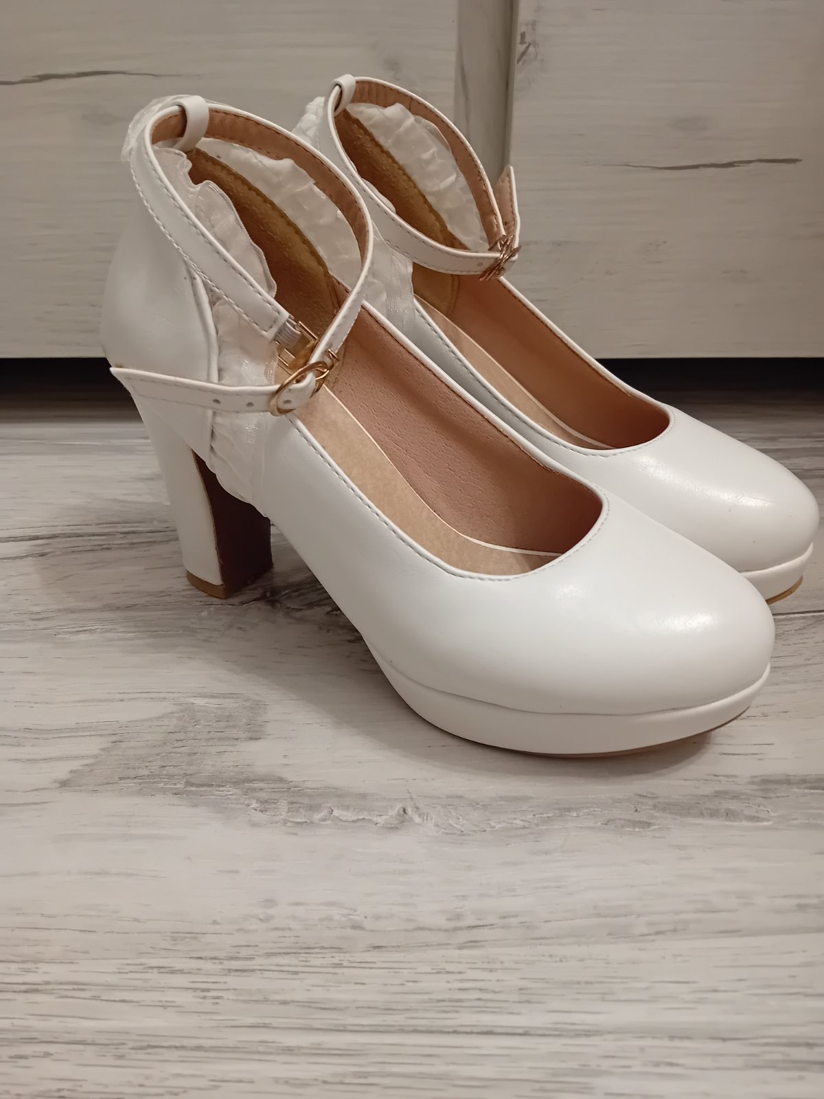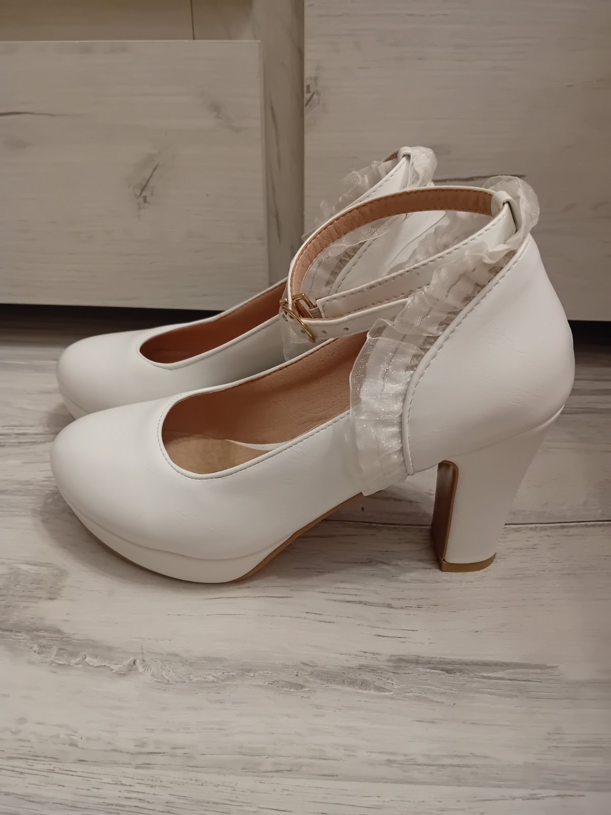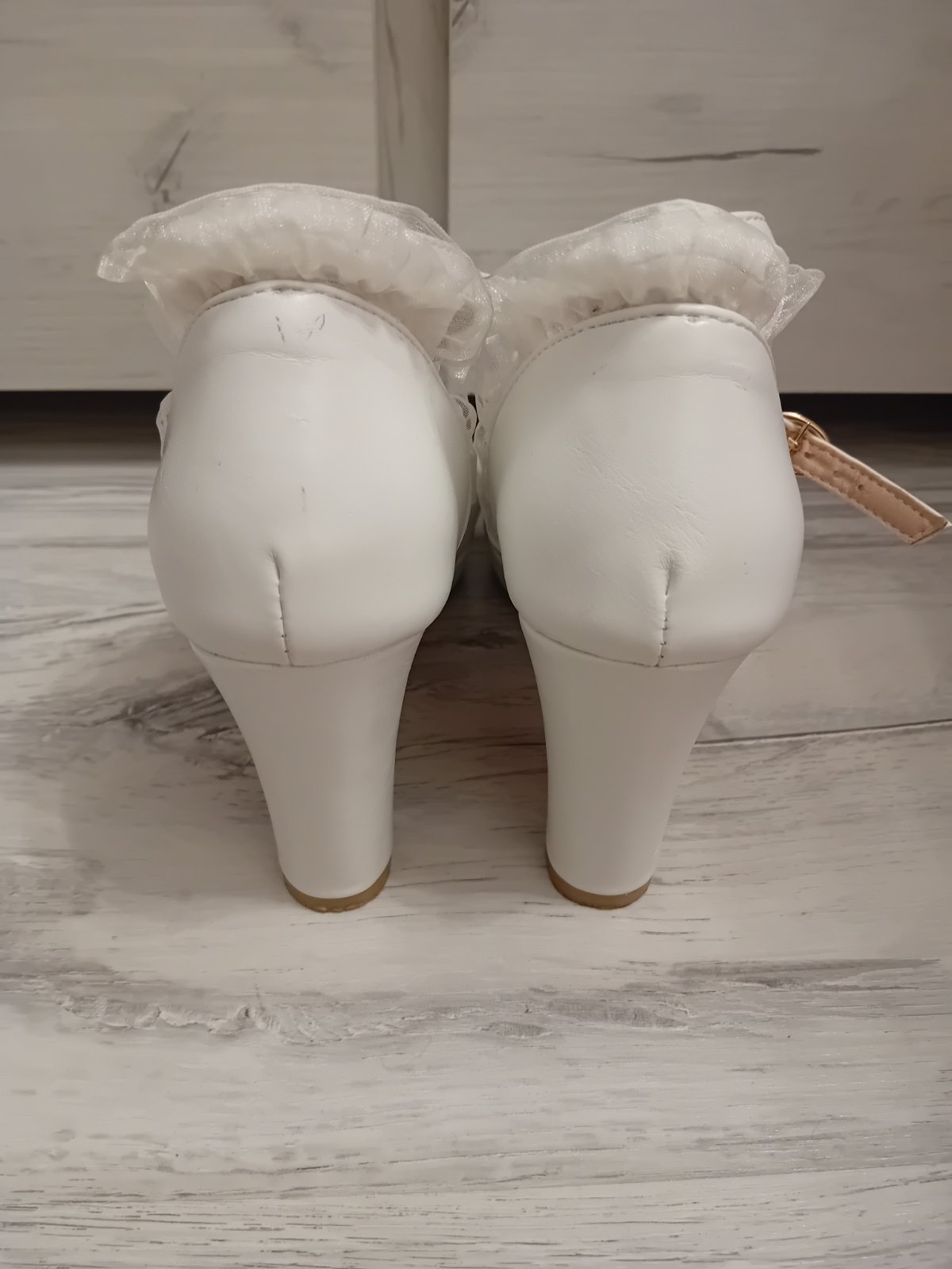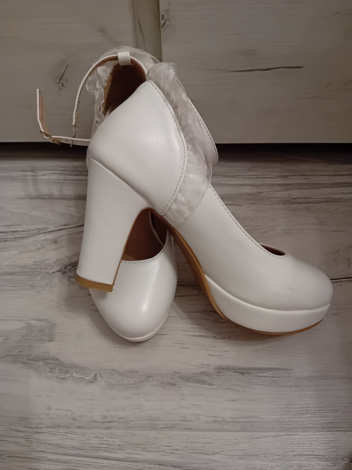 Raz obuté topánky, dcéra ich mala 3 hodiny počas omše a fotenia na dvore. Sú v stave ako nové, akurát na špičke je mierny škrabanec, ale takmer ho nevidno keď sú obuté na nohe