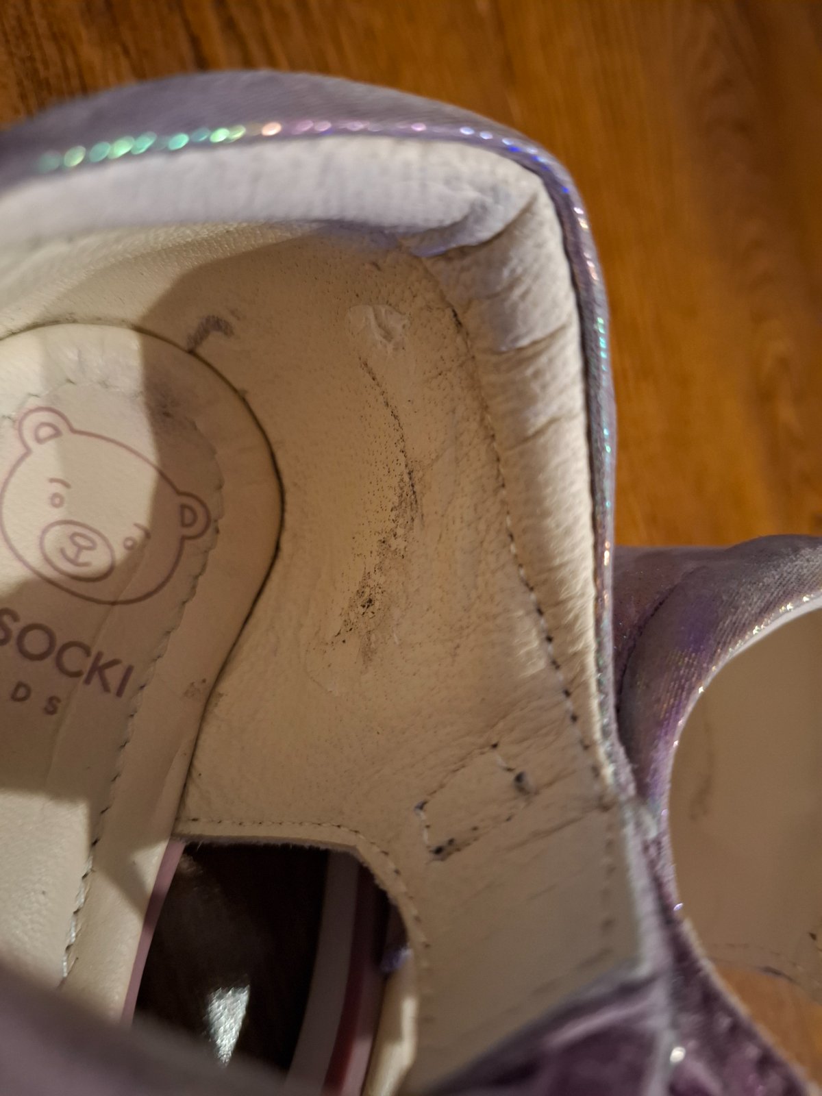 Majú nedostatky zvnútra kde bola nalepené menovky ale možno to pôjde aj dole a potom vpredu na ľavej topánočky. Nafotene ale myslím ze nic hrozne a vidiet len z blízka.