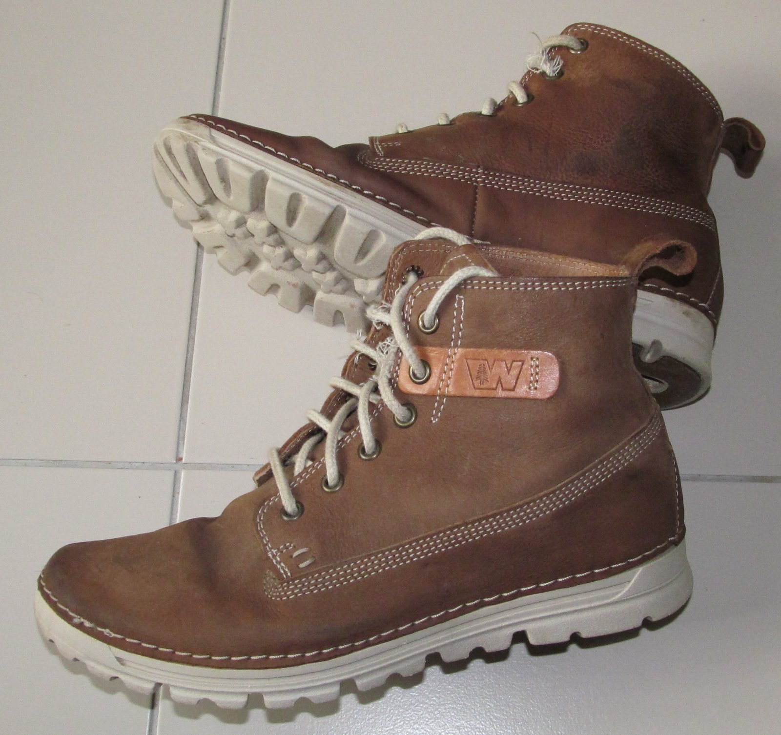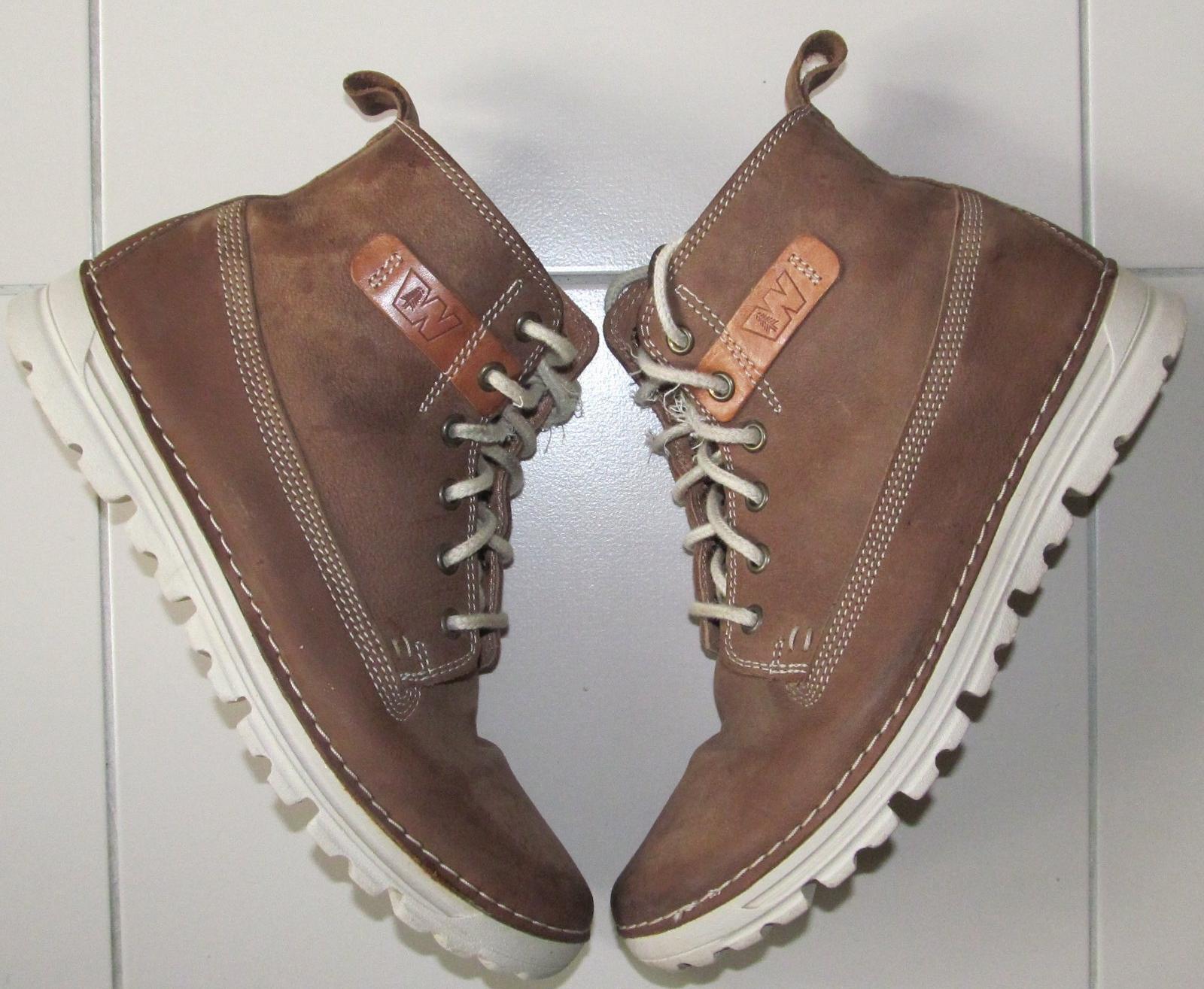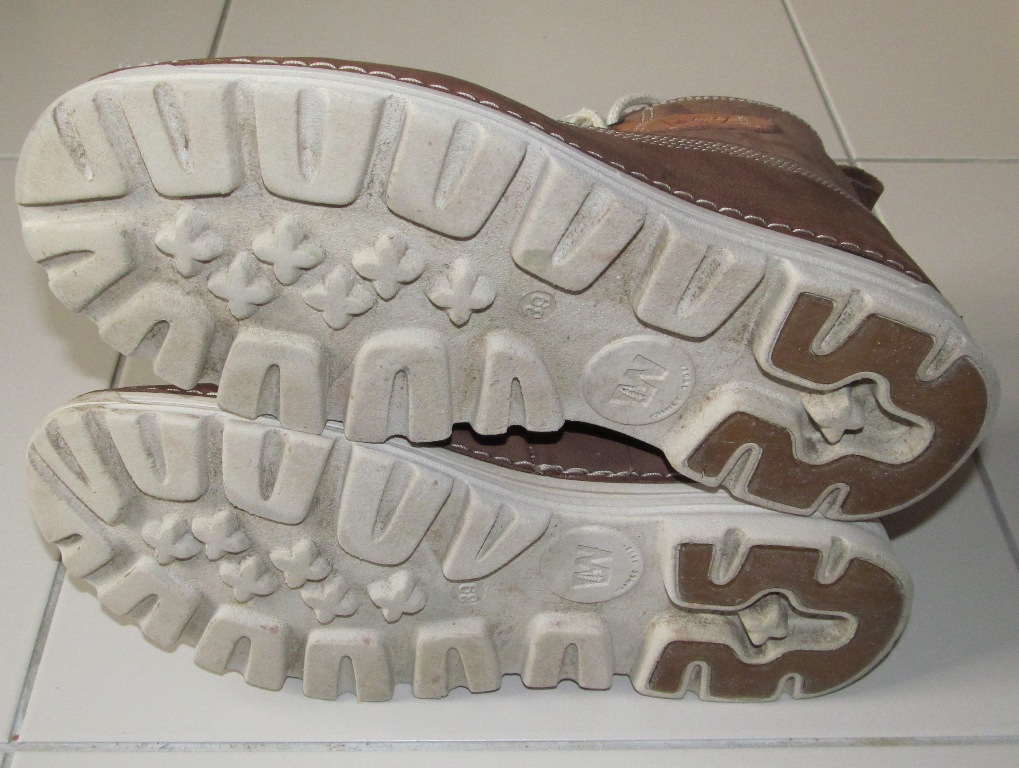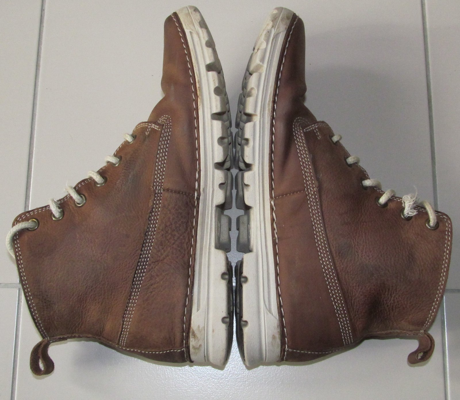 celokozene topanky z hrubej hovadzej koze, bez zateplenia - na jesen/jar. Impregnovane len sprejom, zmena farby na okrajoch je sposobena tym, ze som ich cistila vodou, ale po impregnacii kremom by sa upravila. Nosena kratko, snurky su rozstrapkane, ale topanky nie su znicene a podla podrazky vidno, ze neboli vela nosene. Kvalitna obuv. Dlzka vo vnutri merana pasmom je sice len 24 cm, ale sedia na v. 38,5-39, syn ma cca 39,5 a uz ho tlacia.