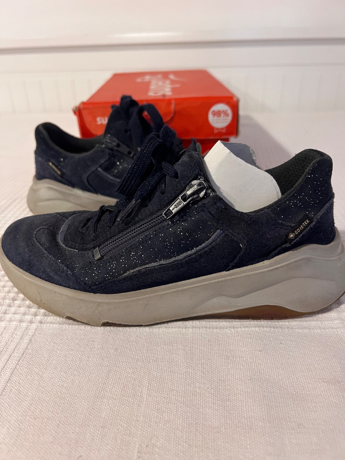 Kvalitné tenisky z brúsenej kože, so šnúrkami a zipsom na boku. Gore-tex úpravou. Pravidelne impregnované.