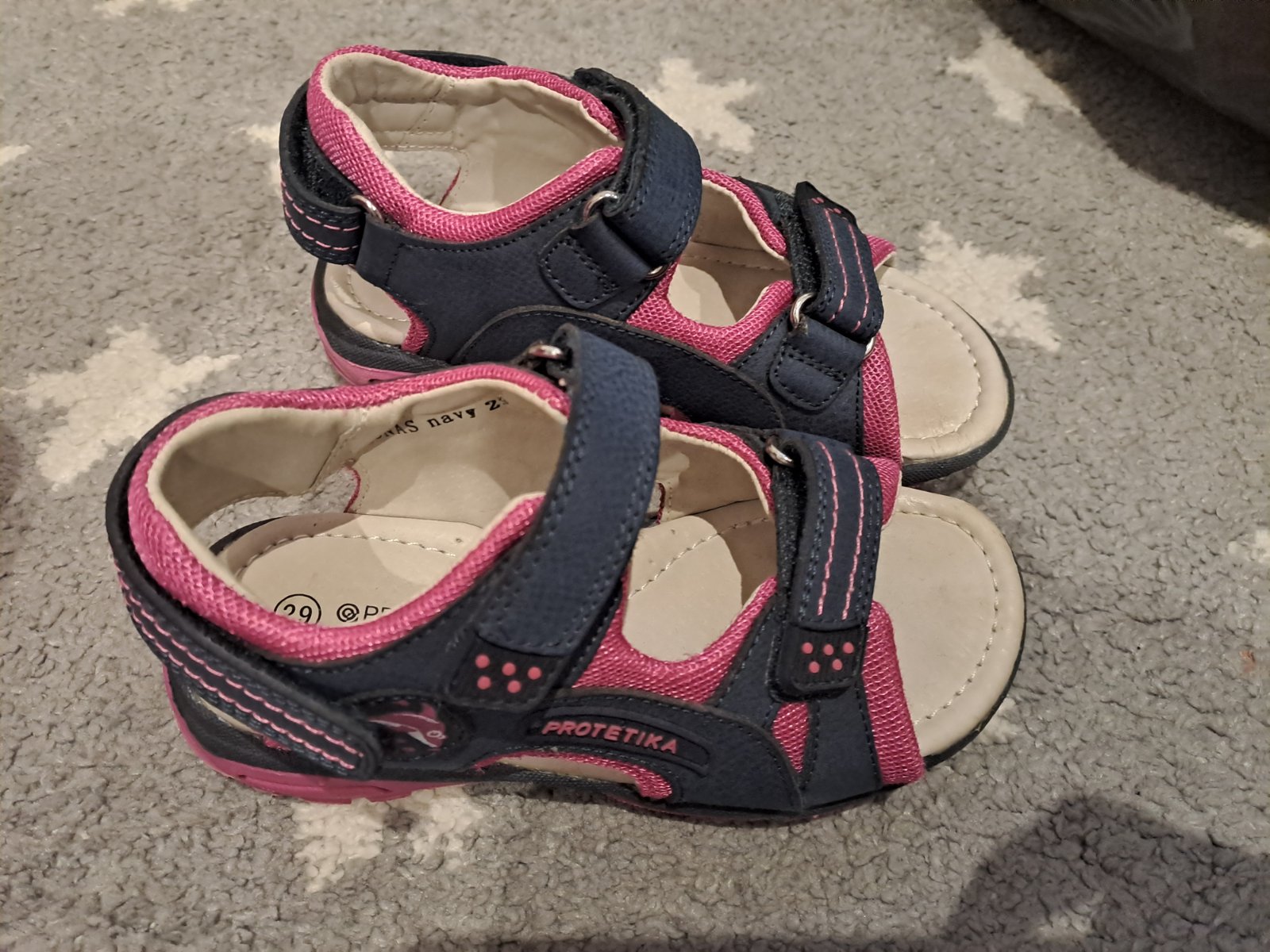 Predám dievčenské sandálky zn. Protetika, nosené cca 3 mesiace iba ako prezuvky do škôlky. Veľkosť 29, ale bolo to skôr na nožíčku č. 28. Vnút. dĺžka 16.5 - 16.7 cm. Opotrebovanie podľa fotografií.