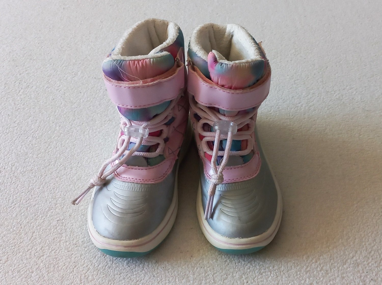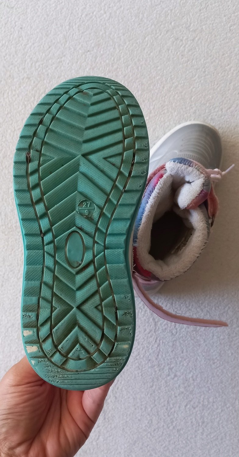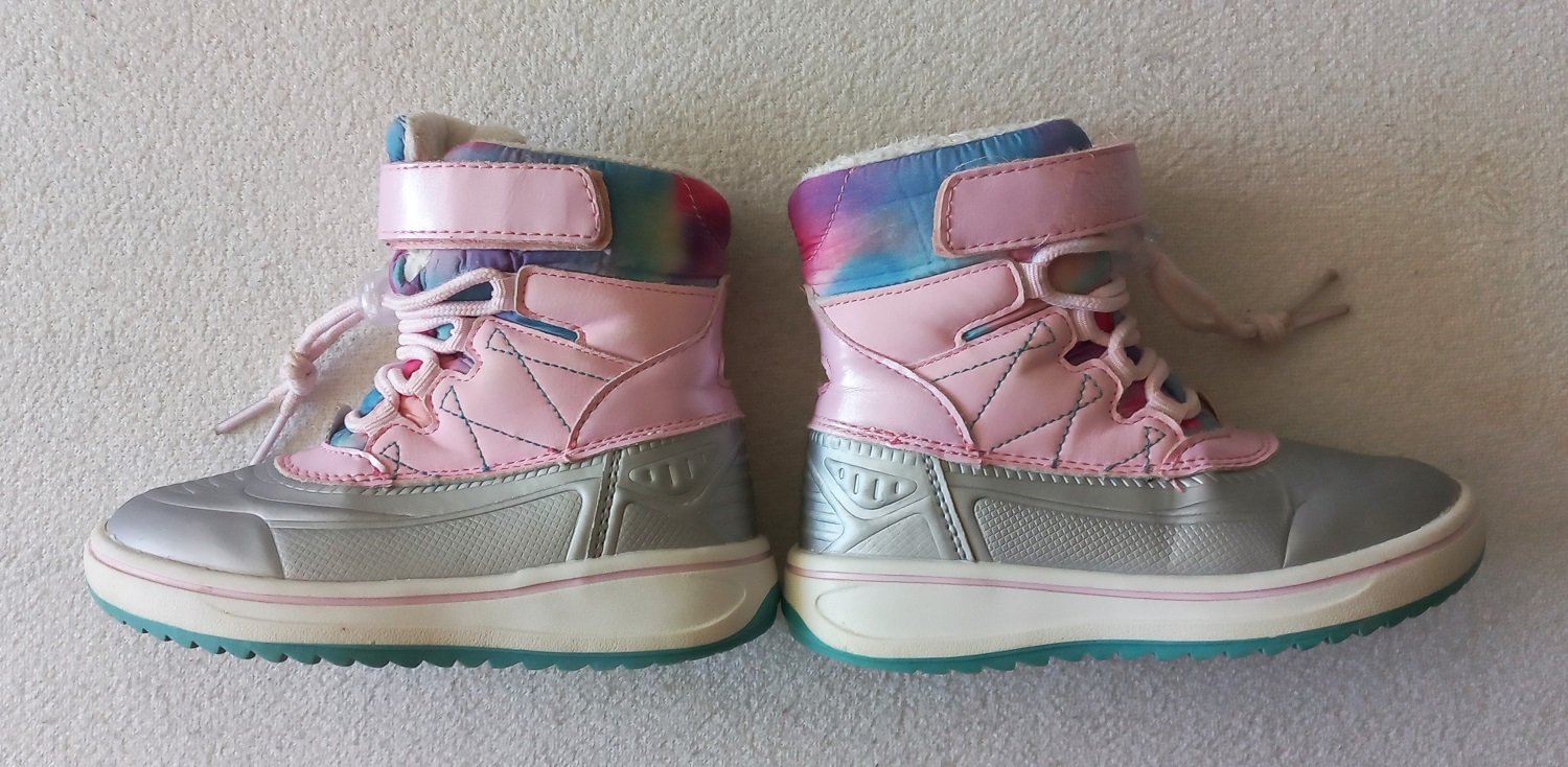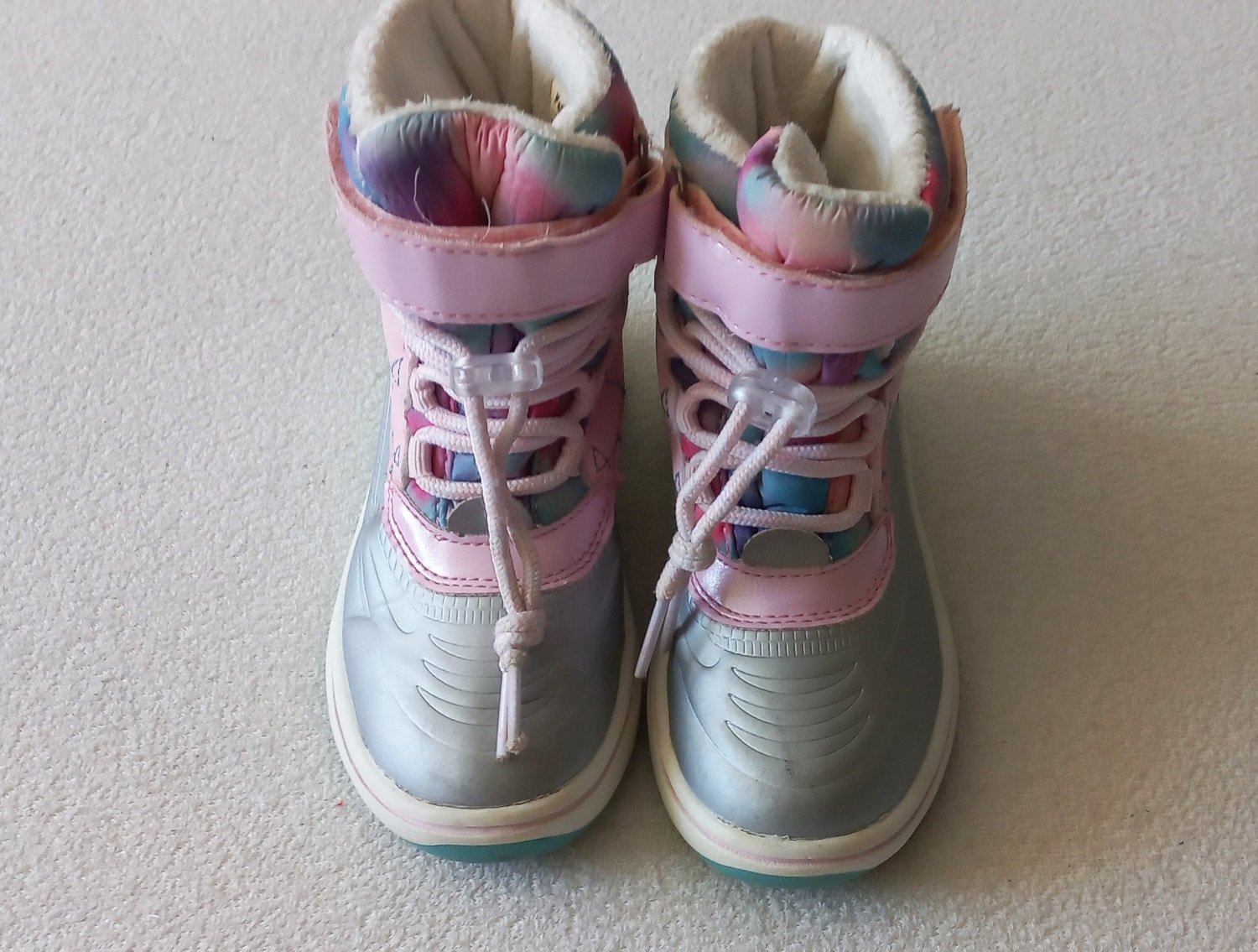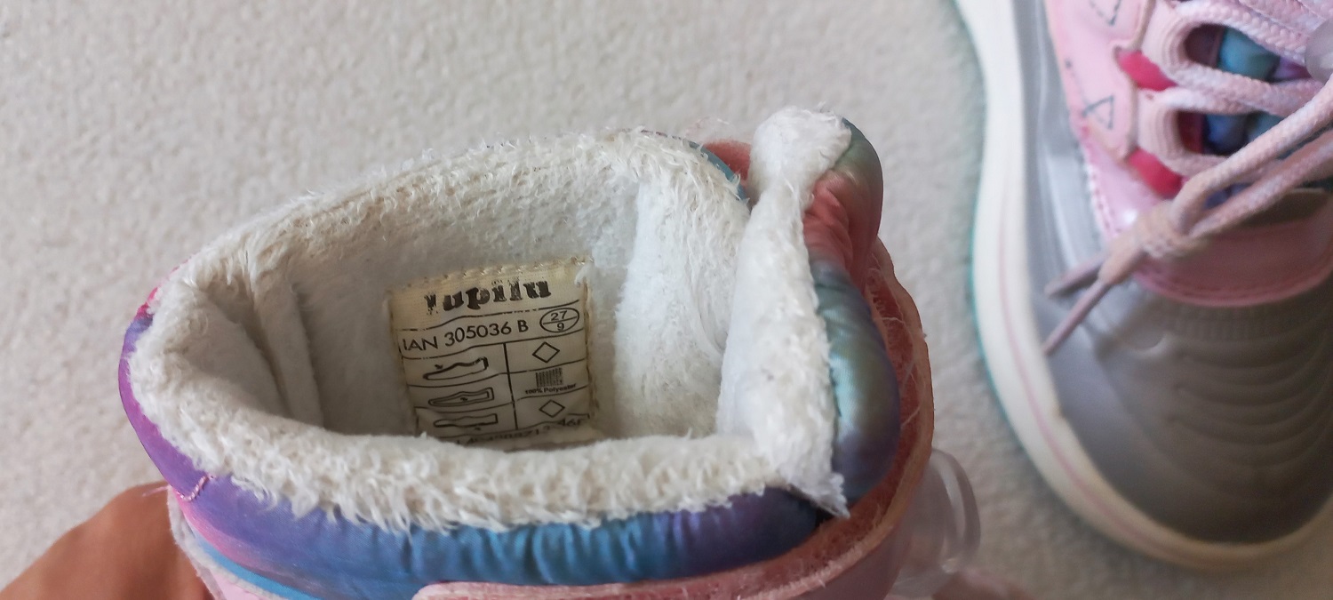 Ružovo-strieborné zimné topánky, veľkosť 27, značka Lupilu. Nosené jednu zimu, vidieť nosenie, žiadne vážne poškodenie. Vnútorná dĺžka je 17 cm, zapínanie na flexibilné viazanie a suchý zips. Máme viacero detských vecí, môžete si zostaviť vlastný balíček. Pri kúpe viac vecí, sa rada dohodnem na zľave.