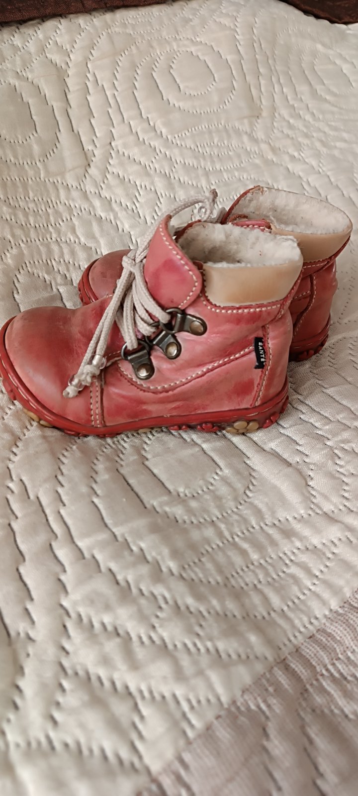 nosené ale zachovalé, nevychodené, kožušinka vo vnutri uz nie je biela a koža na vrchu je ošuchaná vid foto