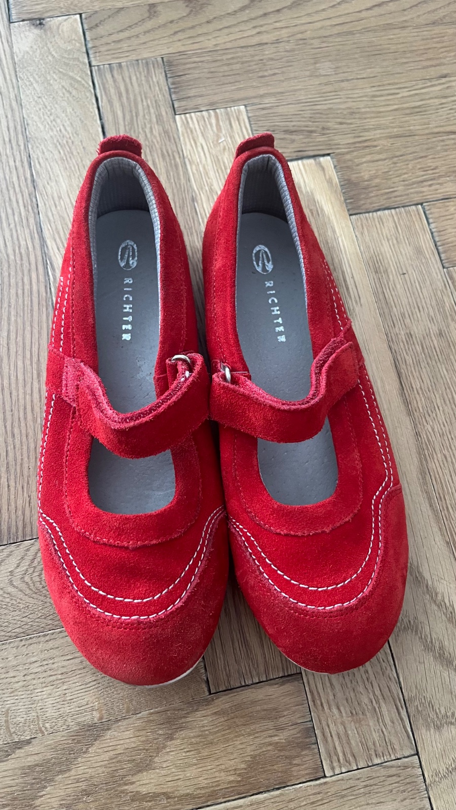 Celoročná obuv po mojej dcere, nikdy neboli prane su jemne cistené, stále mäkké, brúsená koža, tehlovočervena farba. Mäkká podrážka, neschodena, dĺžka vložky je 22,5 cm. Cena+pošta