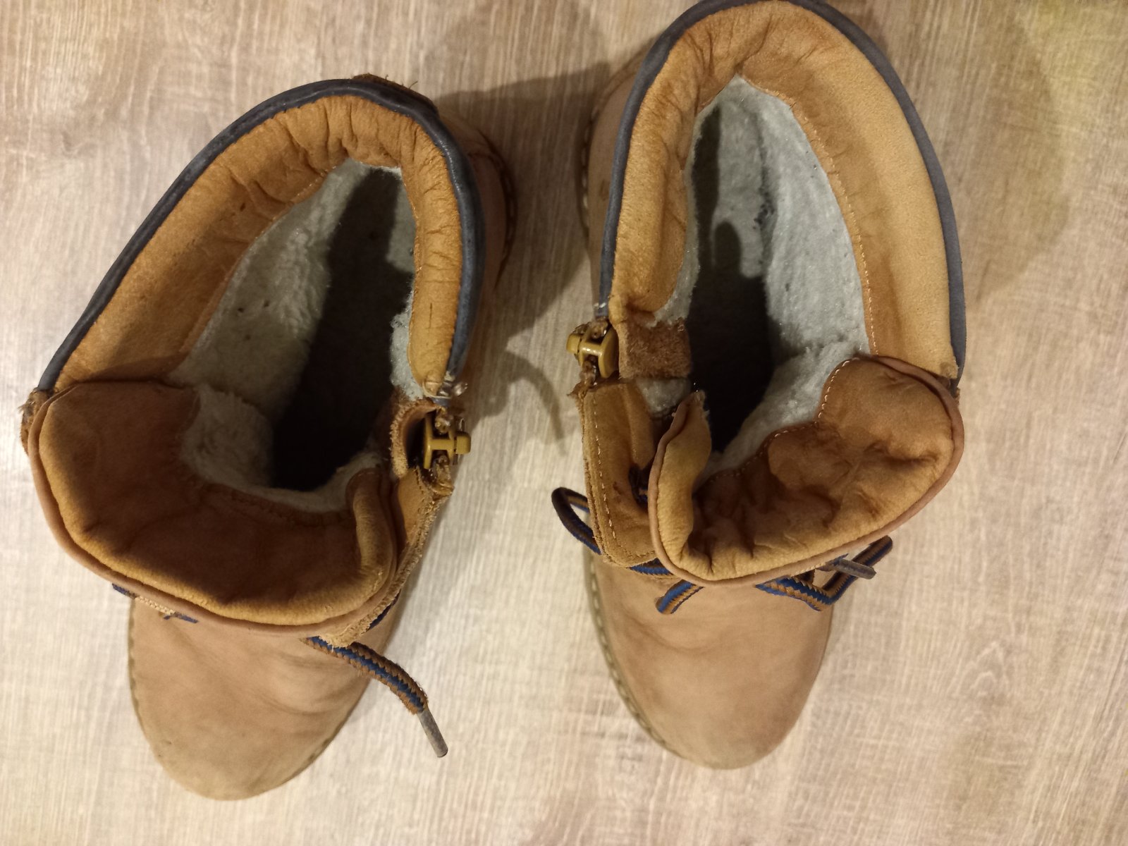 kožené, zateplené ovčou kožušinou, vpredu jemné šuchnutia, nič hrozné, farba je skôr modrošedá, VD 22,5cm