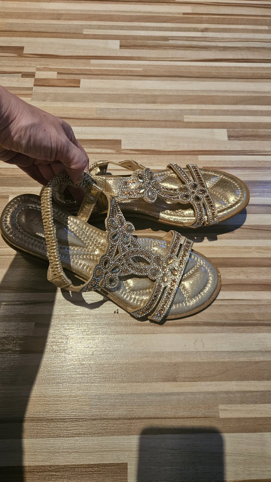 Zlate lodicky s flitrami, obute 1x. Vnut. dl. 26-26,5 cm.