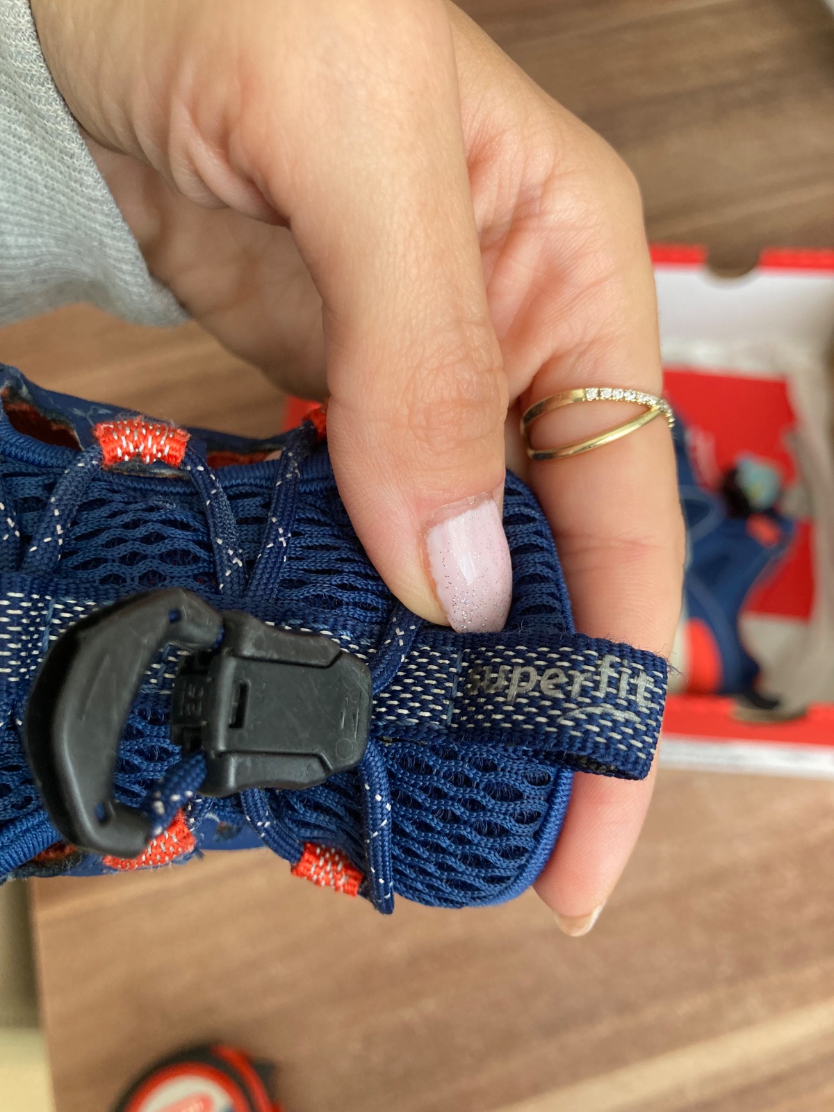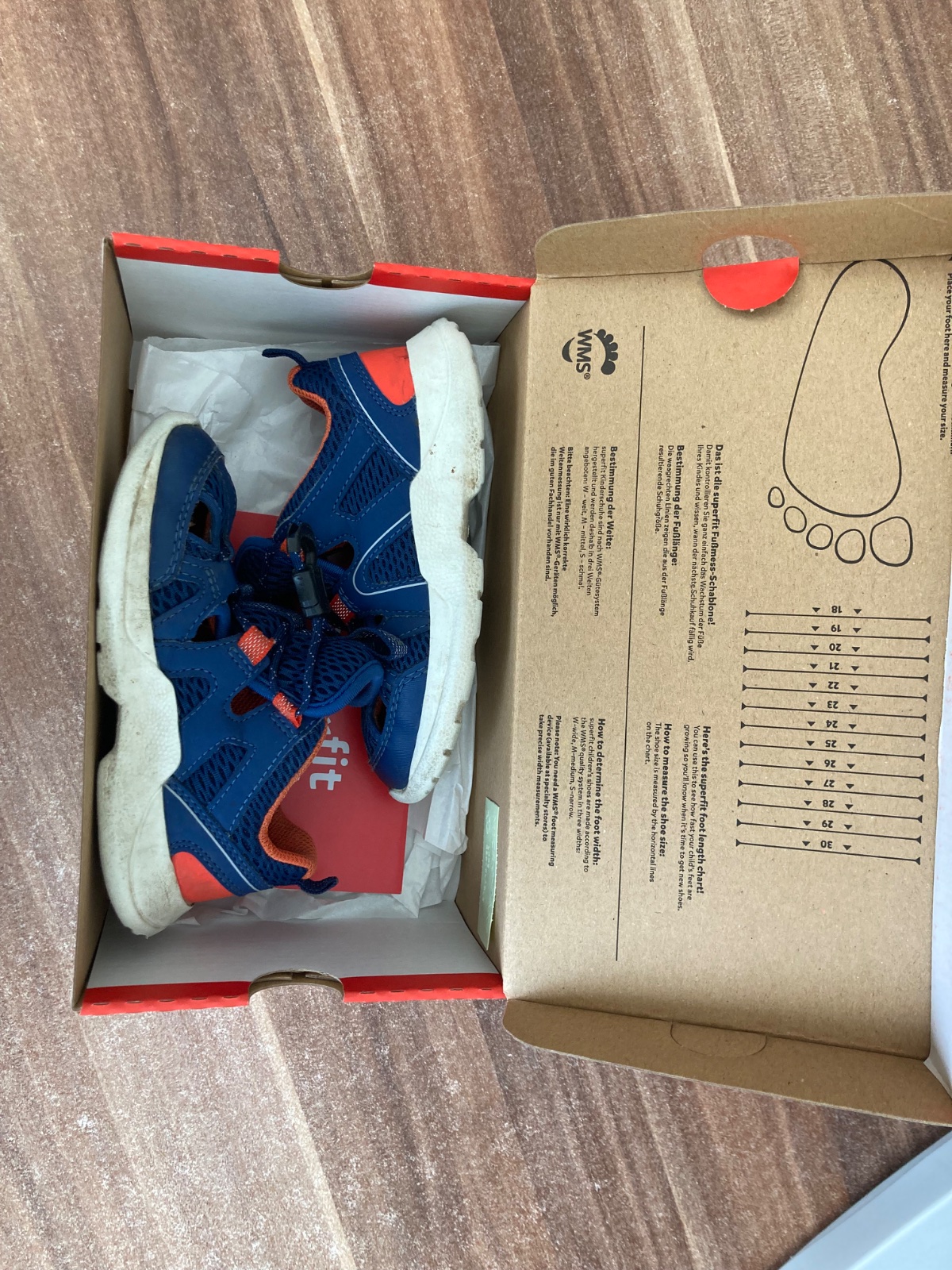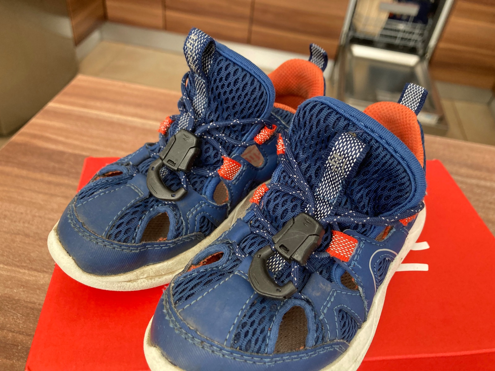 Kvalitné sandálky z brúsenej tmavomodrej kože s kontrastnou oranžovou a bielou farmou. Na suchý zips. Používané ako prezuvky v škôlke.