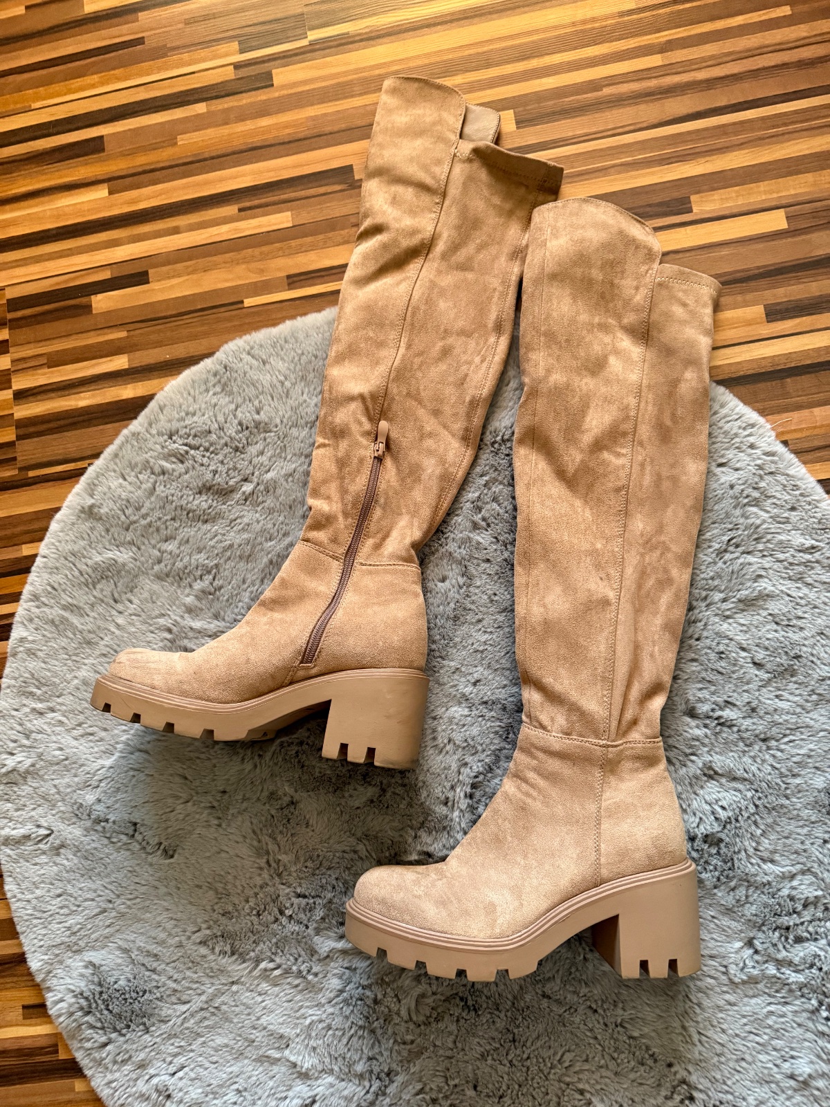 Predám 2 krát obuté pohodlné hnedé semišové čižmy nad koleno. Veľkosť 39. Pôvodná cena 40€. Značka Deezee.