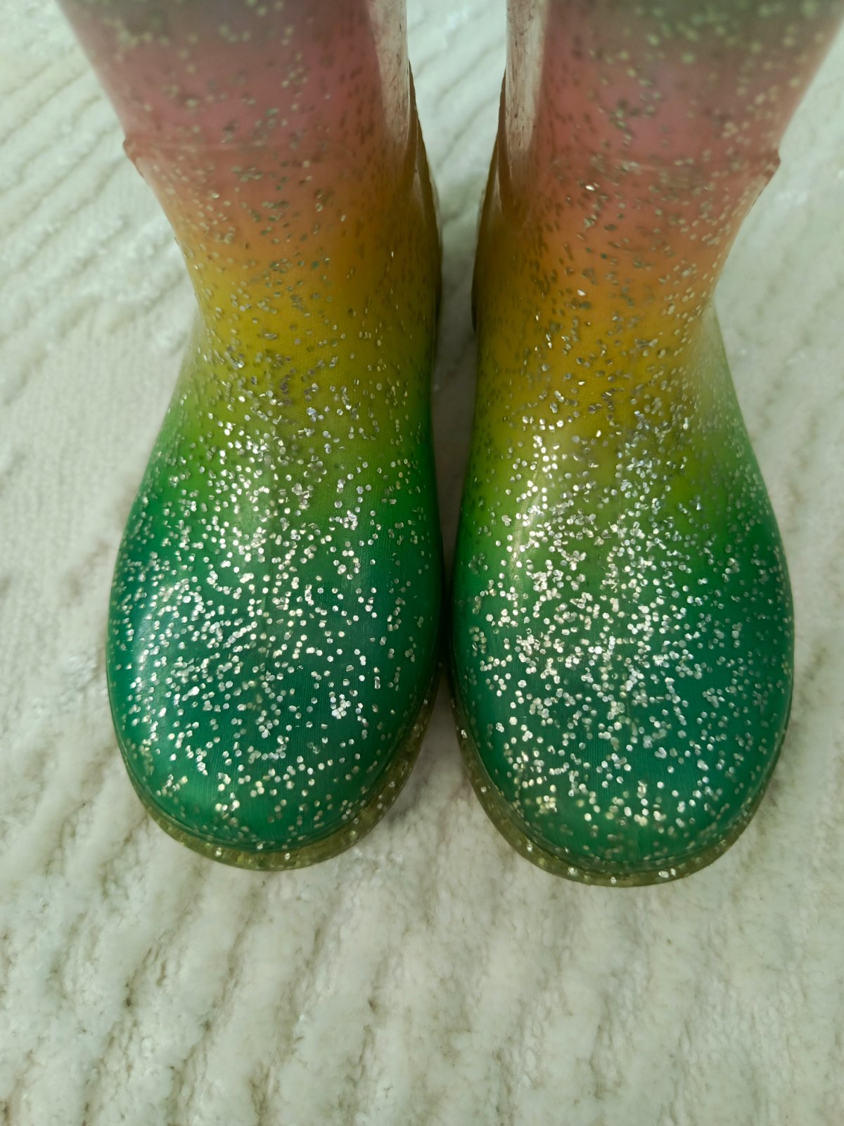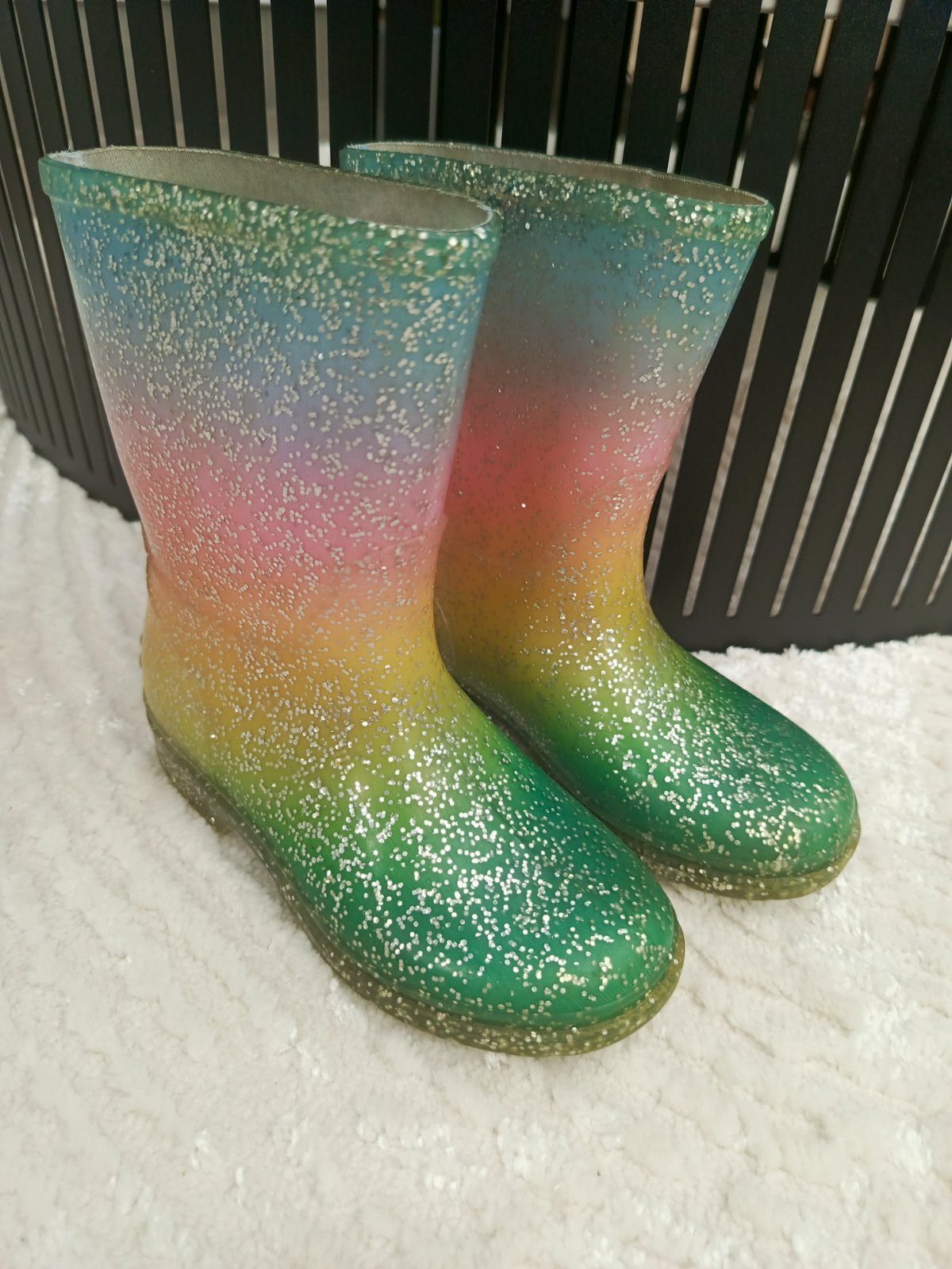 Nenosené, trošku zazlknute dievčenské gumáky. Vnútorná dĺžka 17cm. Poštovné: podľa sadzobníka Slovenskej pošty