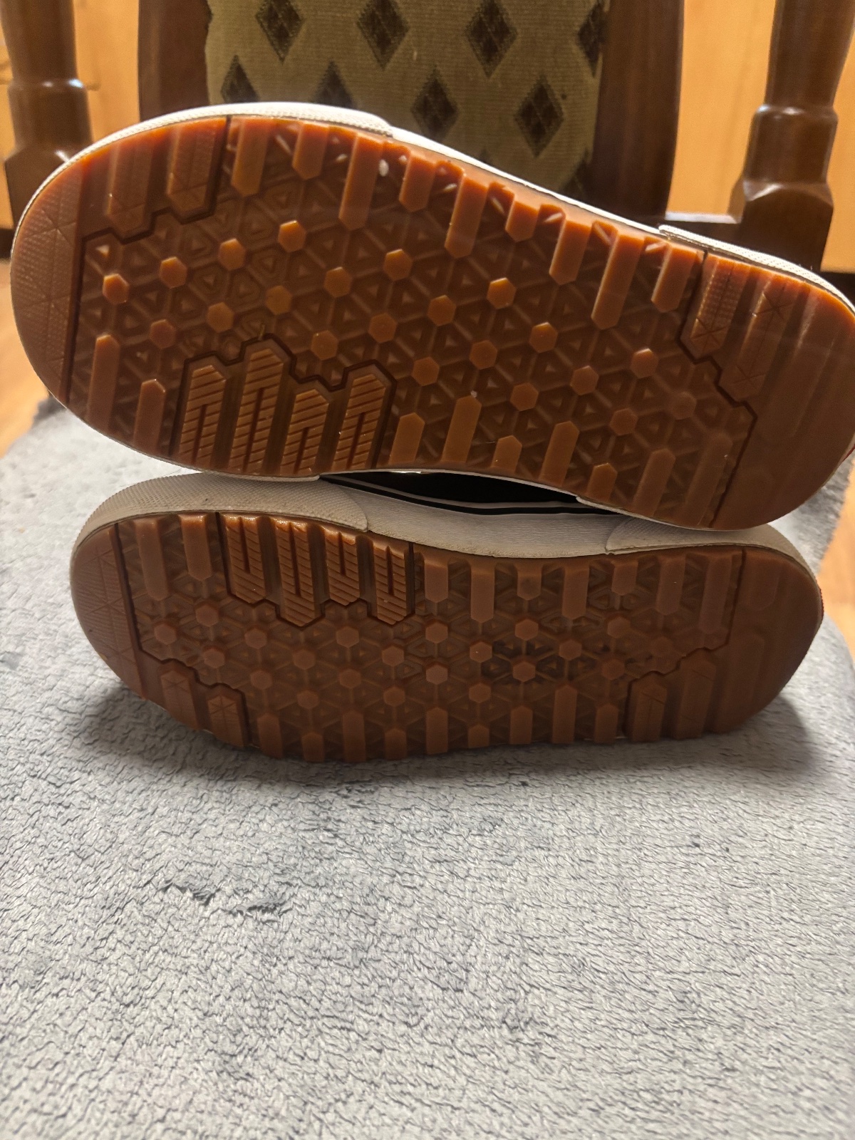 Zateplené topánky z brúsenej kože. Sú v dobrom nosenom stave, akurát zo zipsou vypadali niektoré zúby, tak že my sme ich už iba nasúvali. Poškodenie je prispôsobené cene.