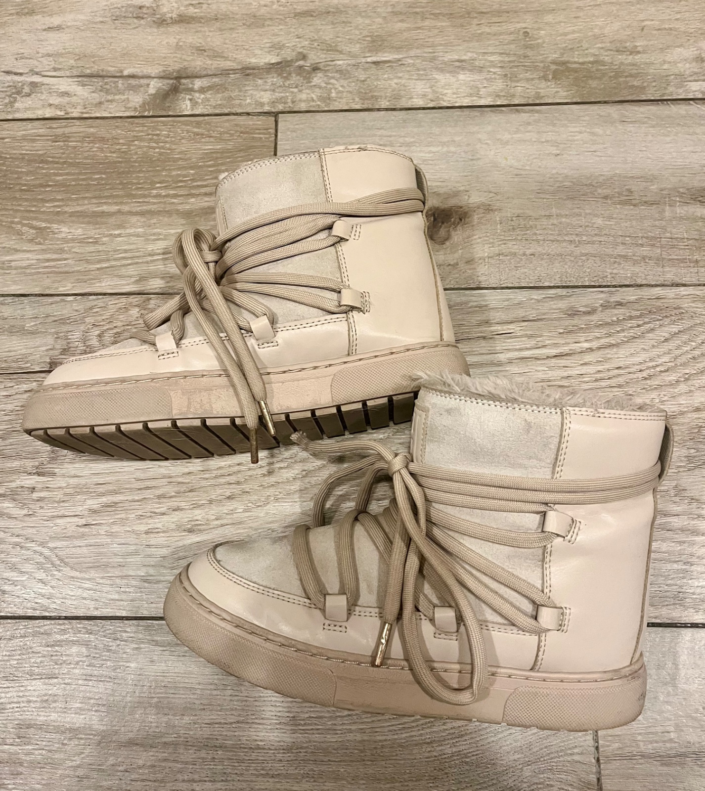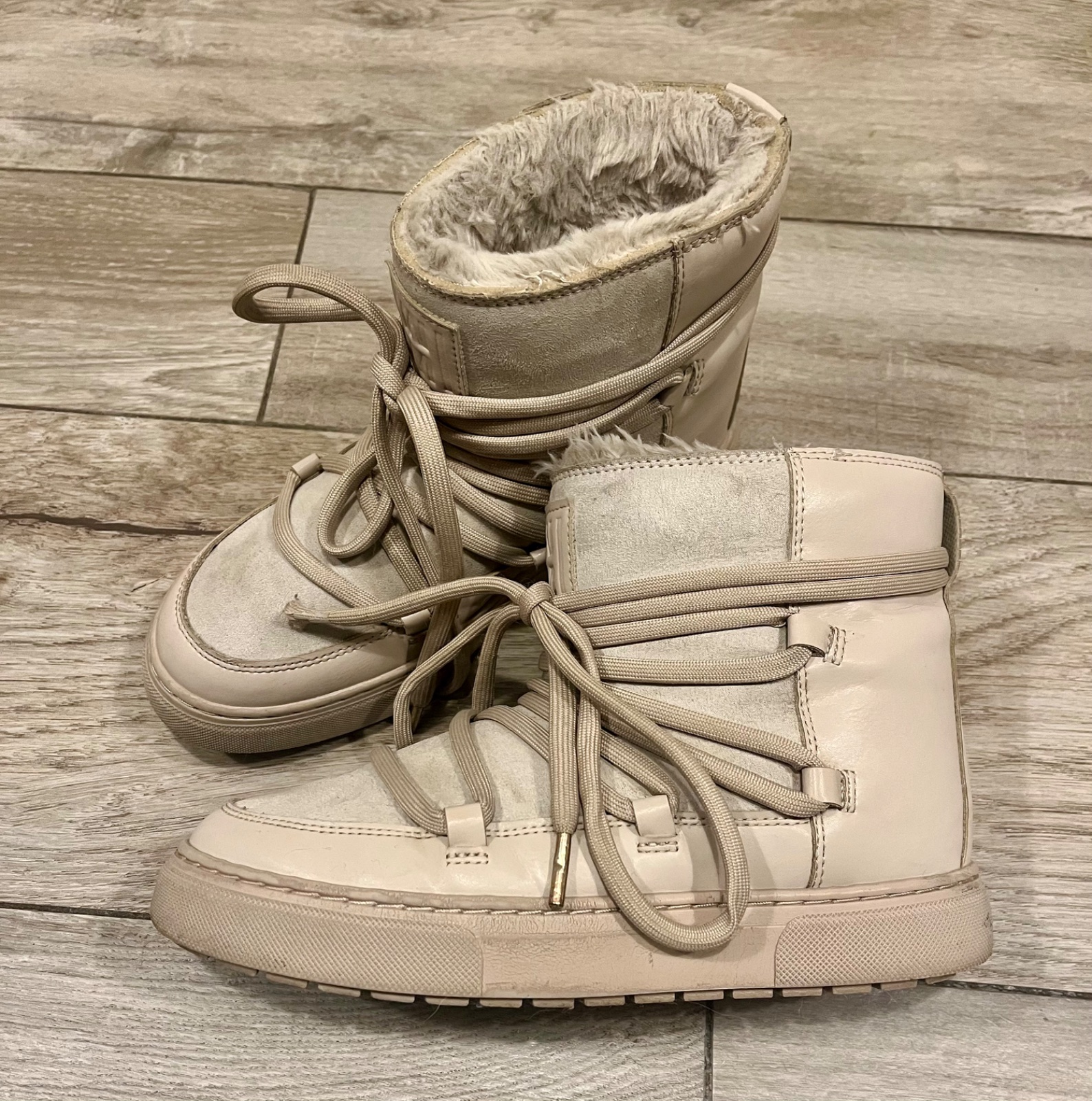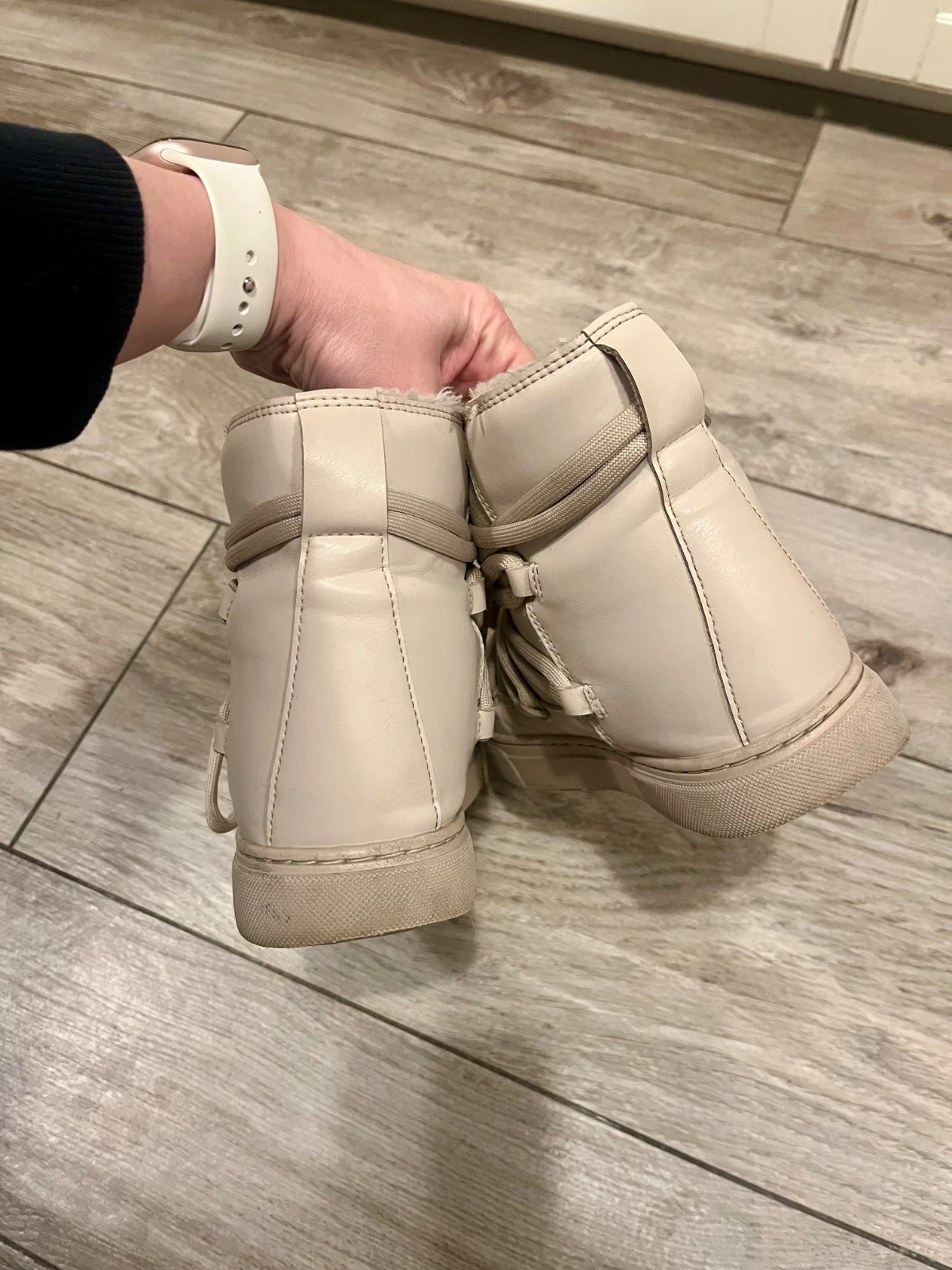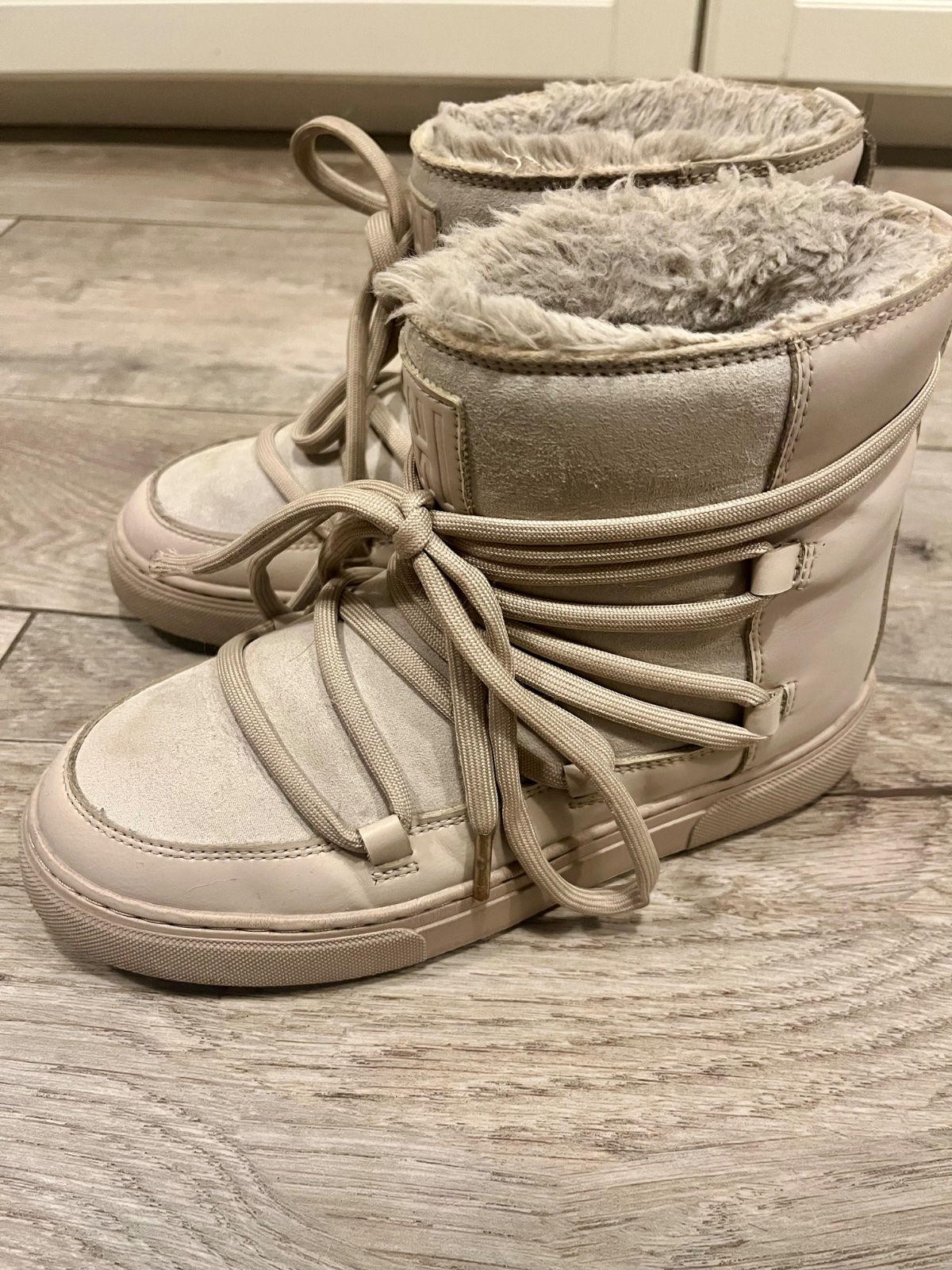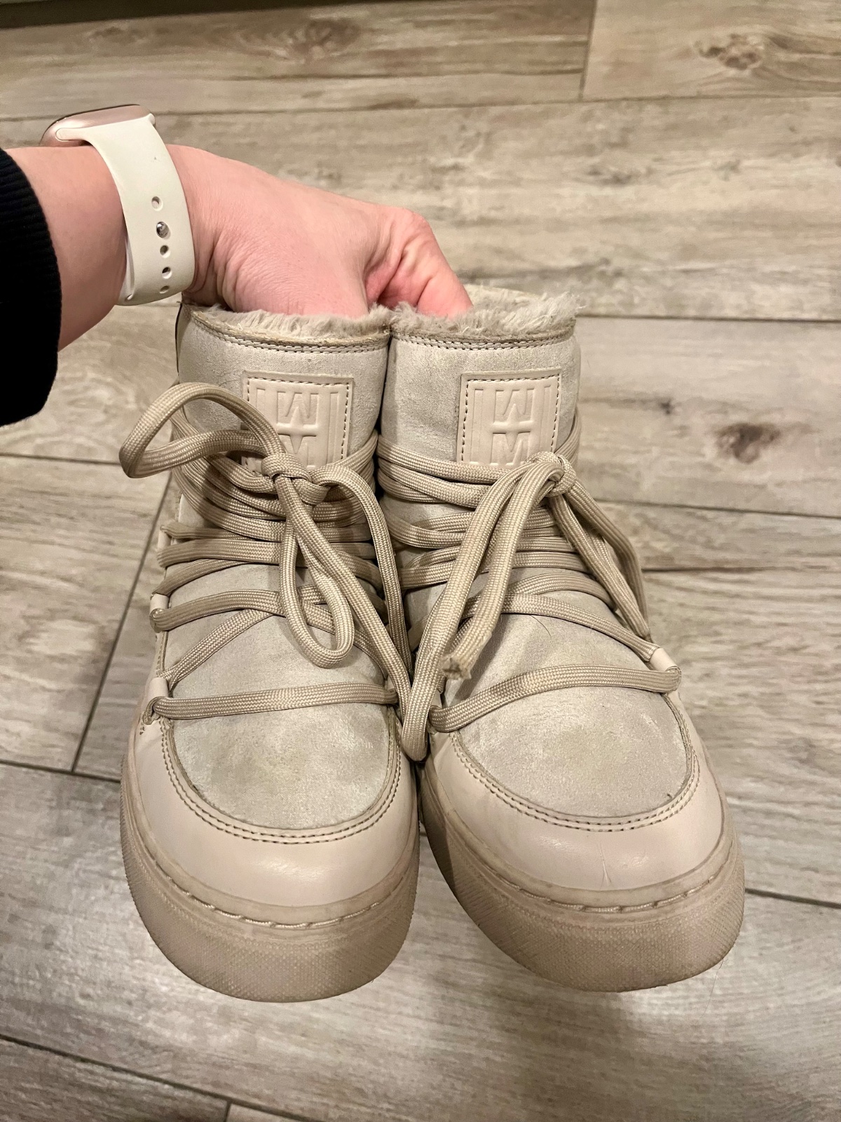 Predam nepremokave snehule kremovej farby. Nosene jednu sezonu, dcerka ich uz zial vyrastla. Jedina chybicka krasy je chybajuca kovova koncovka na jednej zo snurok v topankach, inak super stav. Vnutro vyteplene kozusinkou.