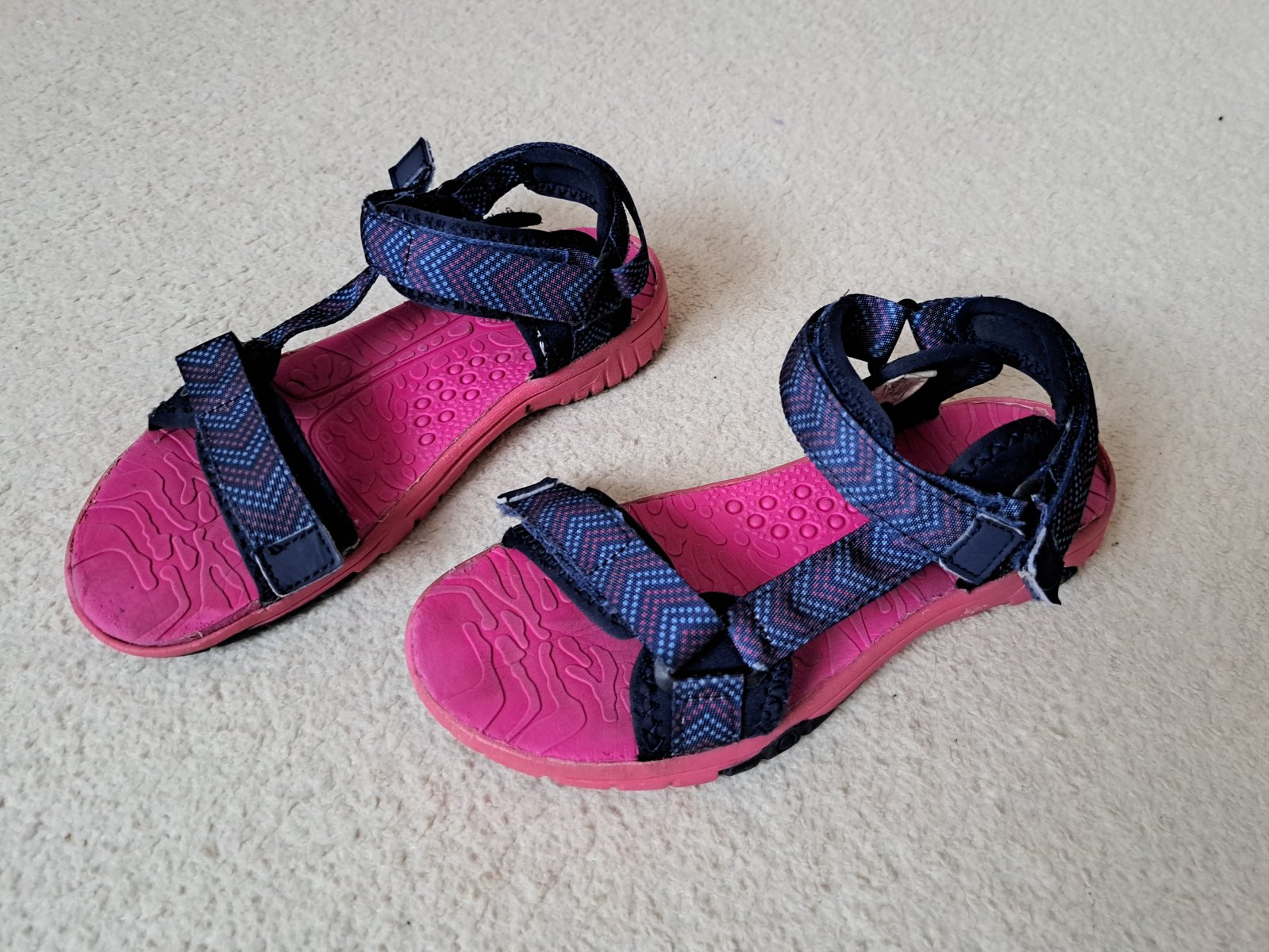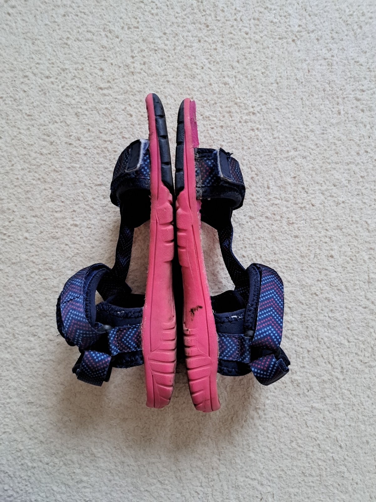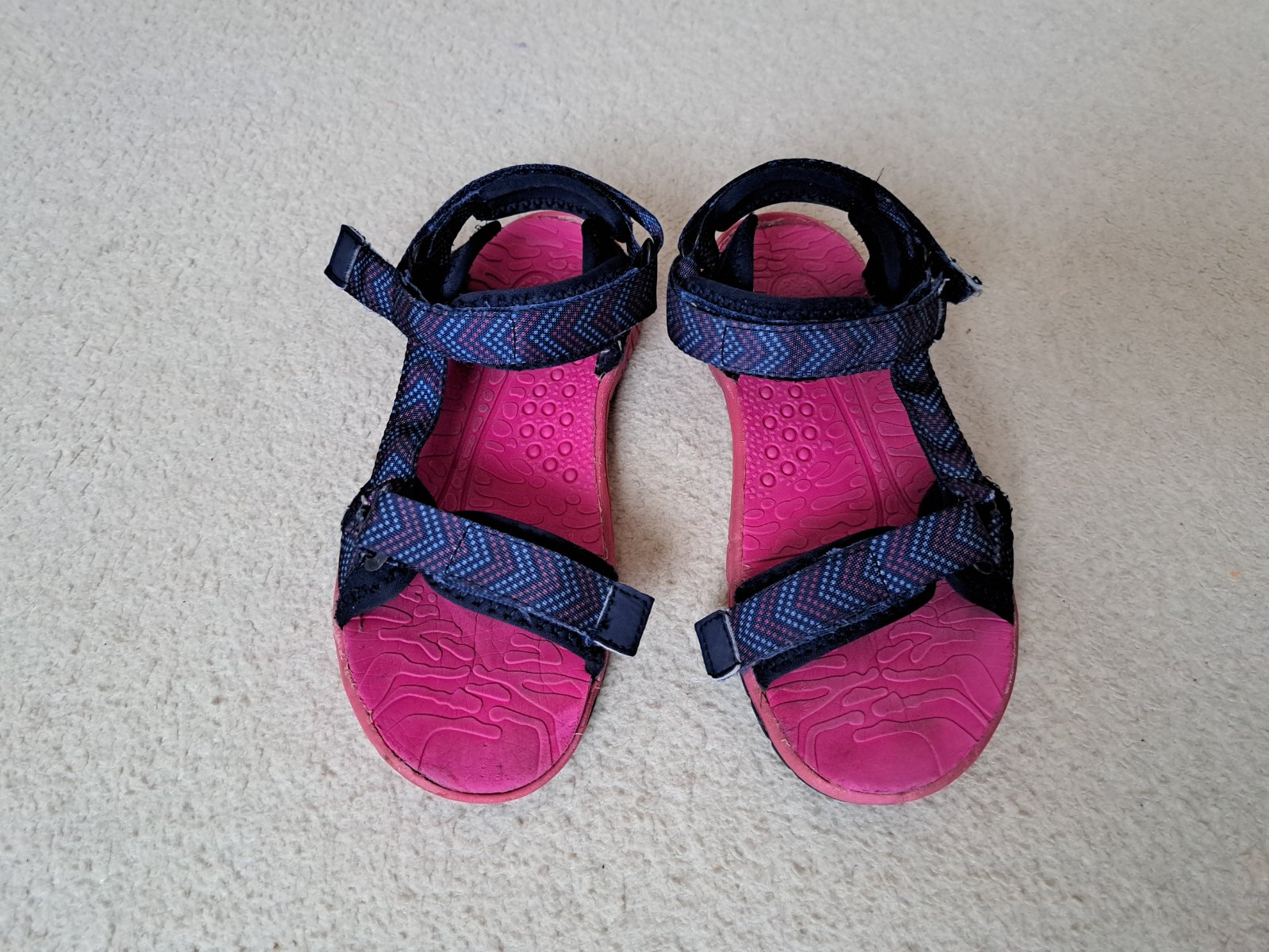 Turistické sandálky pre dievča, zn. Crivit. Veľkosť písaná 36, ale sedia skôr na 37. Vnútorná dĺžka 24 cm. Pohodlné - nastaviteľné cez suchý zips na pásoch ponad priehlavky, vzadu nad pätou aj okolo členkov, ohybné. Zipsy pevne držia - dobre poslúžili svojmu účelu. V nepoškodenom nosenom stave.