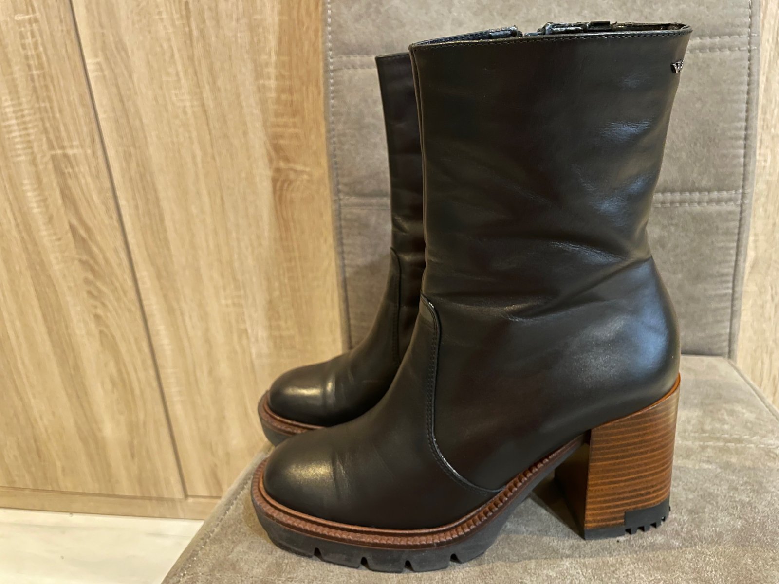 Predám krásne kožené čižmy na vysokom drevenom opatku zn. Wojas. Boli nosené len párkrát príležitostne. Sú v super stave, len menšie známky nosenia.