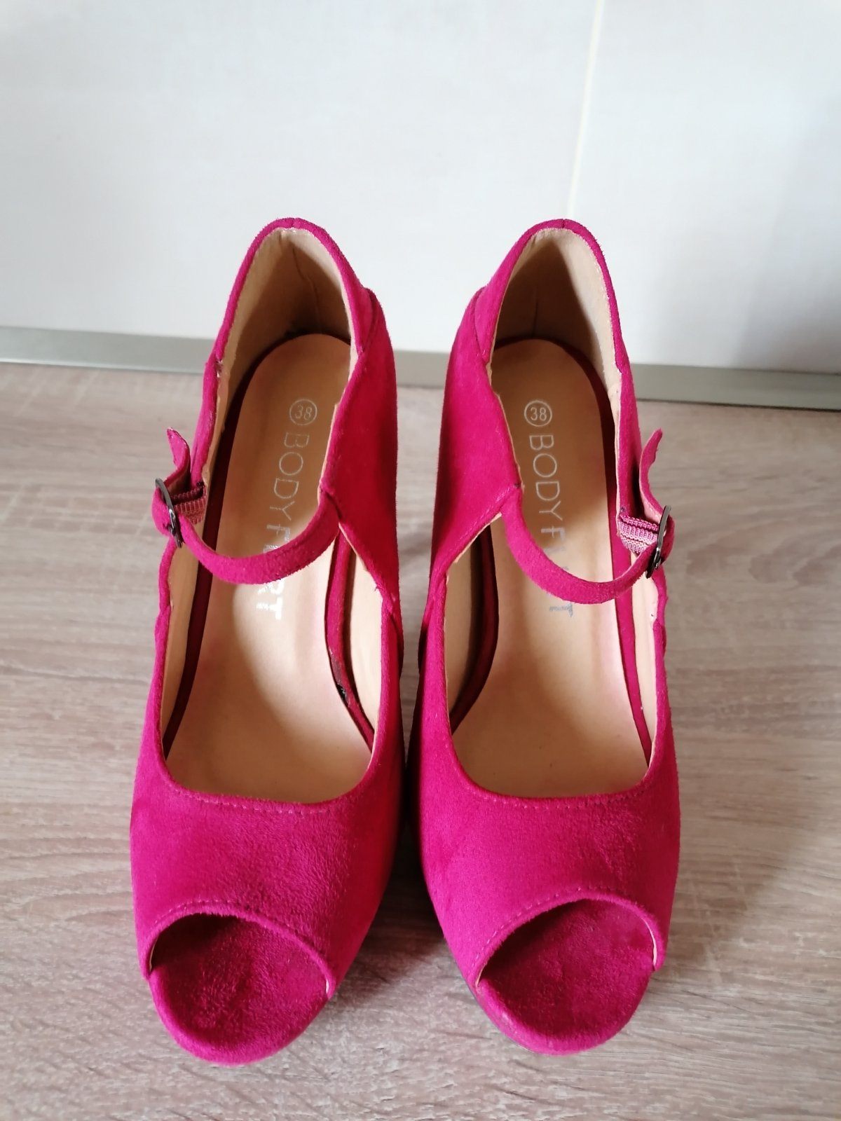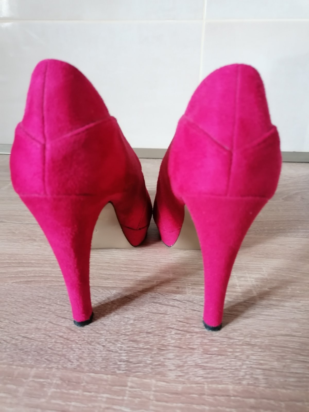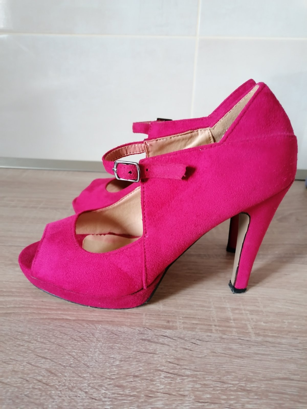 Krásne vysoké topánky s otvorenou špičkou, materiál niečo ako semiš, farba fuchsiova. Použité len 1x, kde-tu majú šuchnutie, ale vidno len pri detailnejsom pozretí. Opatok celkovo 10,5 cm približne, vpredu platforma 2 cm.