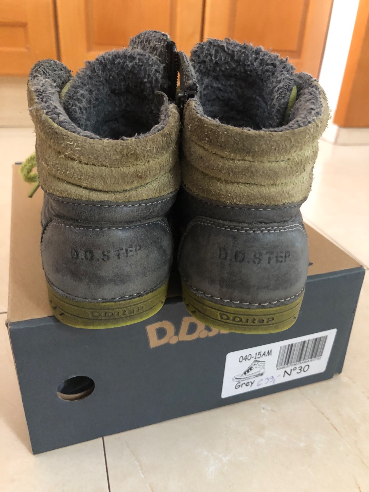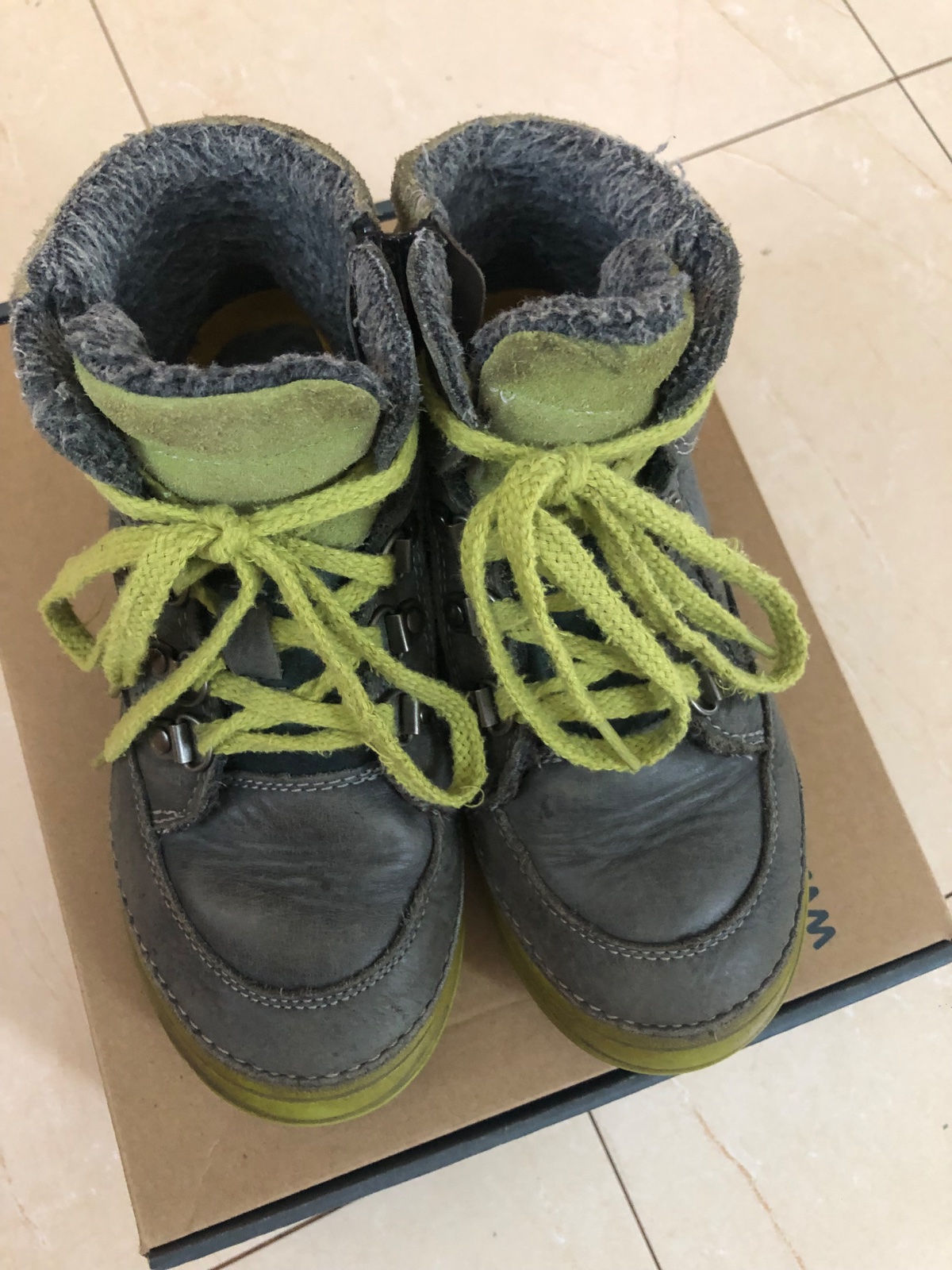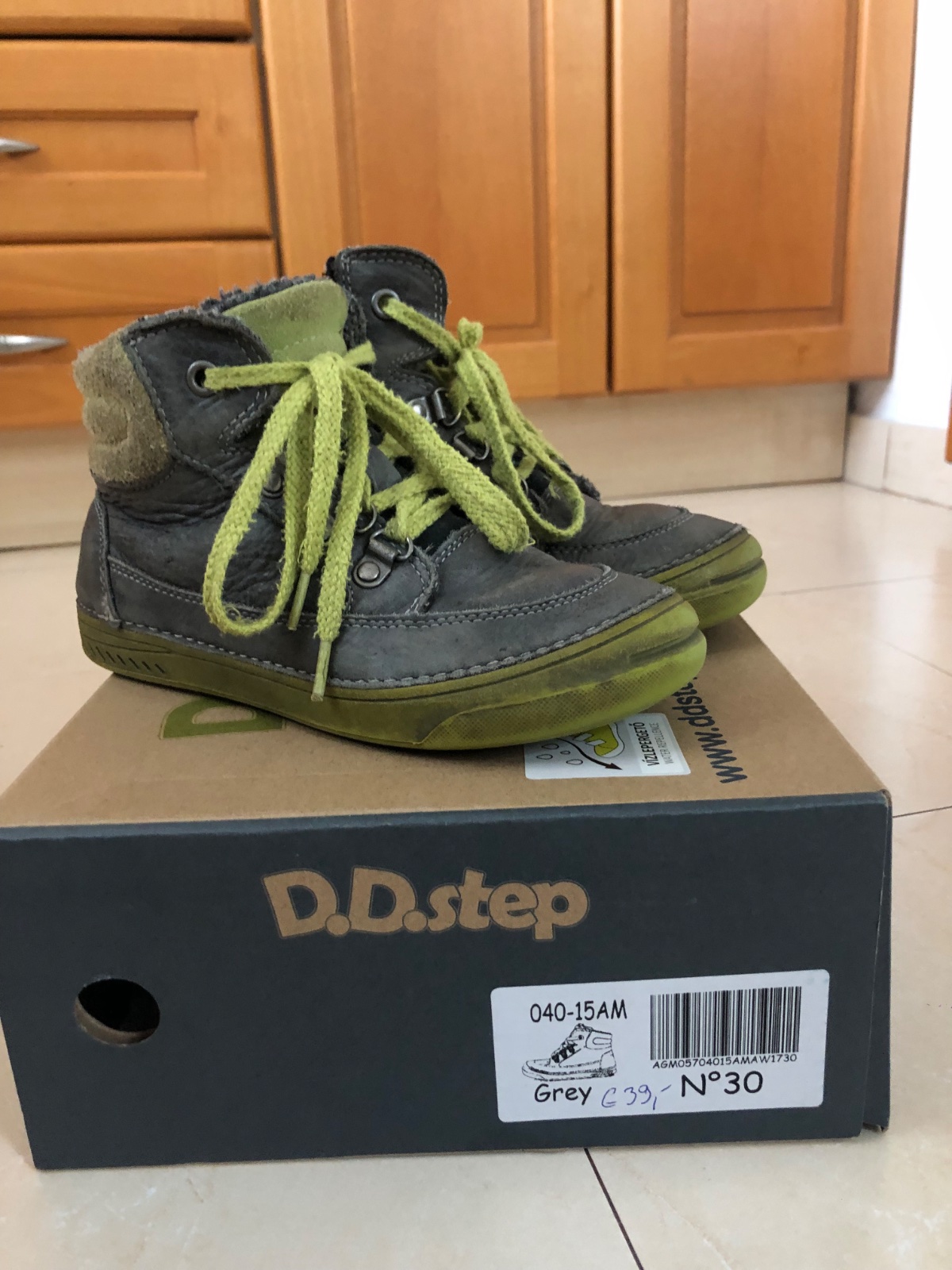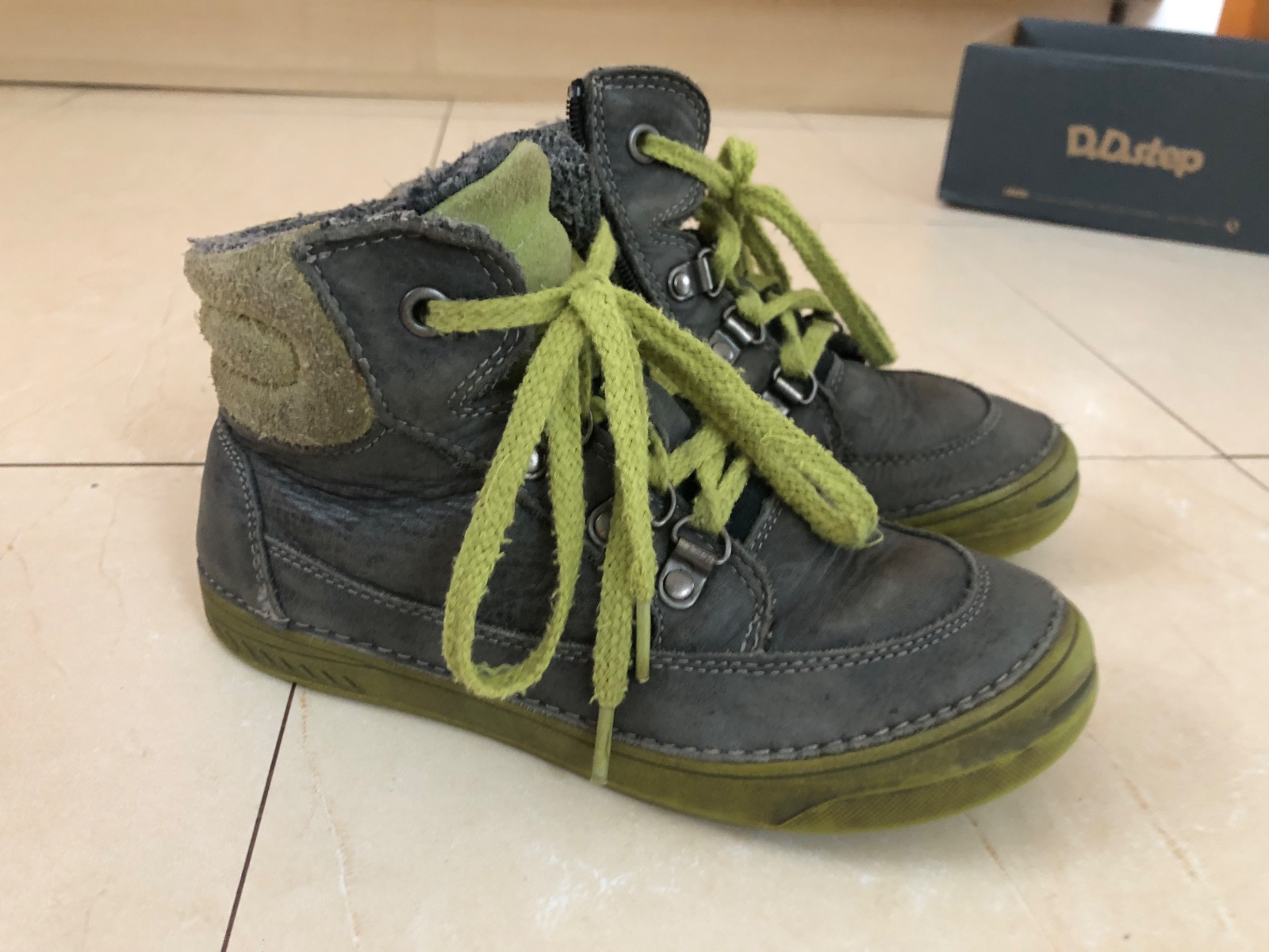 Predám nosené topánky Ddstep po jednom dieťati, zateplené, vhodné do suchej zimy a chladnej jesene. Bežné známky nosenia. Sú celokožené, je to akoby brúsená koža. Zelená podrážka vyzerá ako keby bola špinavá, ale je to tak od nova (špinavý efekt)🙂.