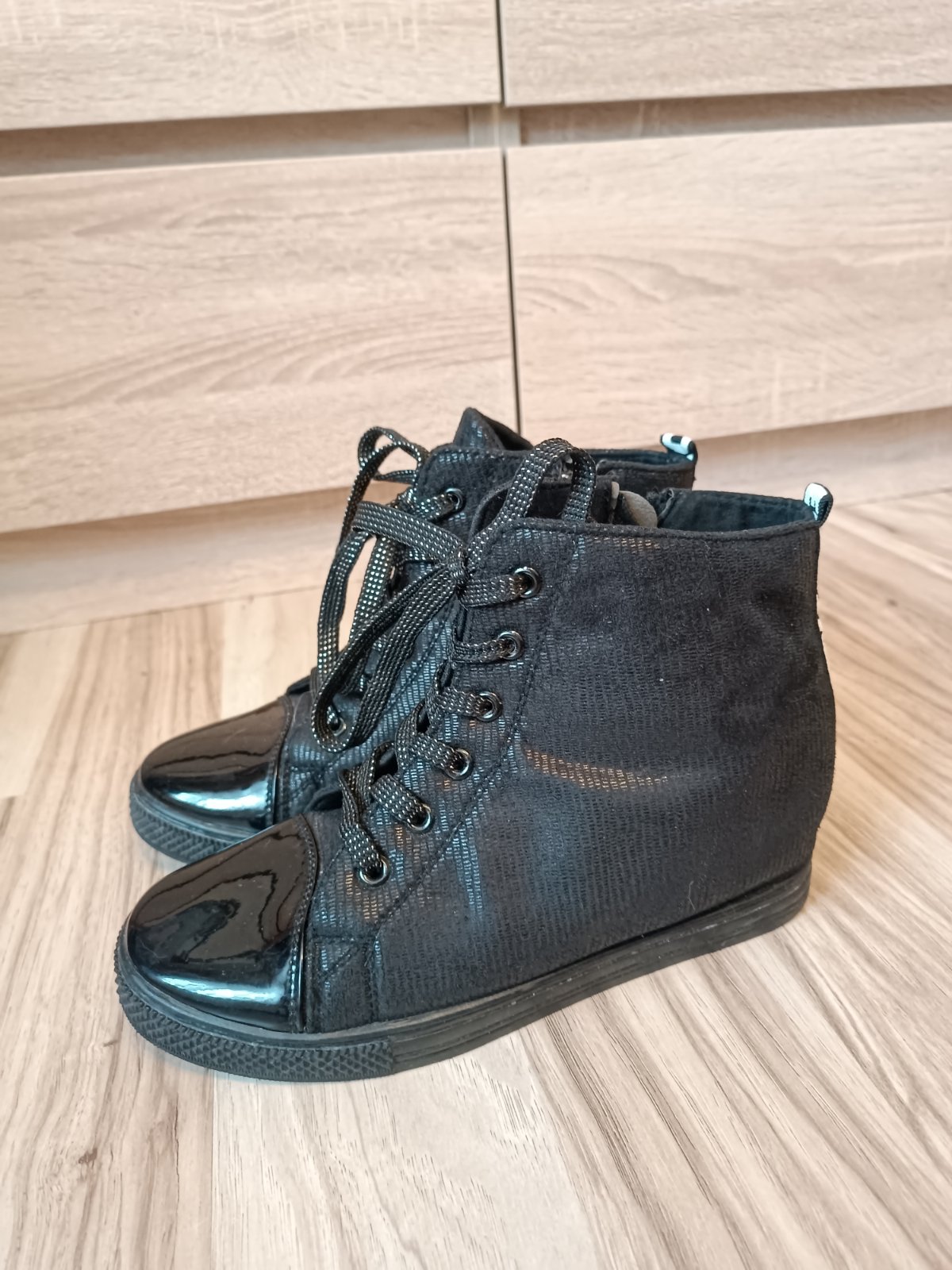 Predám dámske čierne členkové tenisky v modernom, mierne extravagantnom štýle.