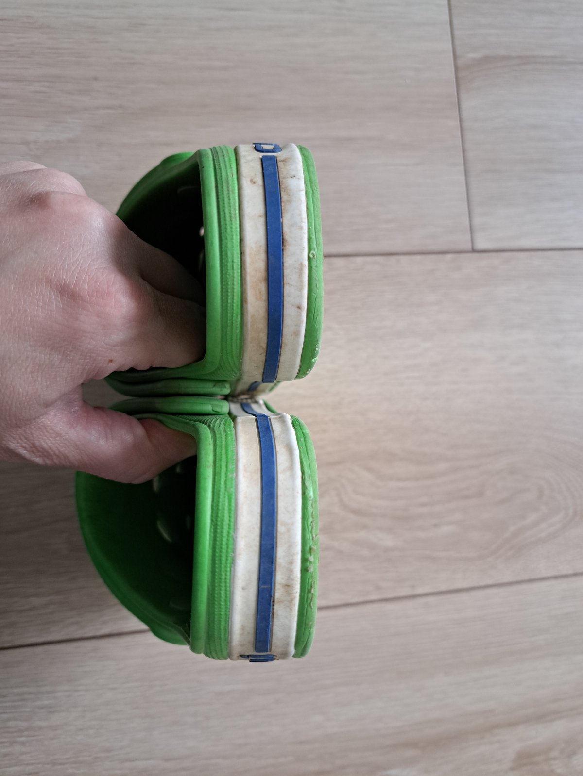 Posúvame nosené kroksy len ako domácu obuv. Je to veľkosť 26/27 a biele píše 28 ale sú zhruba rovnaké. Asi 17 cm po ohyb päty. Coqui majú poškodené ozdoby smajlíkov, jeden chýba a druhému chýbajú o...
