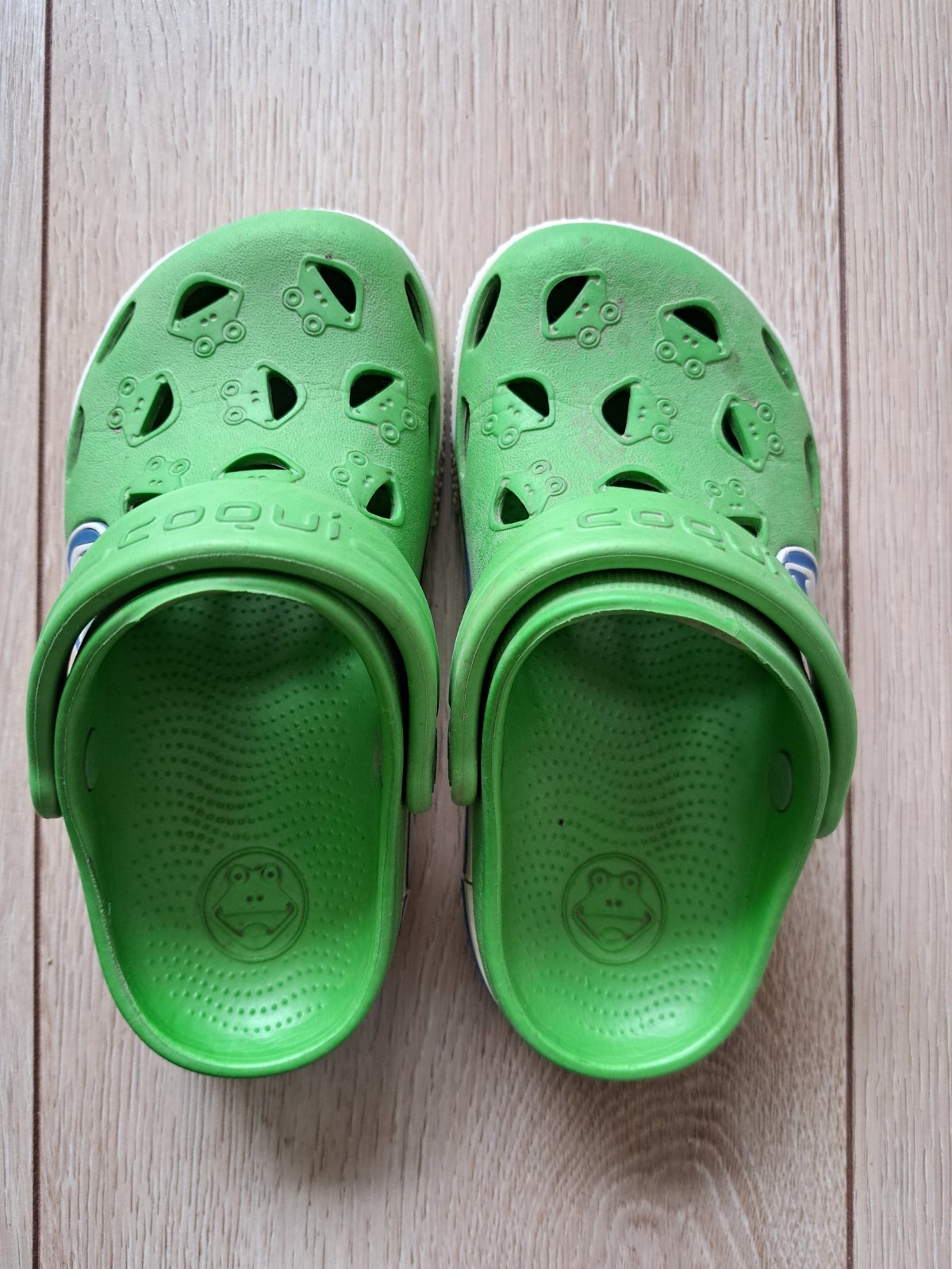 Hráškovozelené kroksy kvalitnej značky Coqui. Nohu držia dobre, schodené nie sú ale majú už čo to za sebou. Vhodné na dorazenie na záhradu.