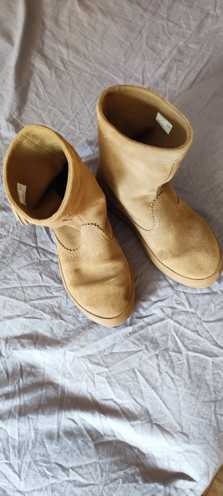 Kozene. Malé fliaciky na čižmách, asi niečím oliate. Moc to nevidno, viď fotky. Je to zohľadnené v cene. Inak ako nové.