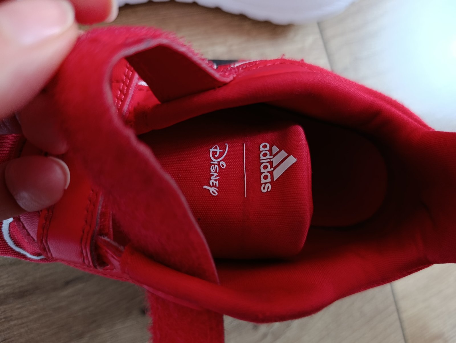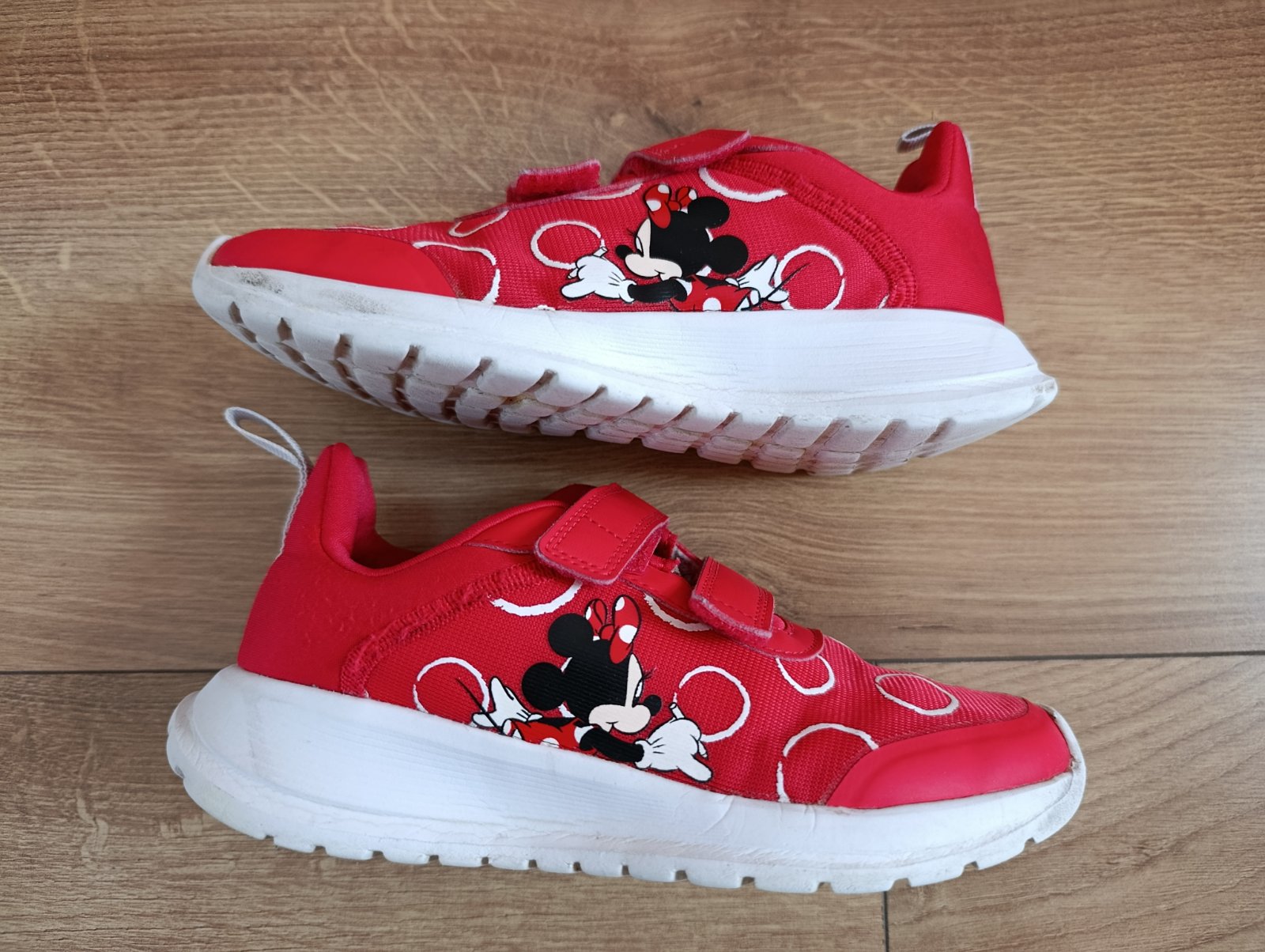Krasne Minnie Mouse Adidas tenisky pre dievca. Trosku sa odlepuje jedna ciarka z boku,inak pekny noseny stav.
