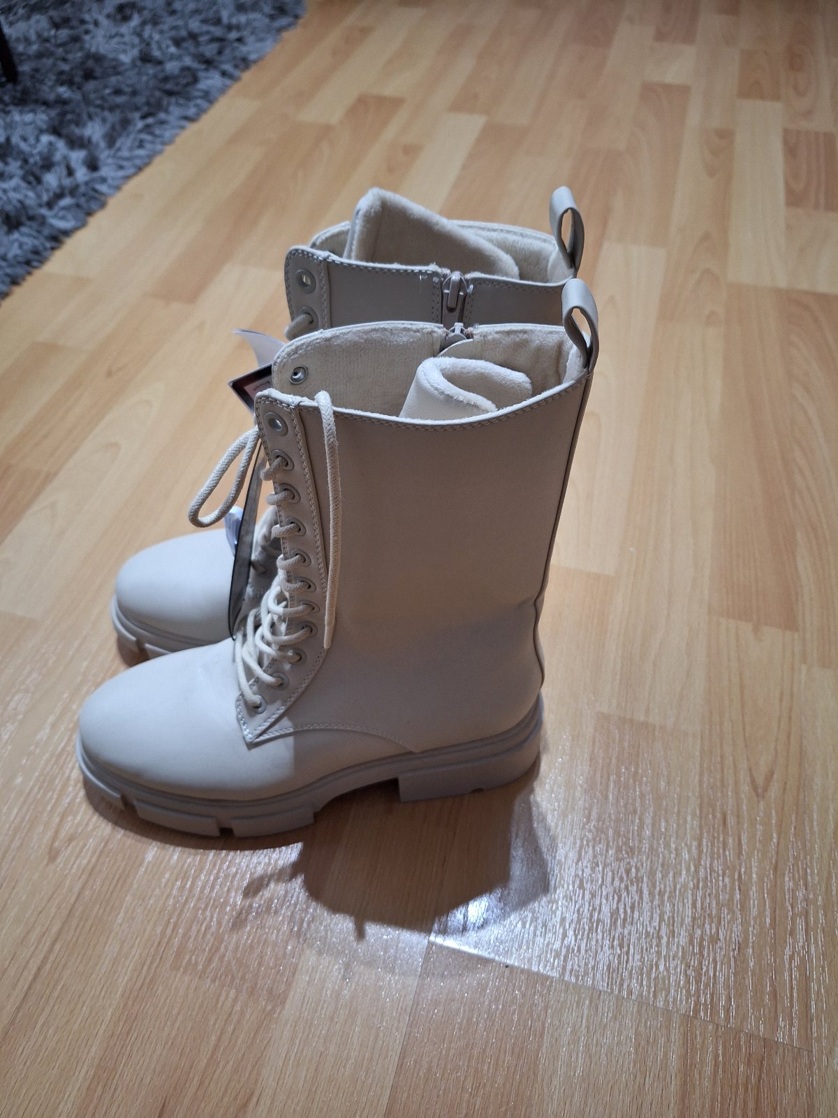 nenosené, bledo hnedé, bežové vysoké čižmy na prechodné obdobie, zips, vpredu pri prihlavku šnurovanie so zlatými doplnkami. Výška podpatku 13,5cm, vyška platformy 3 cm, vnut dl 25,5cm. malý fliač...