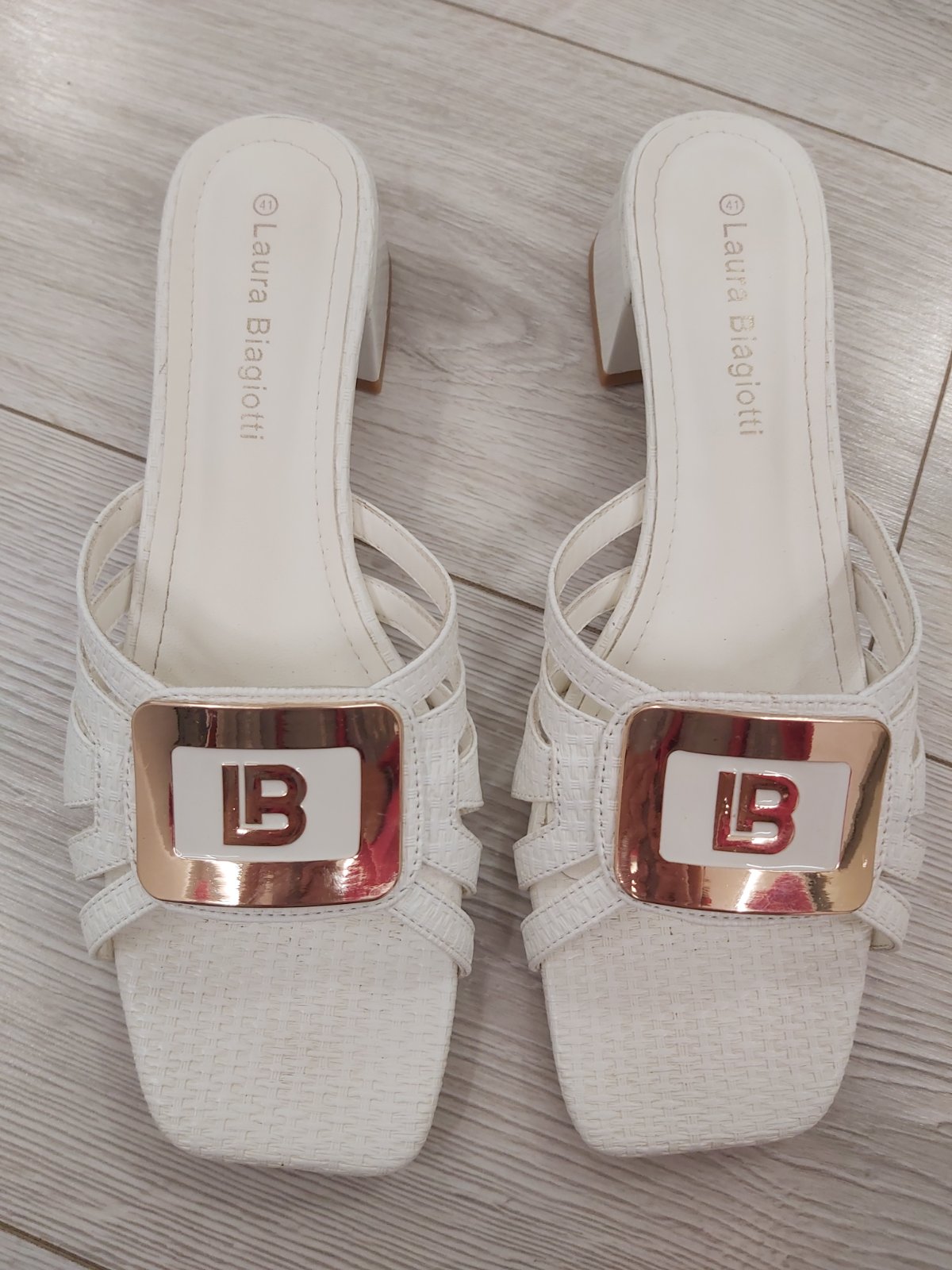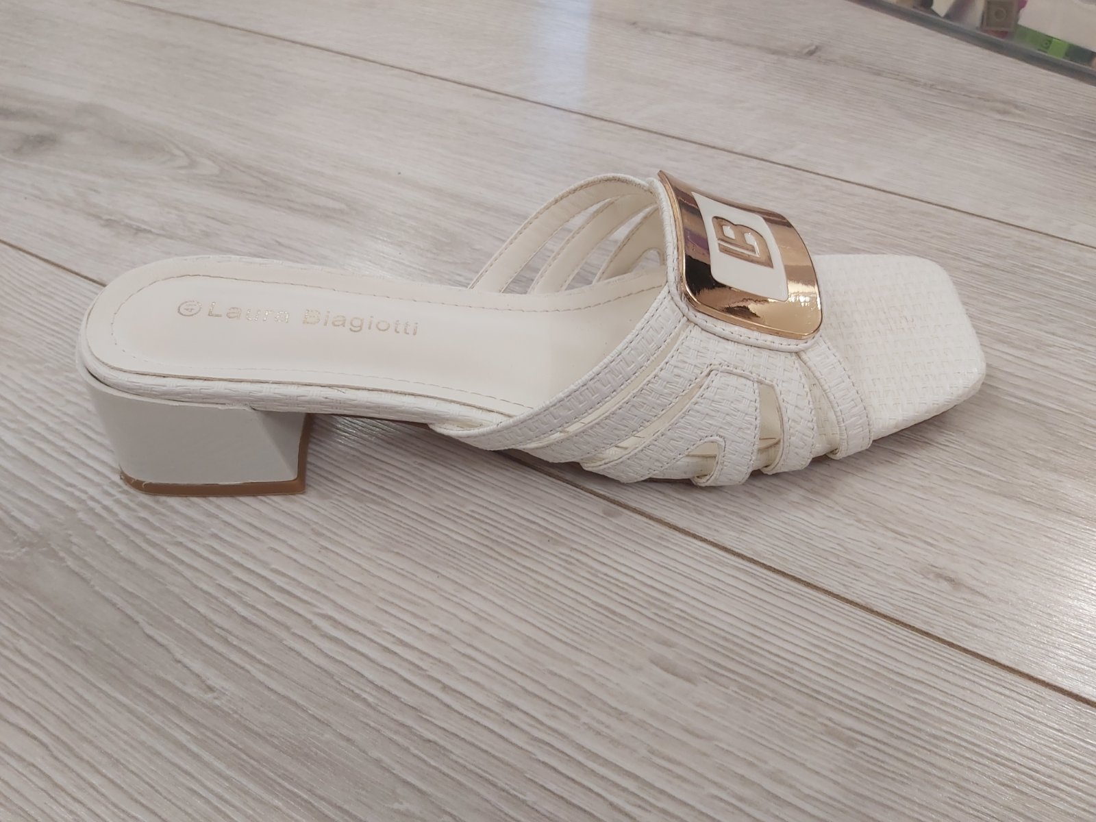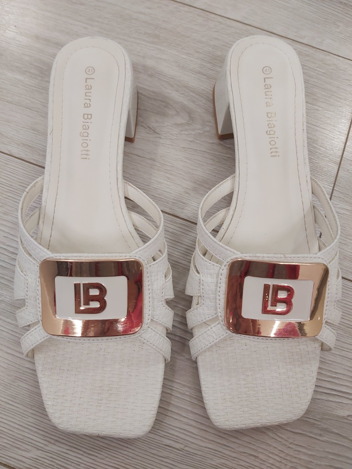 Predám nádherné elegantné biele šľapky so zlatou ozdobou 1 x obuté na oslavu. Výška podpätku 4,2 cm. Sú vo vynikajúcom stave ako nové, veľmi pohodlné. Značka Laura Biagiotti. Cena 30 € + poštovné.