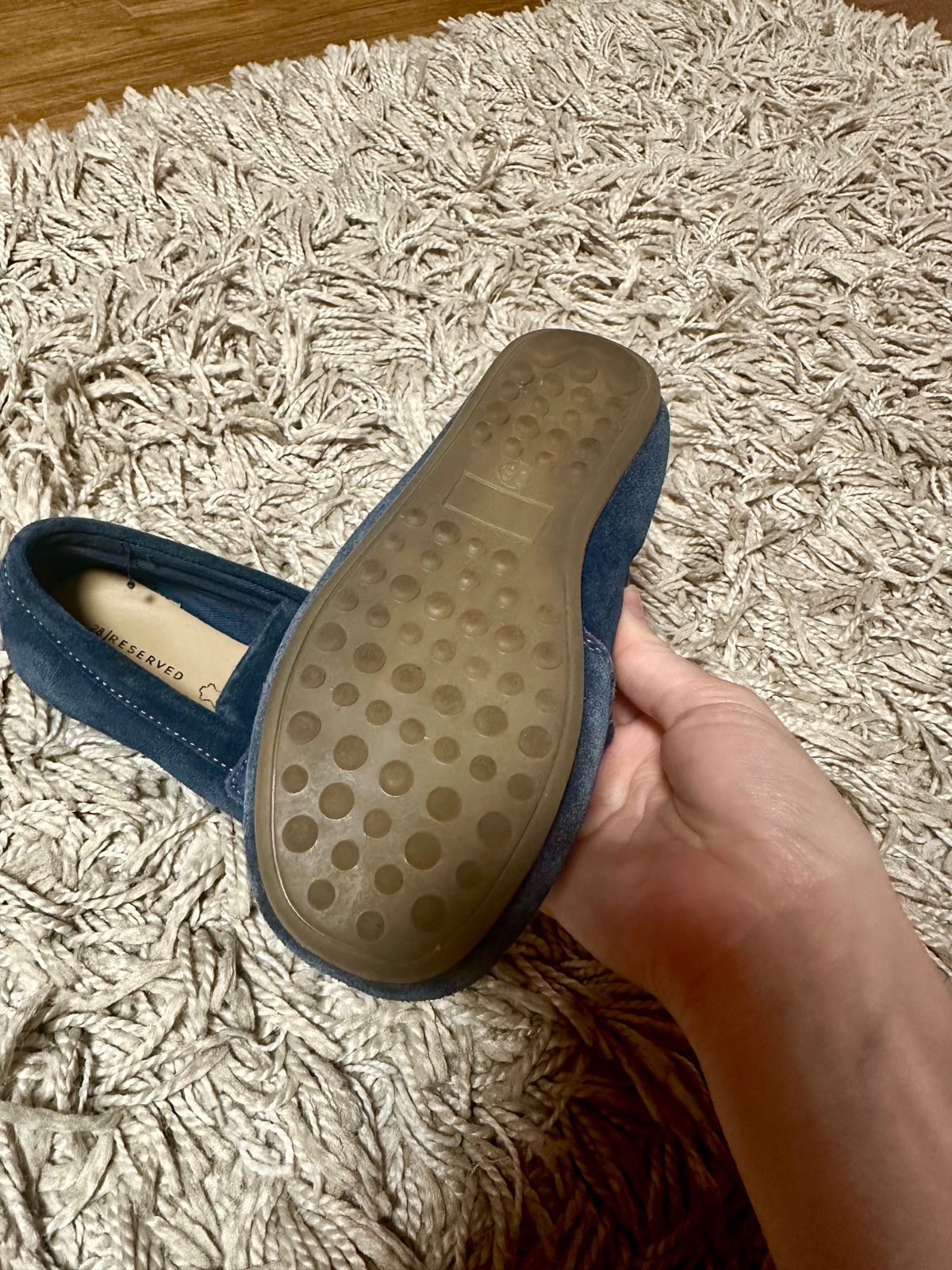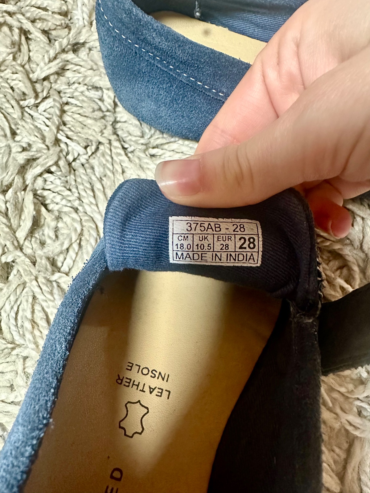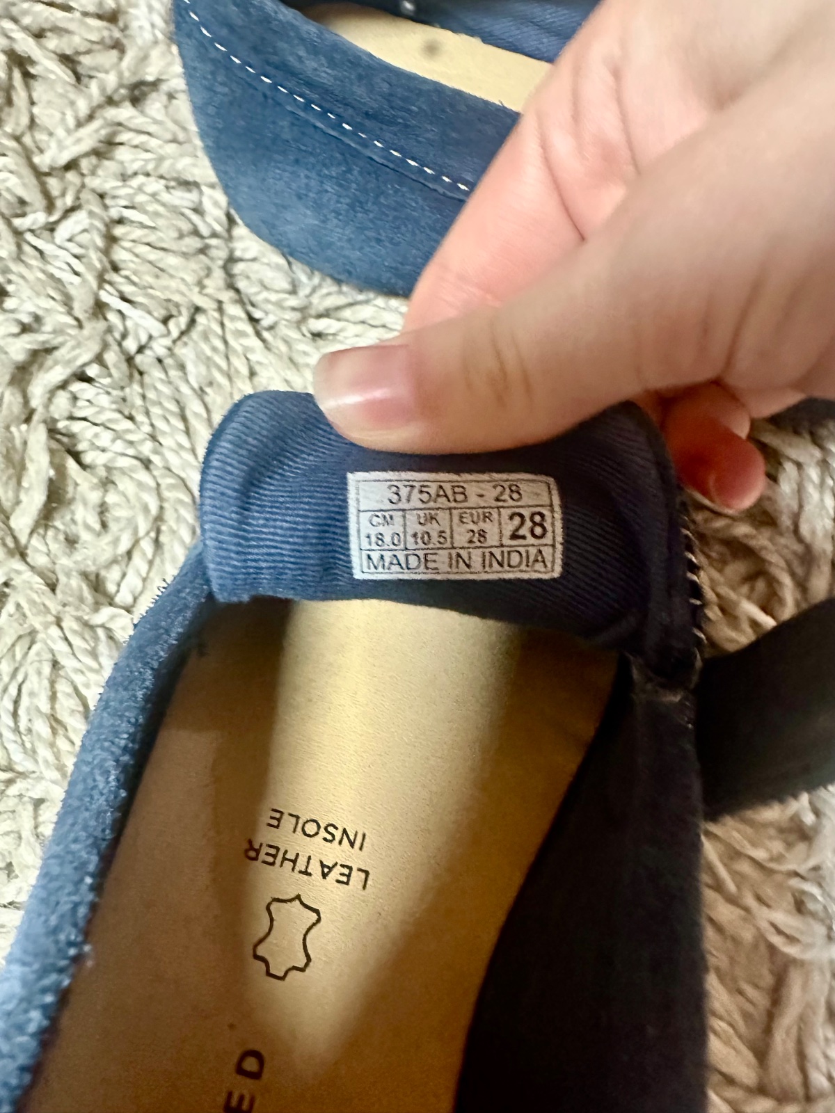 Topánky sú skoro nenosené, vo veľmi peknom stave. Podľa fotiek je vidieť, že sú zachovalé, čisté a bez výrazného zodratia. Majú odnímateľný suchý zips / pásik na vrchu, čo uľahčuje obúvanie a zároveň lepšie držia na nohe. Vnútro má koženú stielku a na štítku je uvedené 18 cm. Zvršok je semišový v tmavomodrej farbe, s jemným prešívaním po obvode.