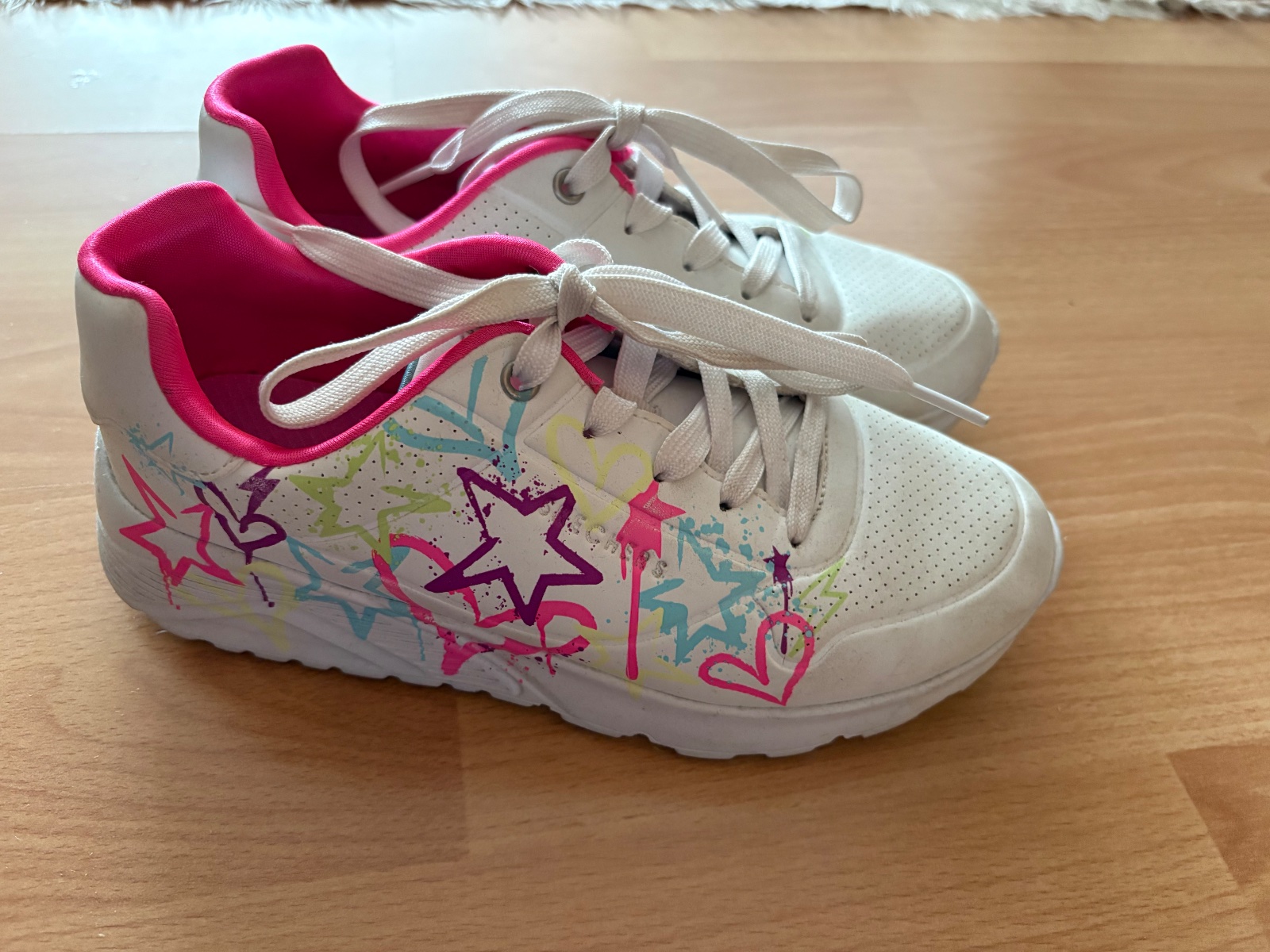 Predám dievčenské tenisky značky Skechers. Pekný stav.Su biele s farebnými prvkami. Vnútri majú pamäťovú penu, veľmi pohodlné.Velkost 36,5, výrobca udáva 23,5cm vnútornú vložku.