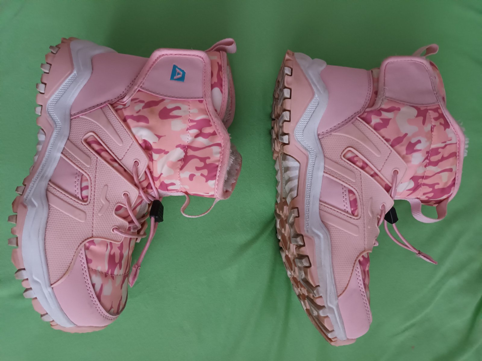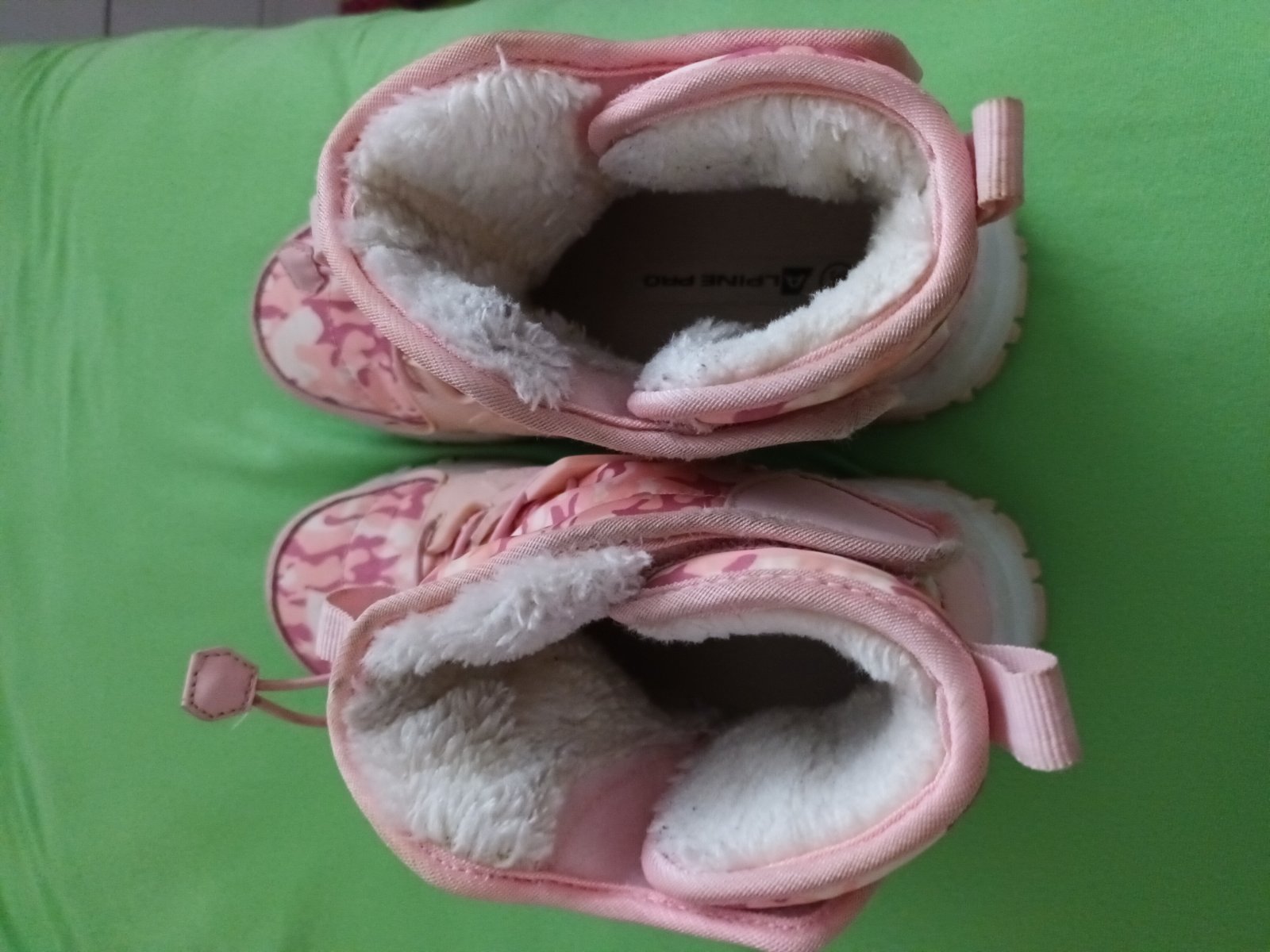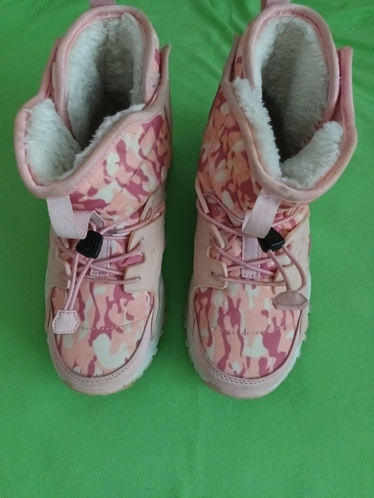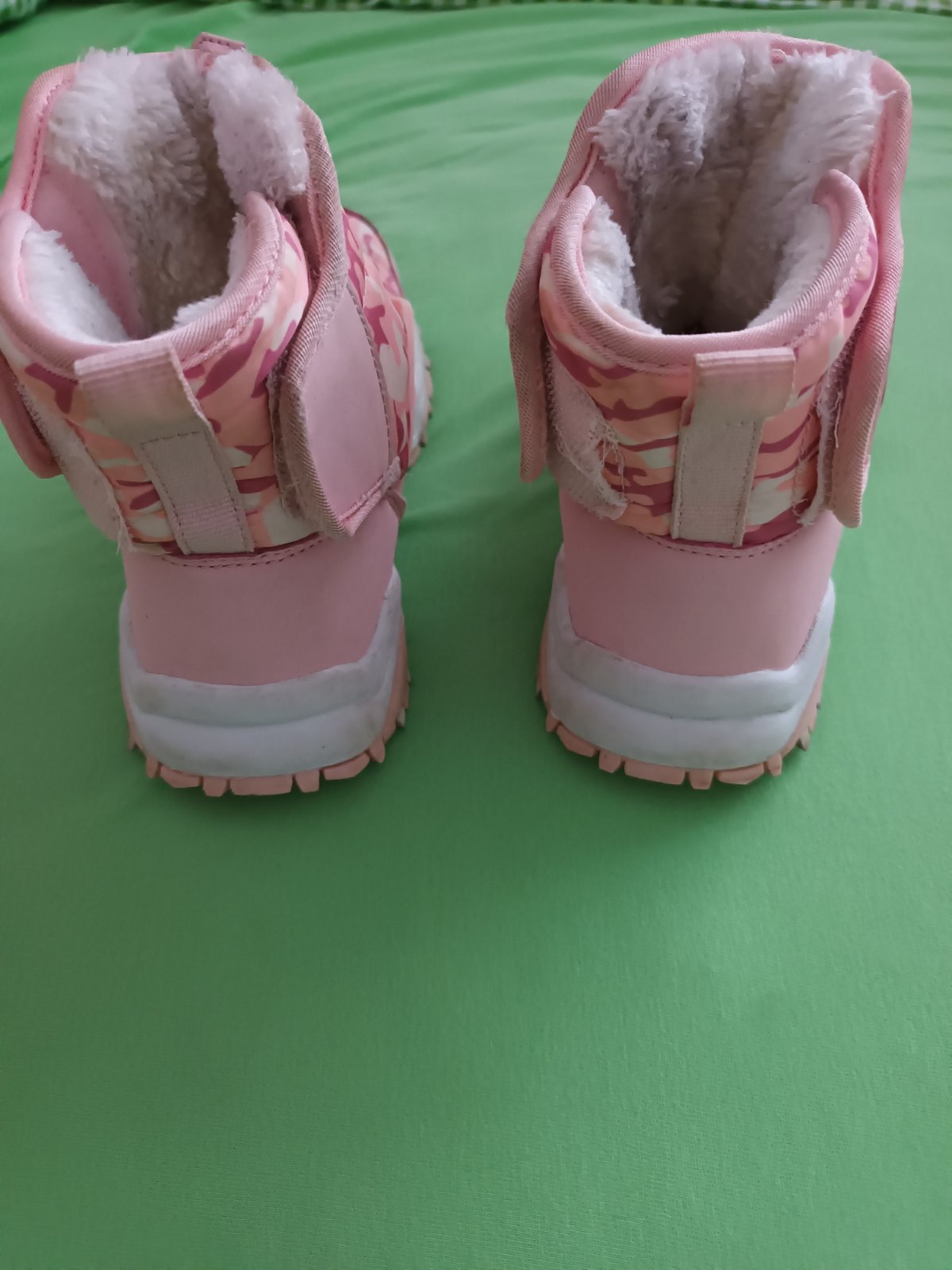Nosené mojou dcérou, nepoškodené, vnútri kožušina, zapínanie na bokoch na suchý zips a vpredu sťahovania guma