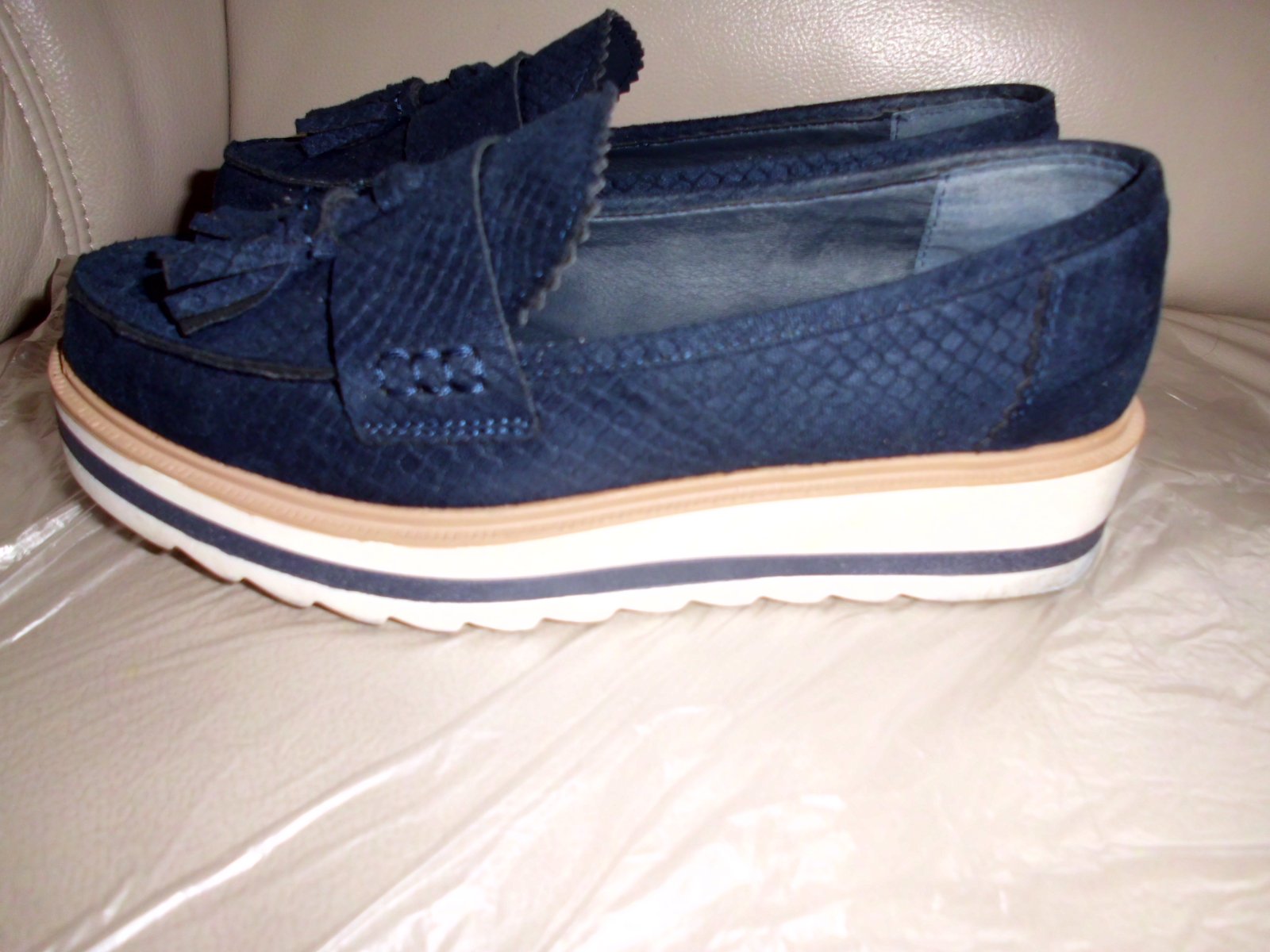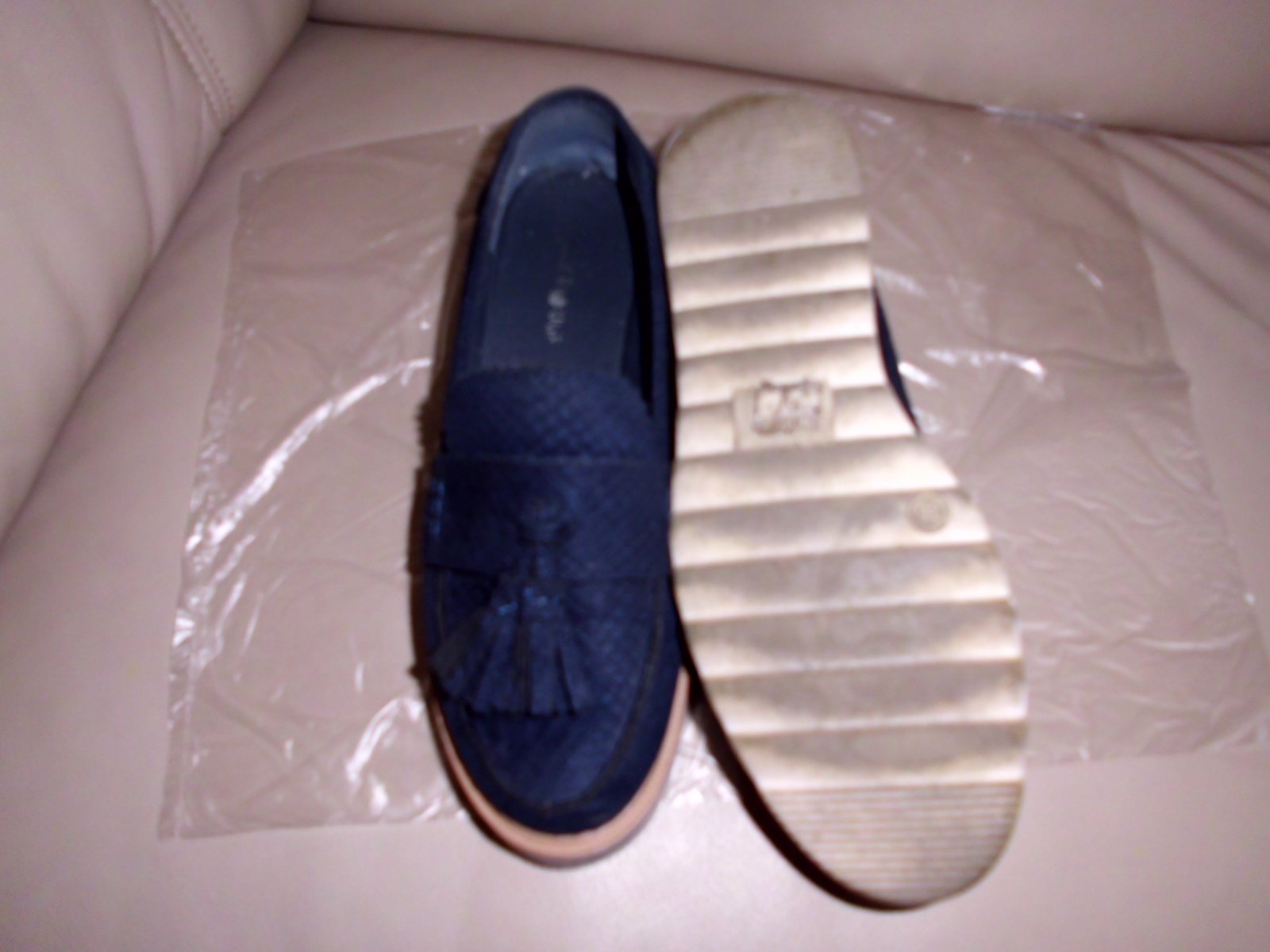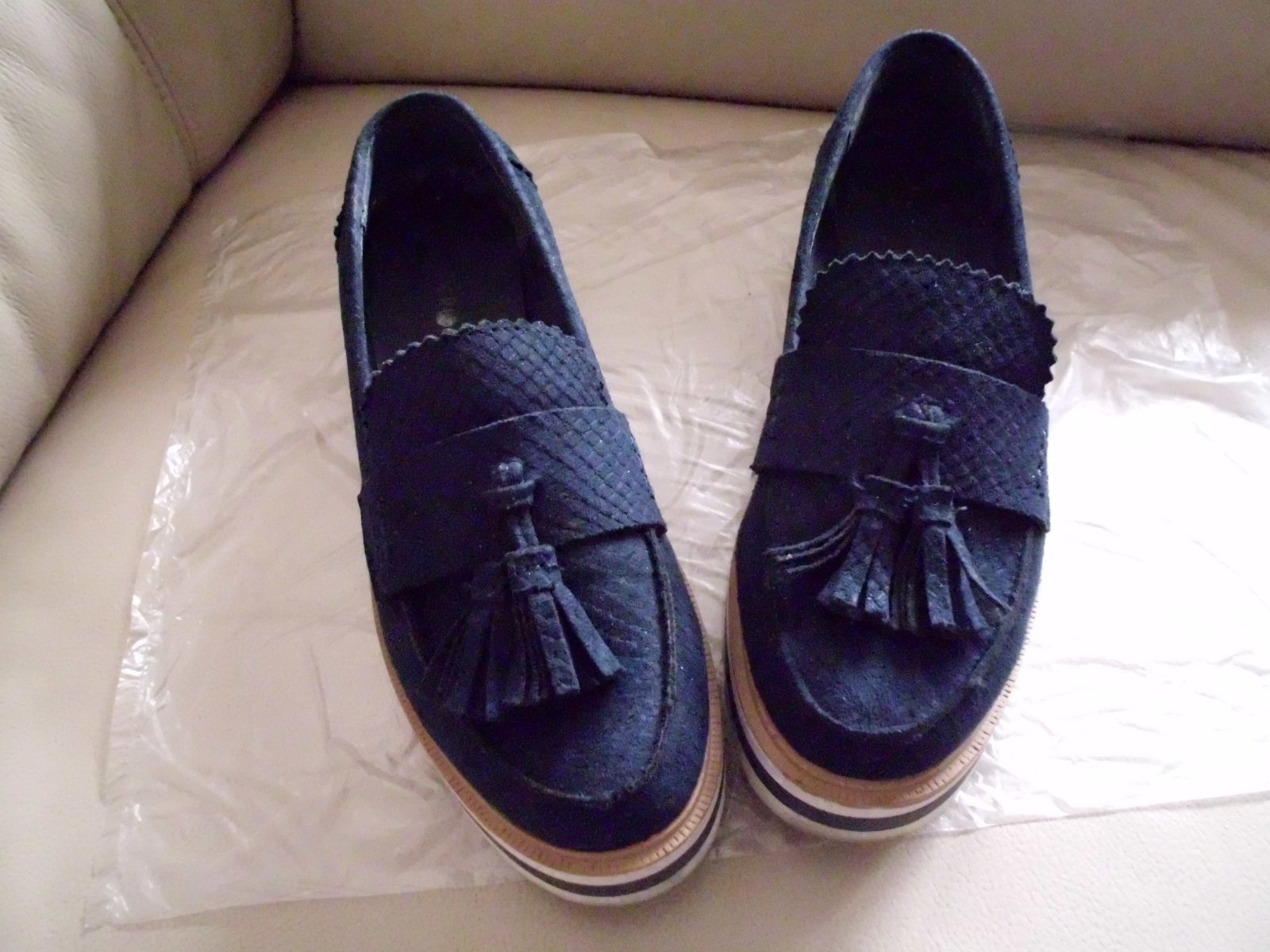 Predám topánky-mokasíny na platforme, vel. uvedená 36 ale väčšie 36,5-37, vnútorná dĺžka 23,8 cm, vonkajšia dlžka 25,5 cm, platforma 3,5 cm, ľahké, zvonku brúsená koža, tmavomodrá farba, 2x obuté boli hneď veľké...