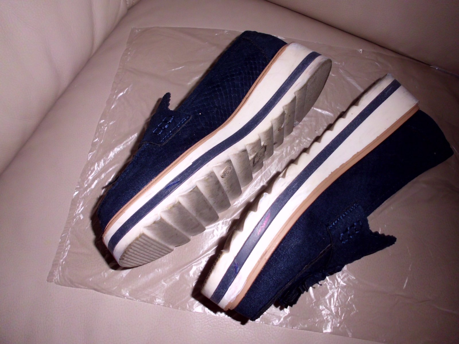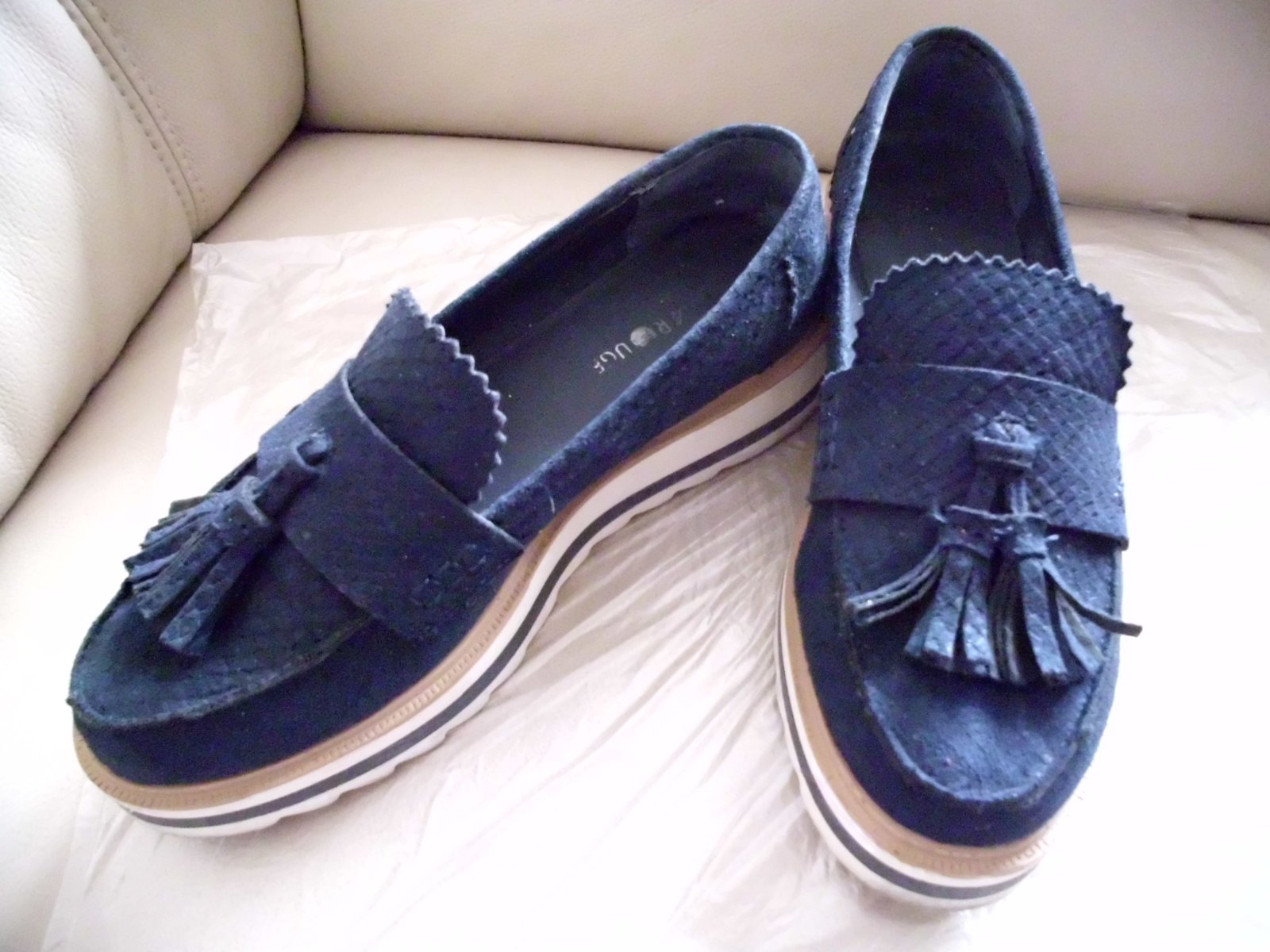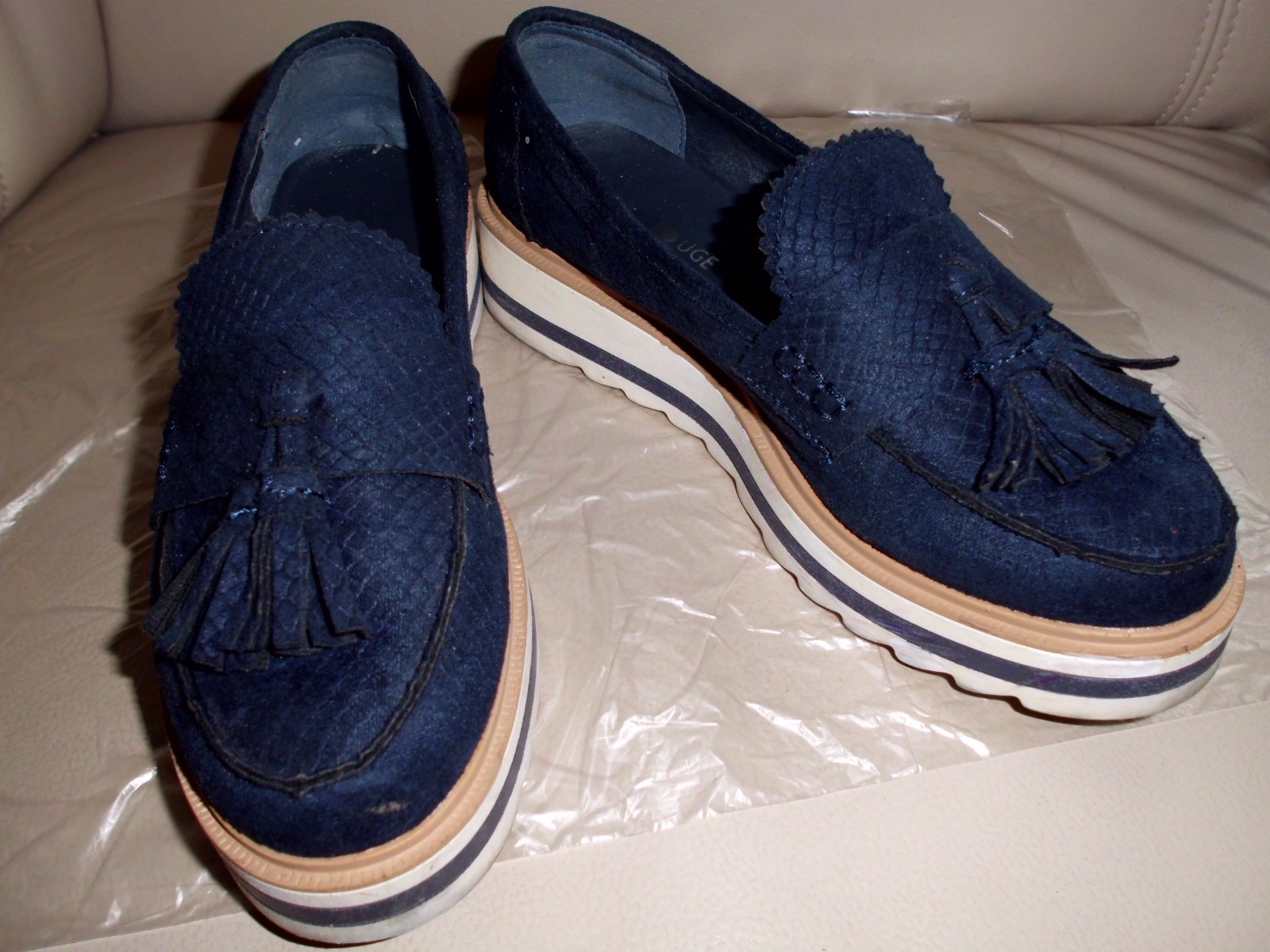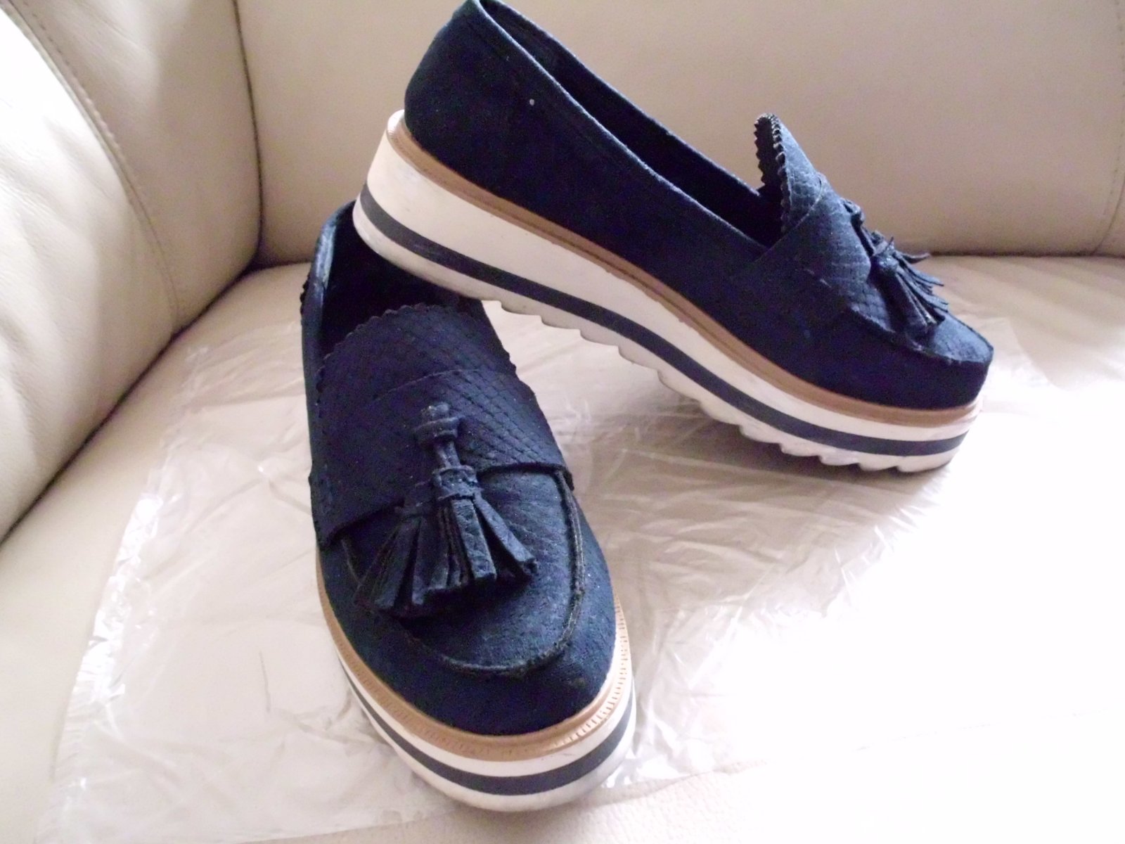 Predám topánky-mokasíny na platforme, vel. uvedená 36 ale väčšie 36,5-37, vnútorná dĺžka 23,8 cm, vonkajšia dlžka 25,5 cm, platforma 3,5 cm, ľahké, zvonku brúsená koža, tmavomodrá farba, 2x obuté boli hneď veľké...