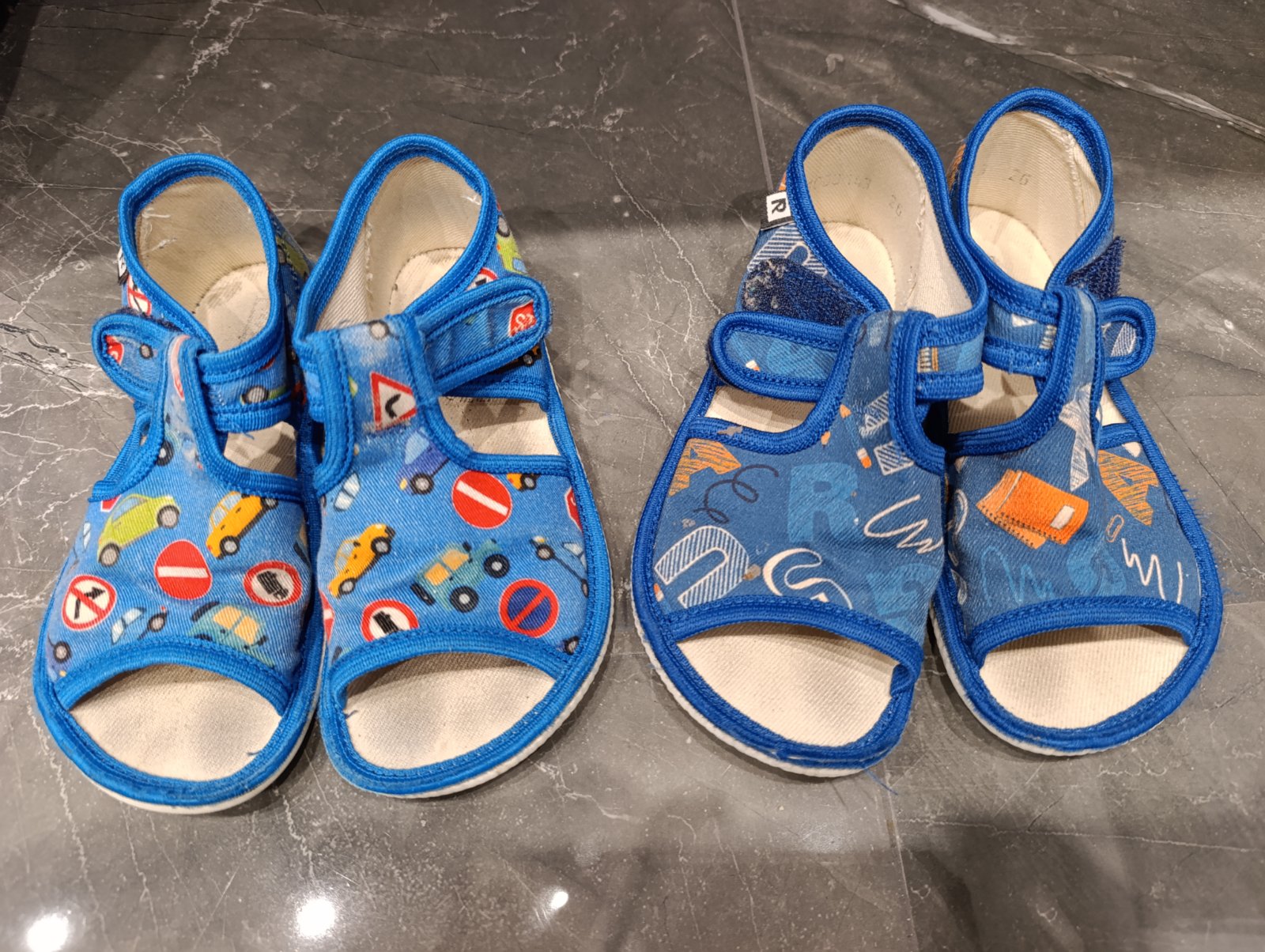 2* papuče rak, barefoot. Majú rozdielnu vnútornú dĺžku, motív auta sú v poriadku, zips drží dobre, nosené v škôlke. Motív škola majú zodratú špičku, zips drží dobre, nosené dom. Predaj spolu alebo aj každé zvlášť. 7€ autá a škola 5€