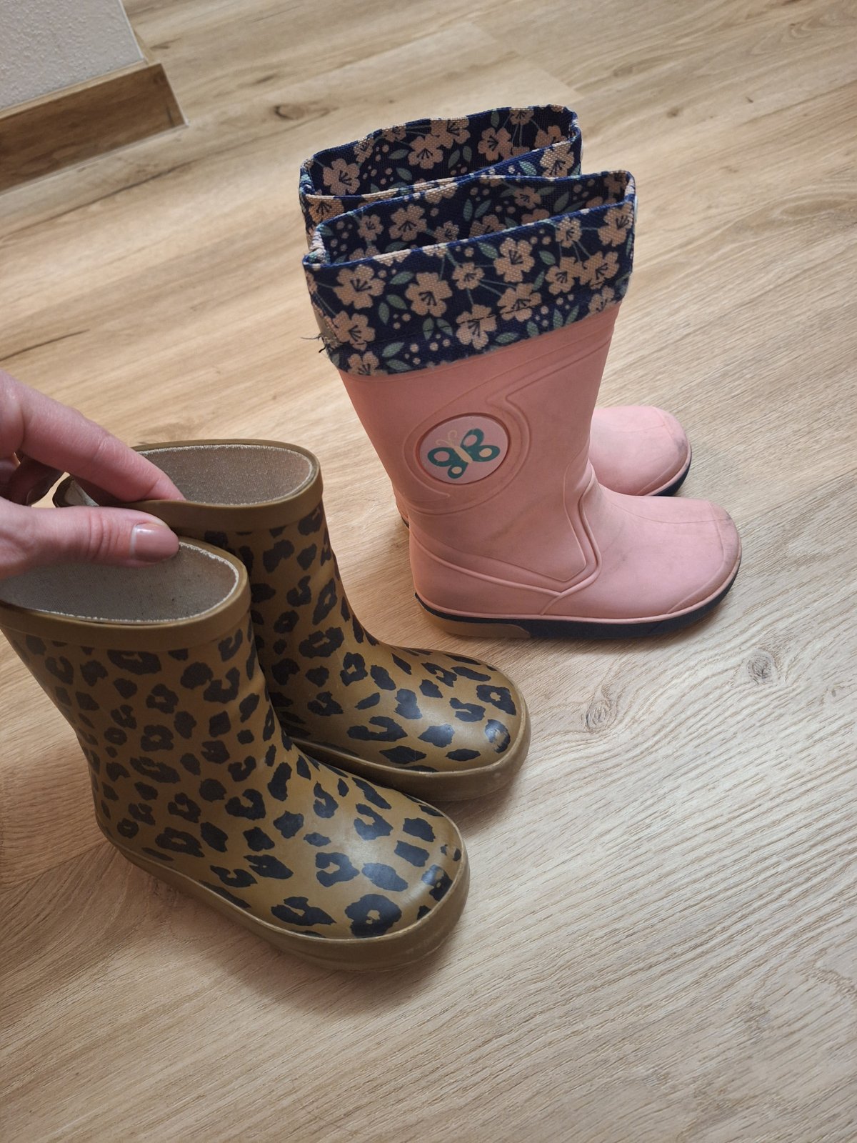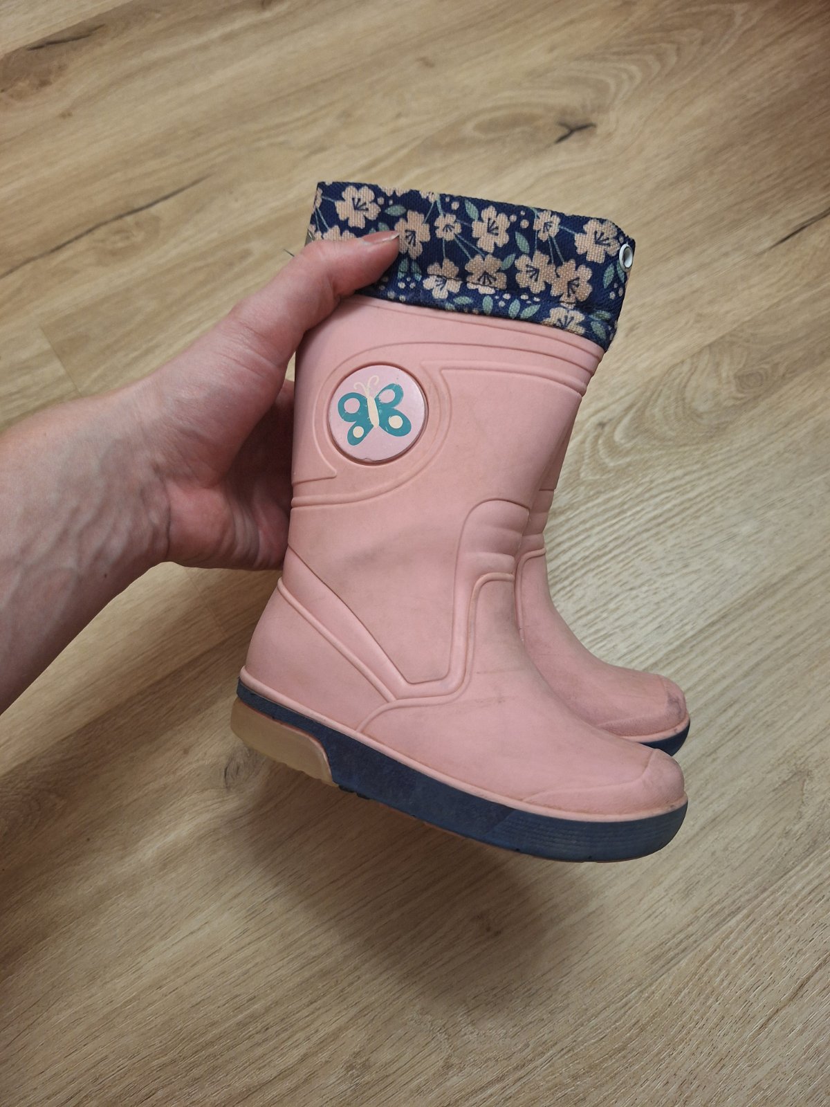 Gumáky pre dievčatko, dcéra ich mala obuté asi 2-3x, no zostali vpredu mini fľaky (viď foto), nebráni v nosení. Veľkosť 22/23, VD je 15cm. +Poštovné