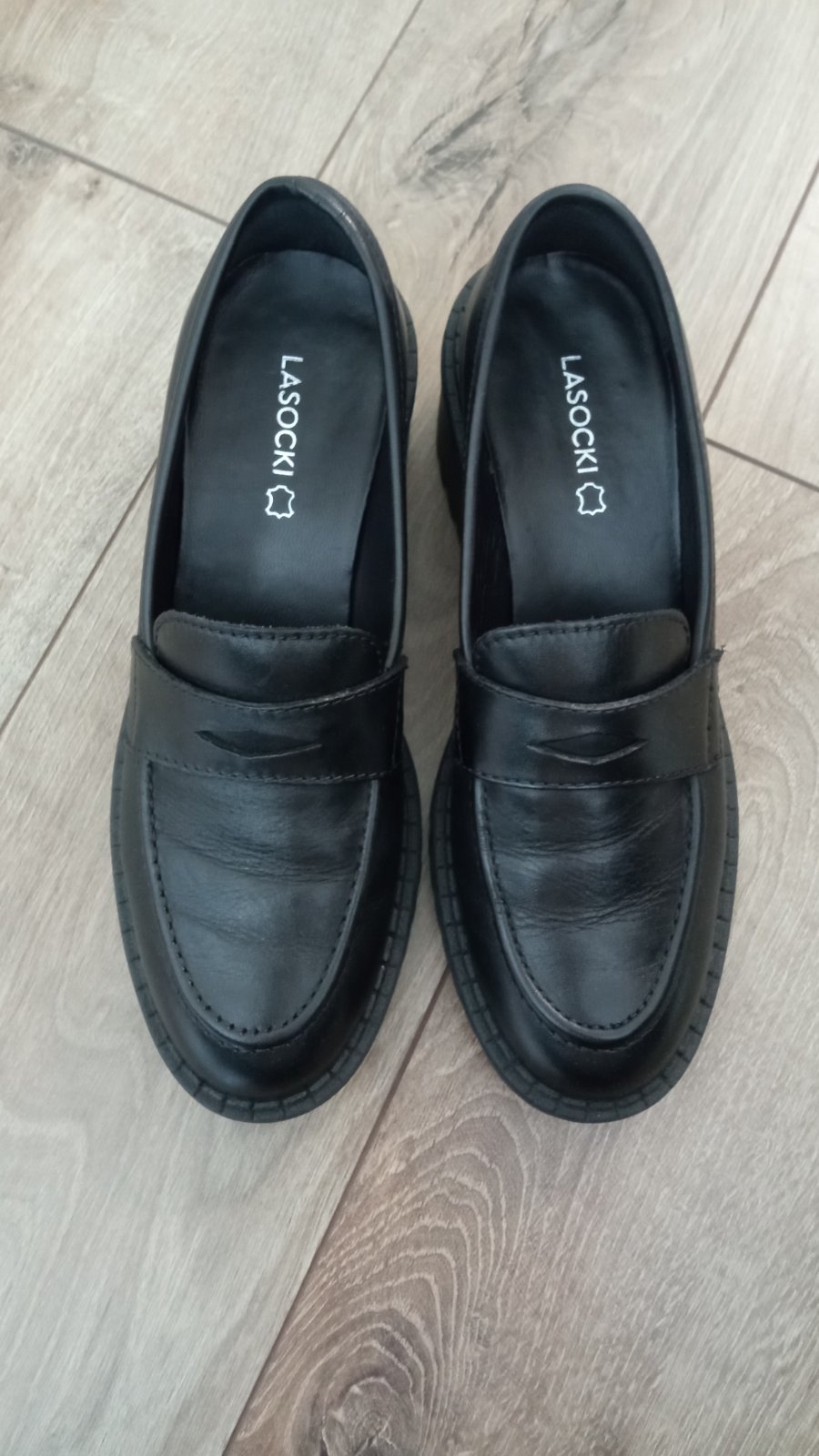 Kožené topánky Lasocki s klinovým podpätkom, kombinácia semišu a lakovanej kože. Obuté raz do kina, cesta autom 🙈 Výška podpätku je 7,5 cm a dĺžka topánky cca 24 cm, merané meracím pásmom. Ako nov...
