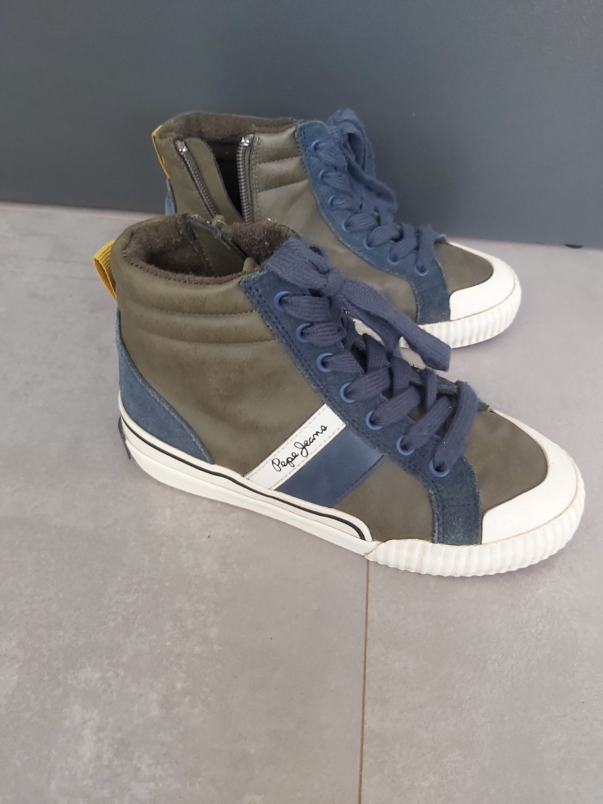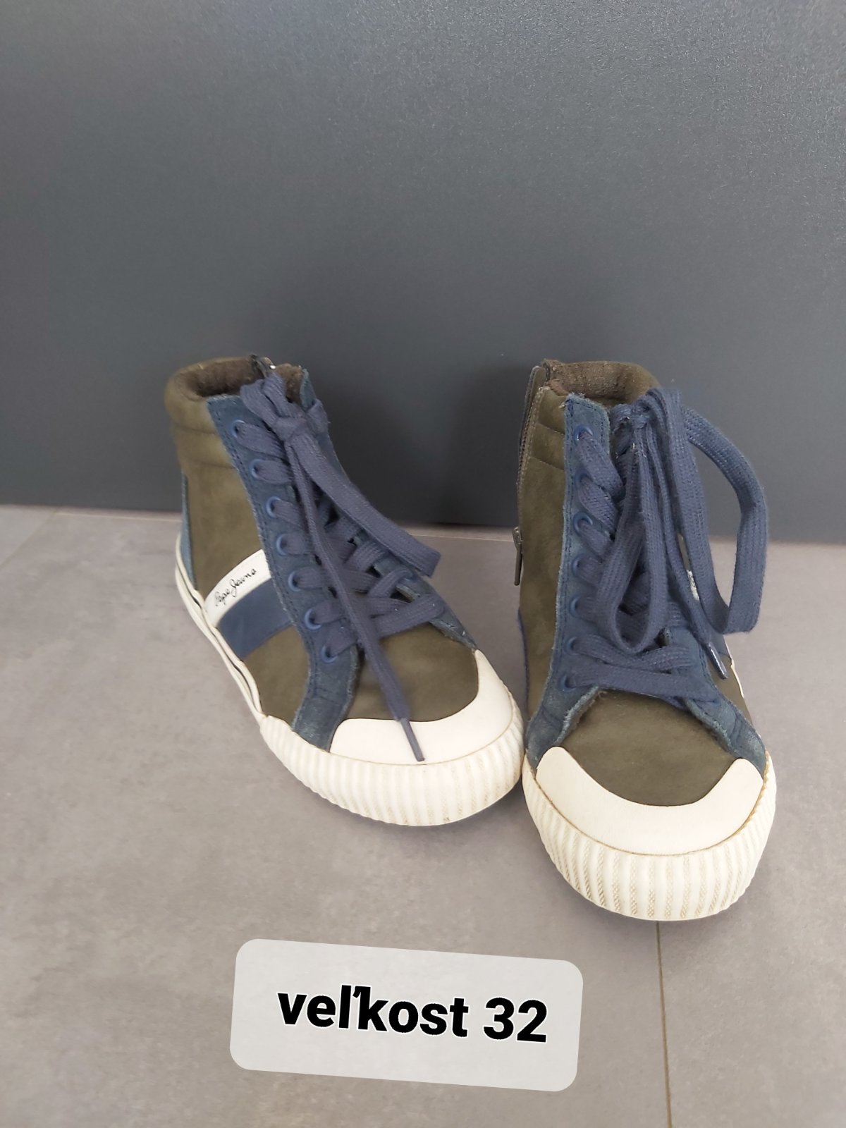 Predám frajerské tenisky Pepe Jeans - velkost 32 - syn ich mal obute len 1x ale kvôli plochým nohám nenositelne - stav super akurát niekde je take žlté je to len lepidlo od nova nie je to špinavé ...