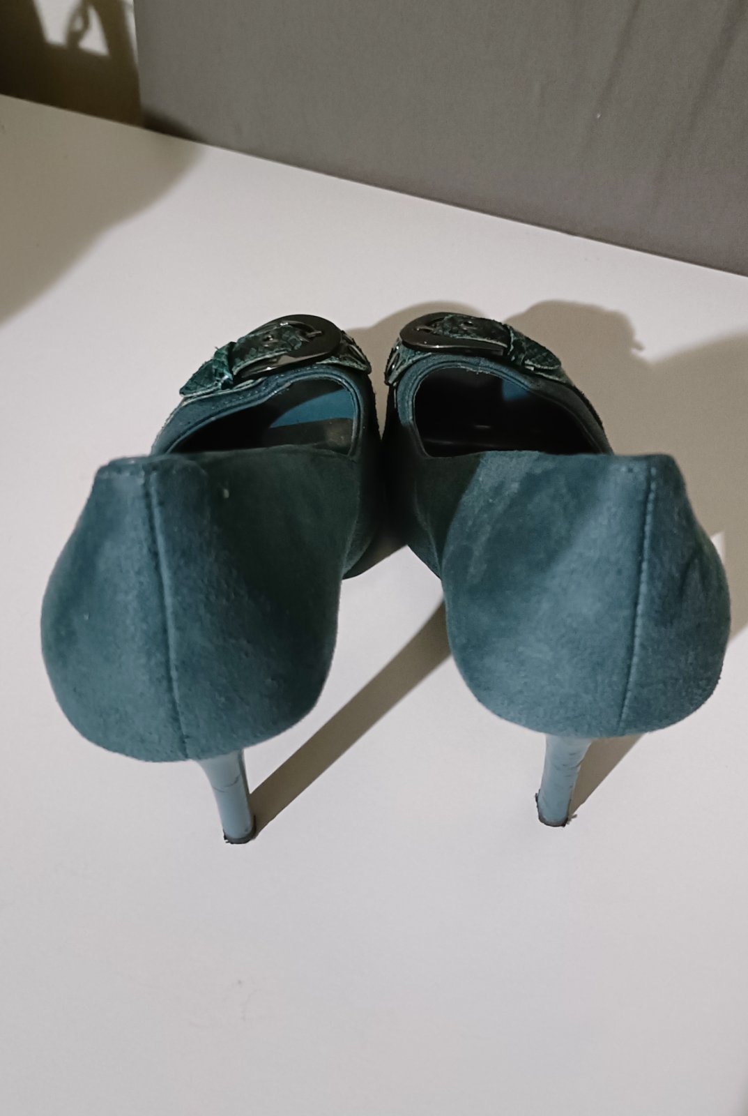 Výška podpätku 9,5cm/2cm a vnútorná dĺžka 25cm. Málo nosené. Po odlepení gelových vložiek zostalo na vnutornej stielke mierne poškodenie - viď foto.