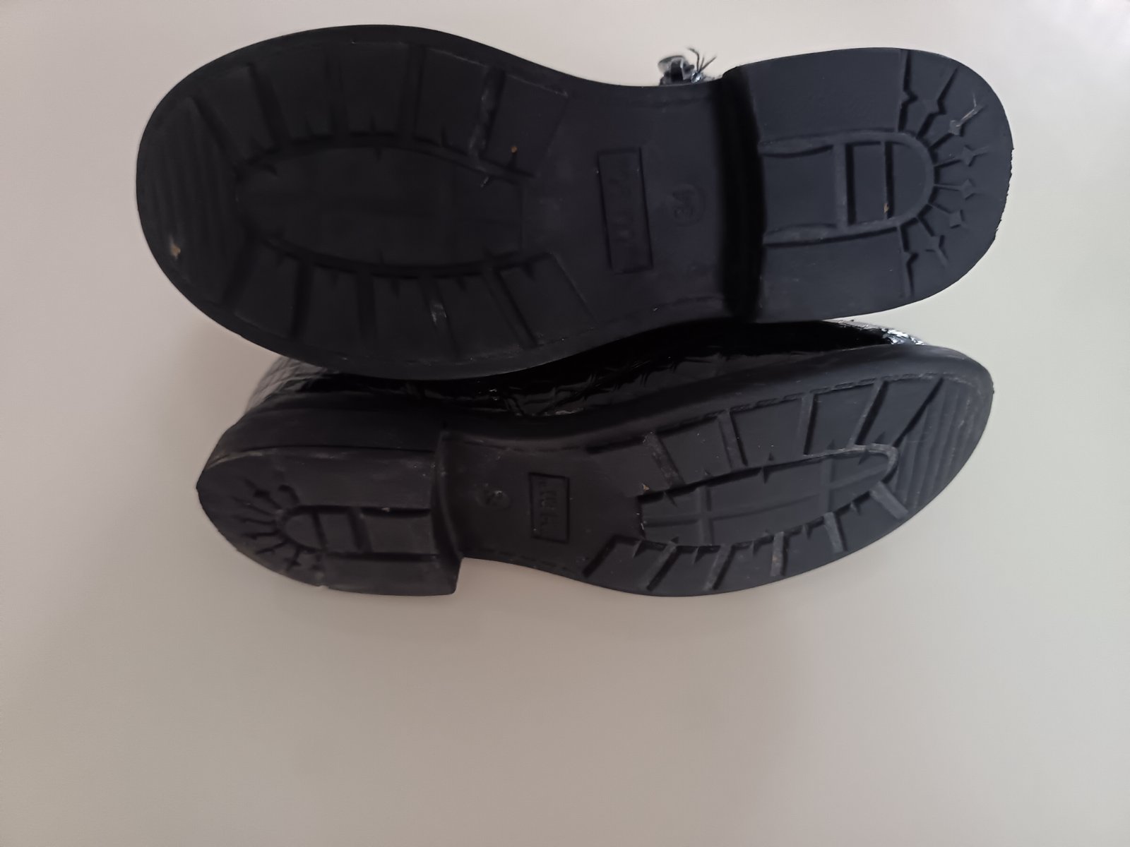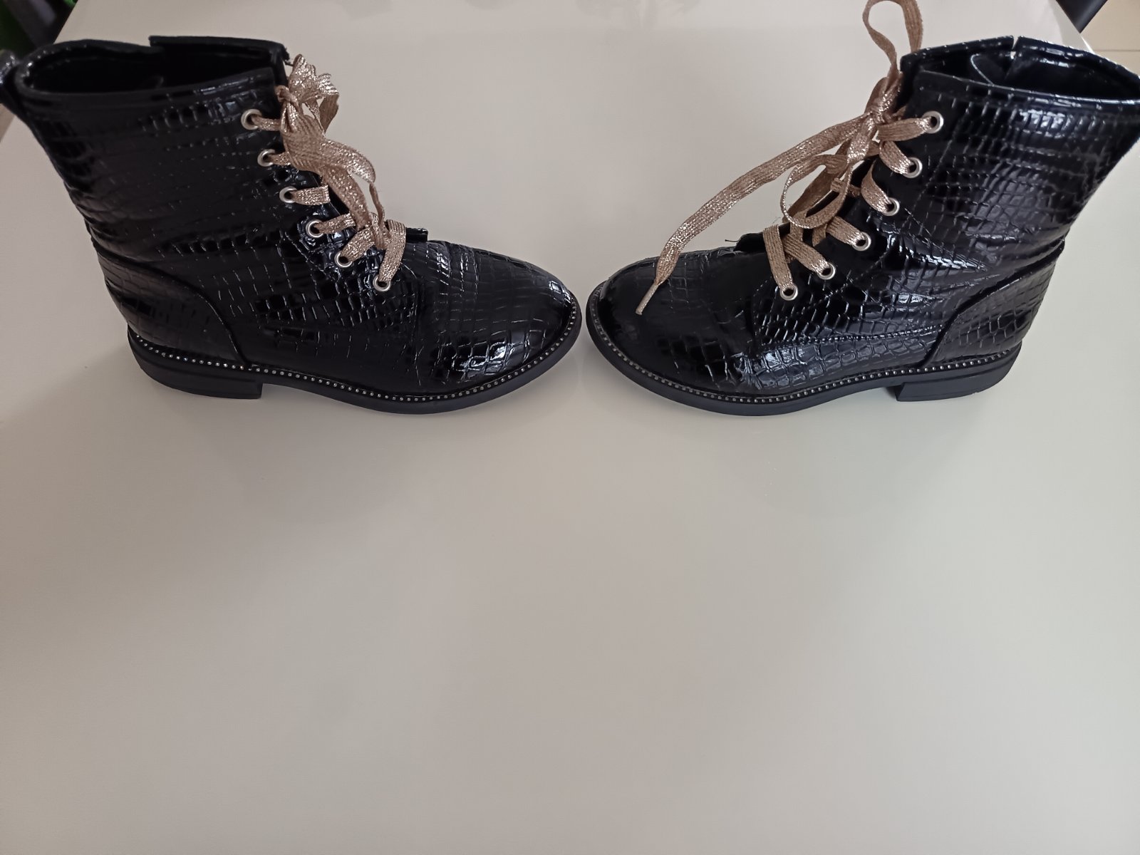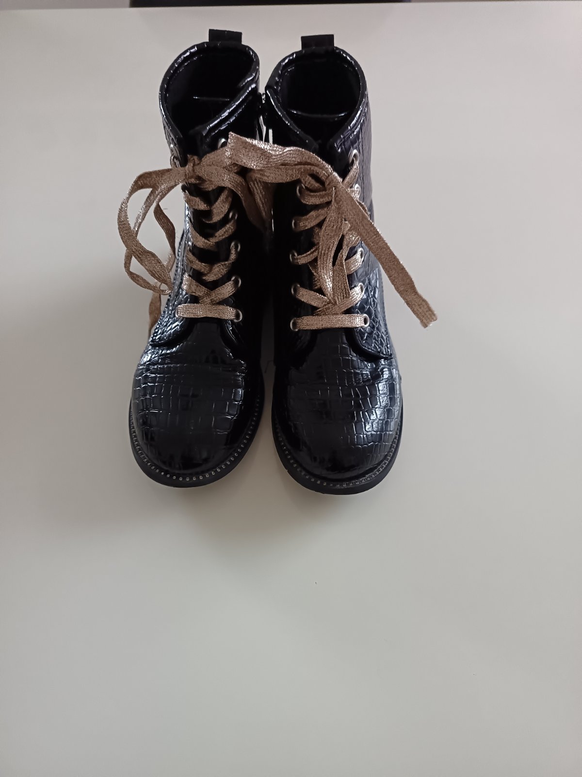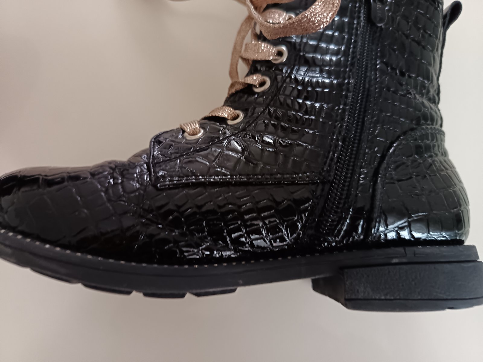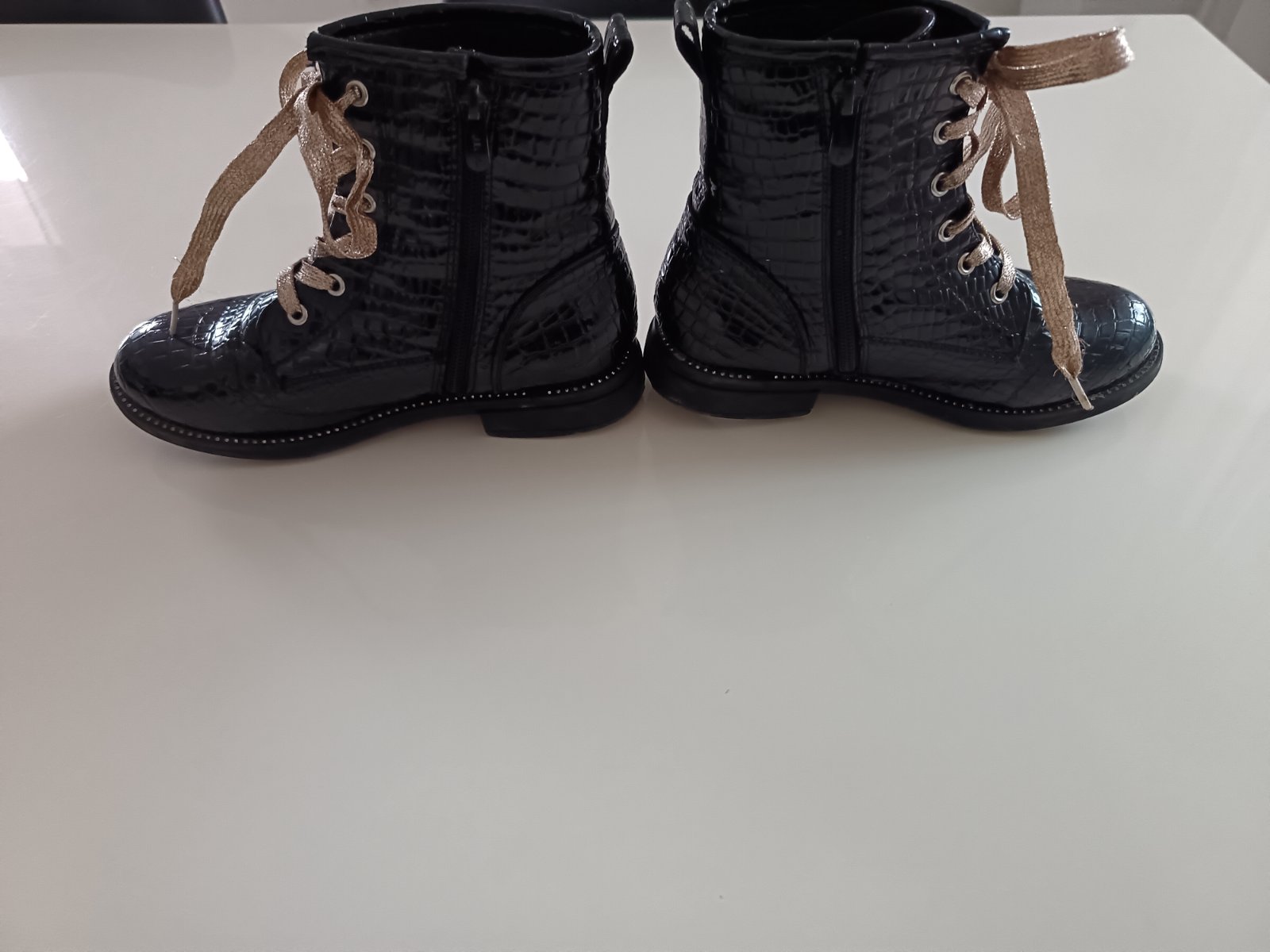 Členkové lesklé čižmy so zlatými šnúrkami, ktoré si viete kľudne vymeniť, z boku na zips, špičky neodrete, mierne ošuchane z bočnej vnútornej strany spôsobene pri chôdzi, inak bez poškodenia. Zvnútra oteplené. VN. Dĺžka 21,3cm.