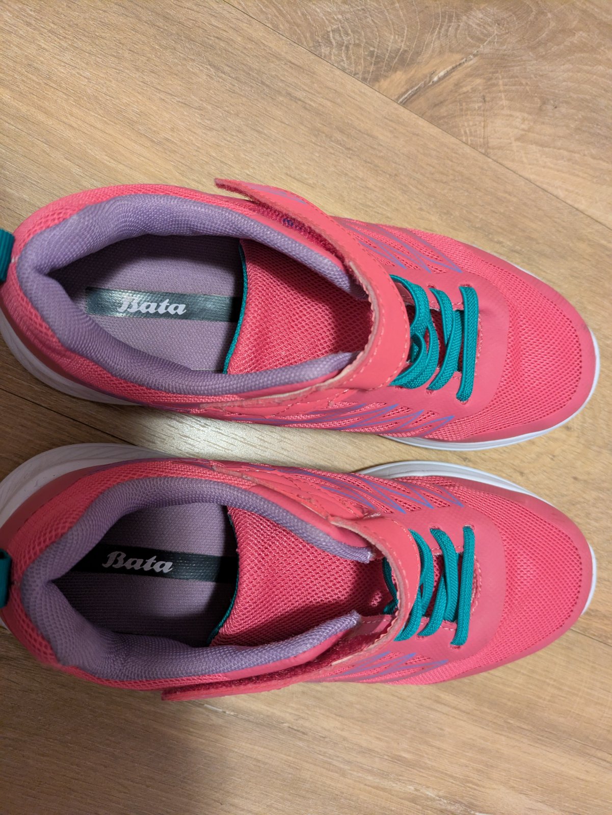 Nové, nikdy nepoužité. Športové dievčenské tenisky s bielou podrážkou značky Baťa vyrobené z priedušného textilného materiálu s mäkkou penovou stielkou. Môžu byť použité aj ako halovky na telesnú v...