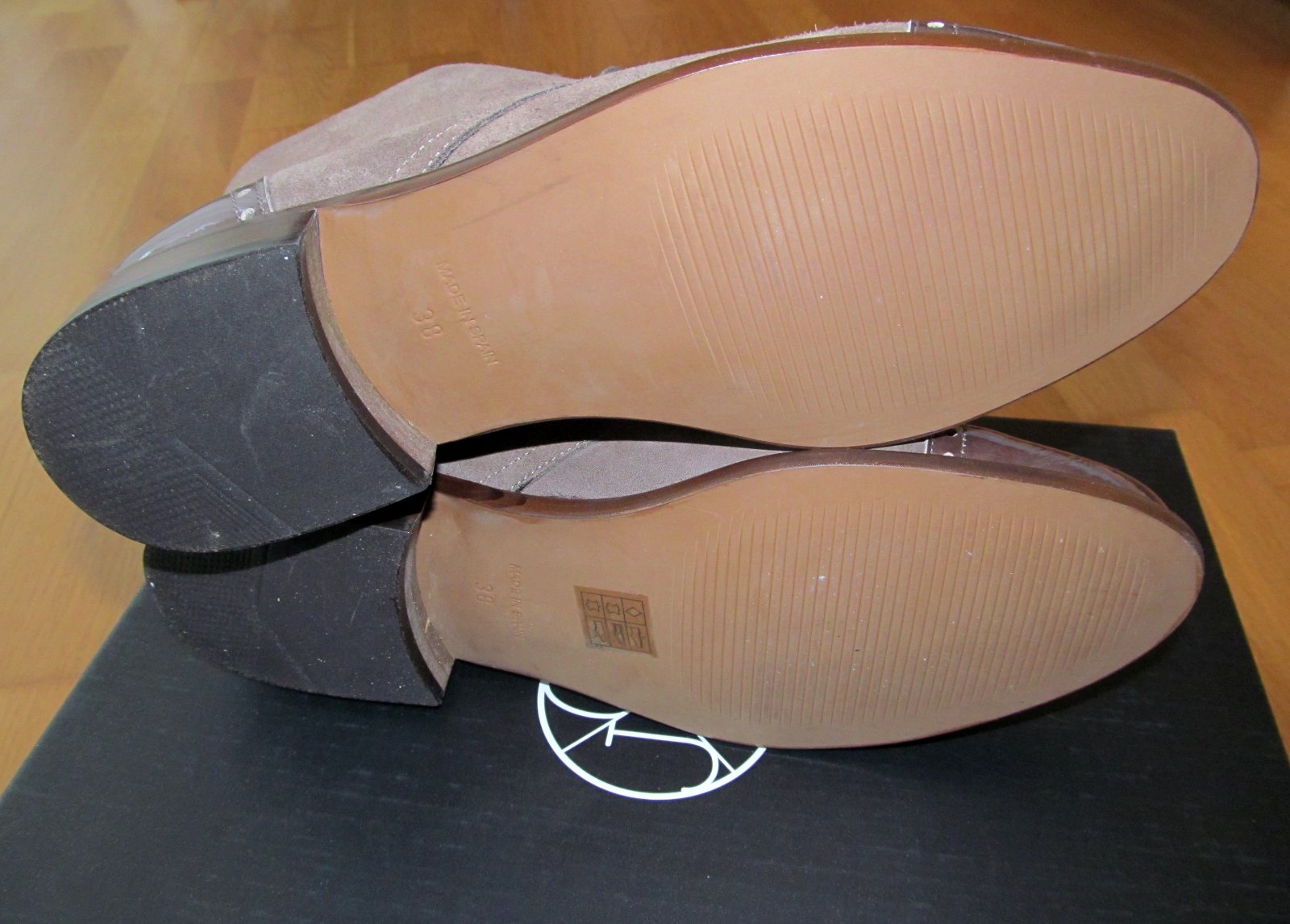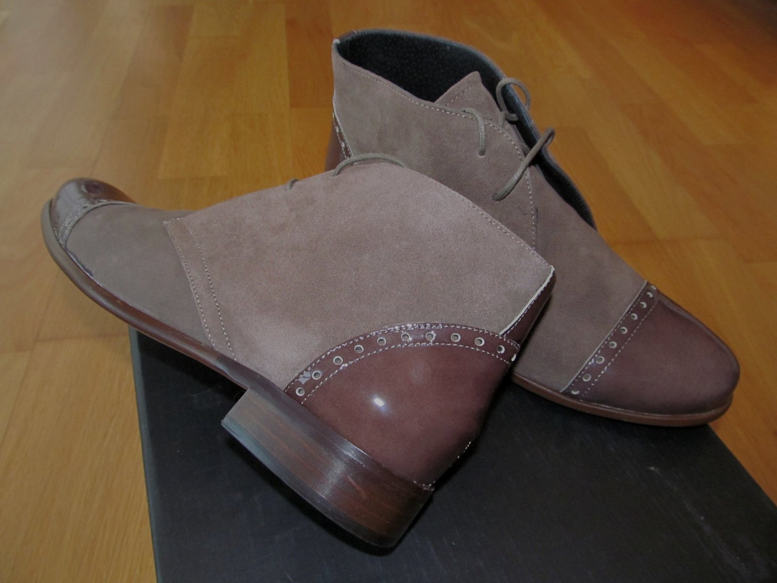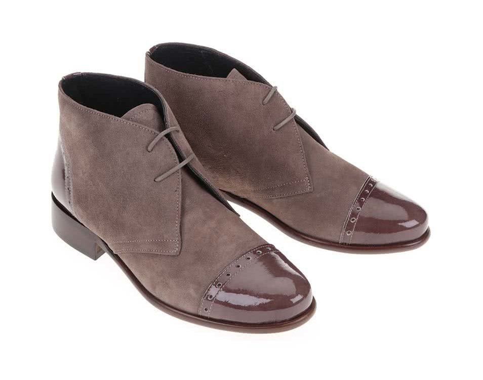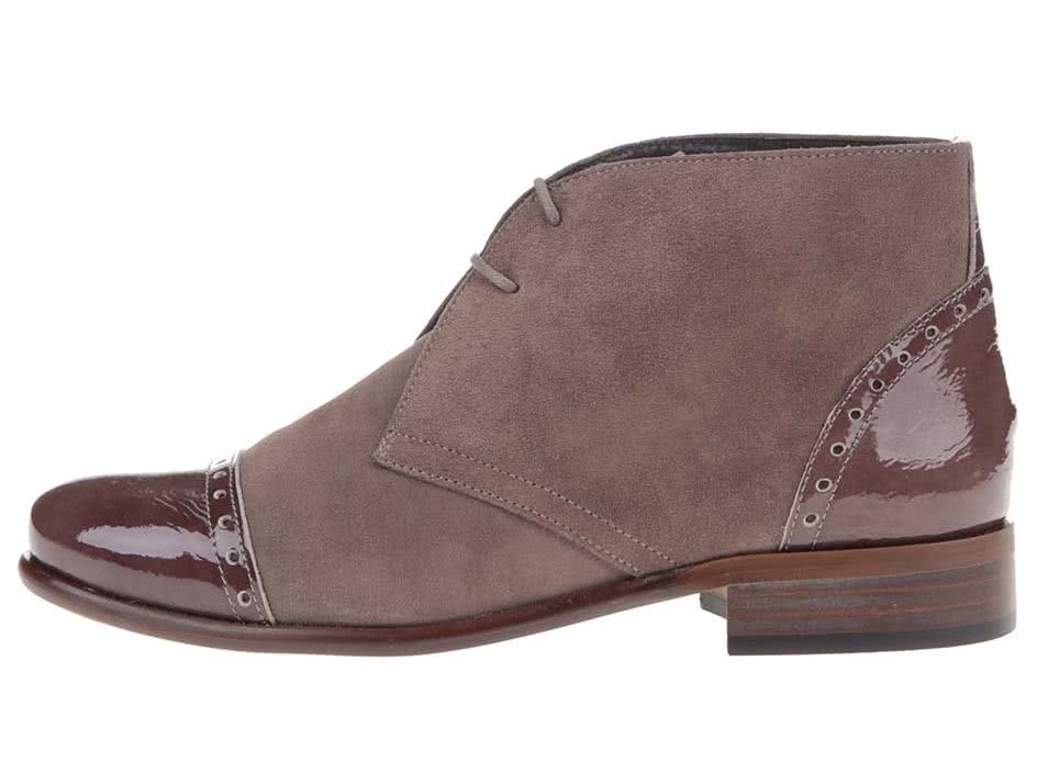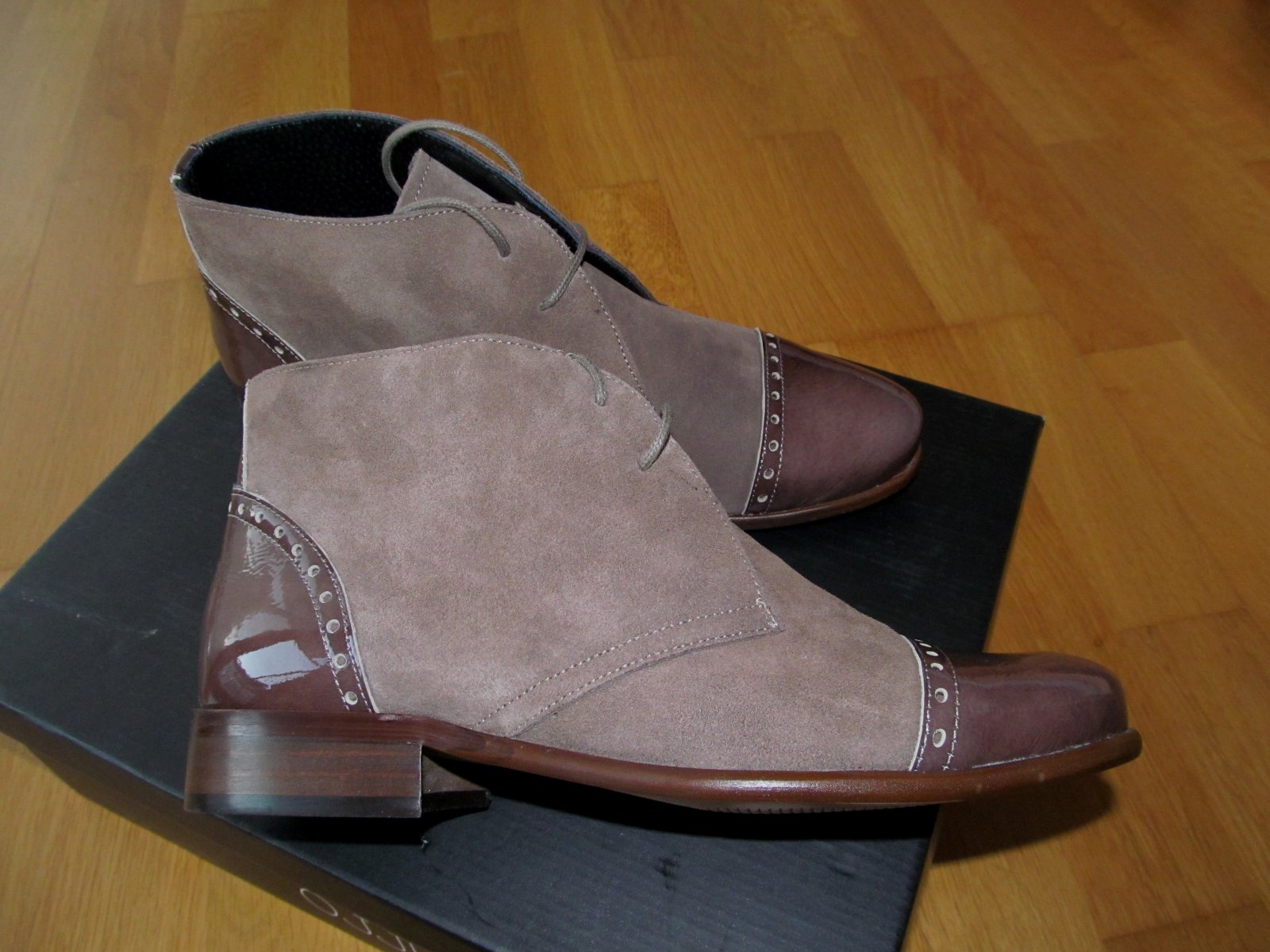 farba Taupe, celokozene, koza je aj vo vnutri na podsivke. Topanky su celkom nove. Maju leskle kozene detaily na pate a spici na styl Oxford topanok. Su krasne, prekvapivo makkke a pohodlne, elegantne. Farebny rozdiel medzi farbou lesklej koze a matnej nie je velky, ako sa moze zdat na mojej amaterskej fotke, preto pridavam aj komercne foto, ktore farby lepsie vystihuje. Koza nieco povoli. Velkostne sedia na nohu 38, prip. malinko vacsiu. Topanky su v povodnej krabici so stitkom. Predavam za znizenu cenu