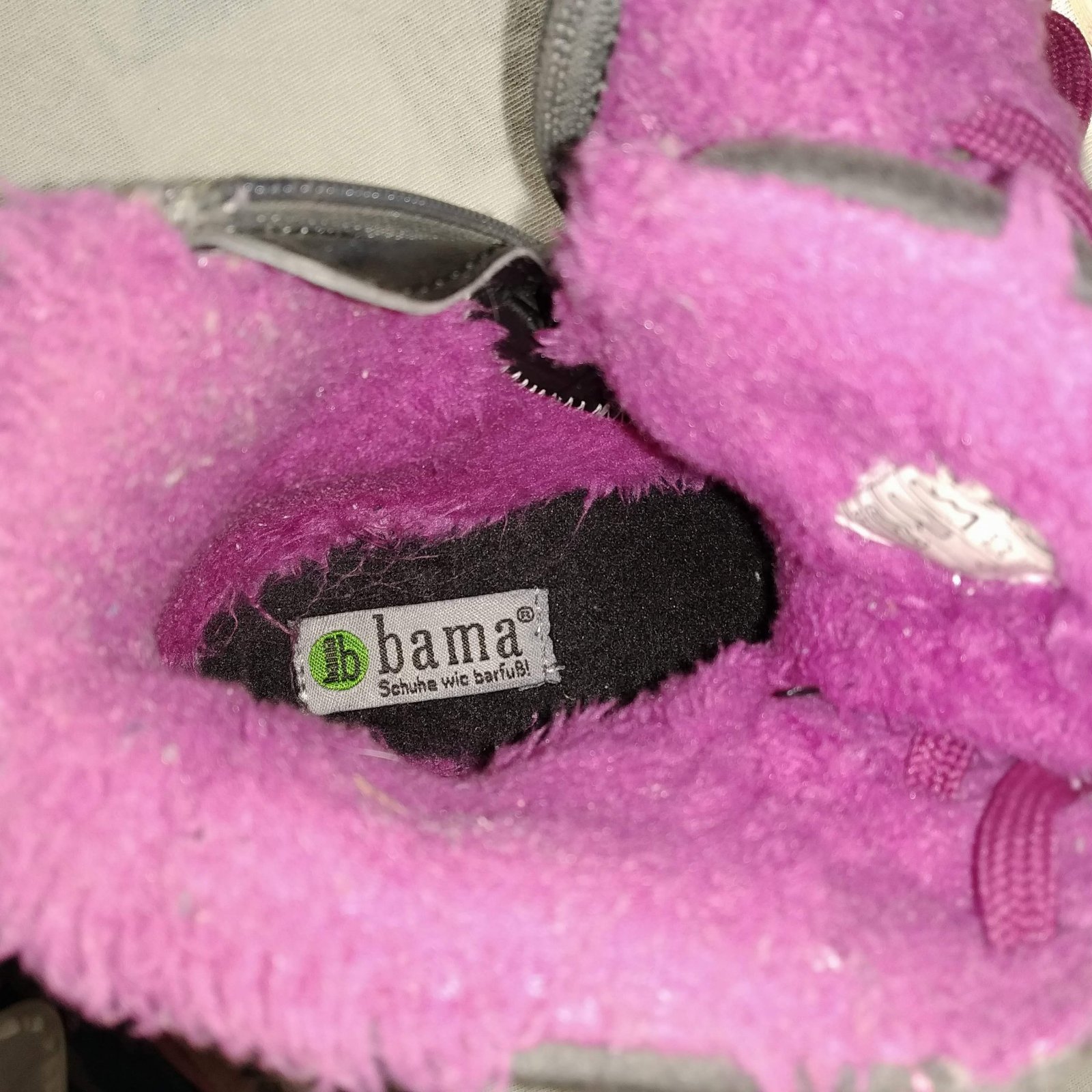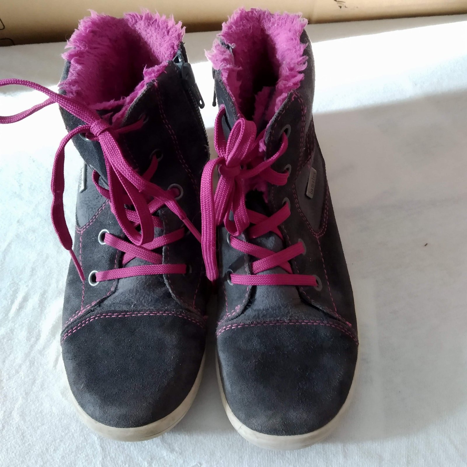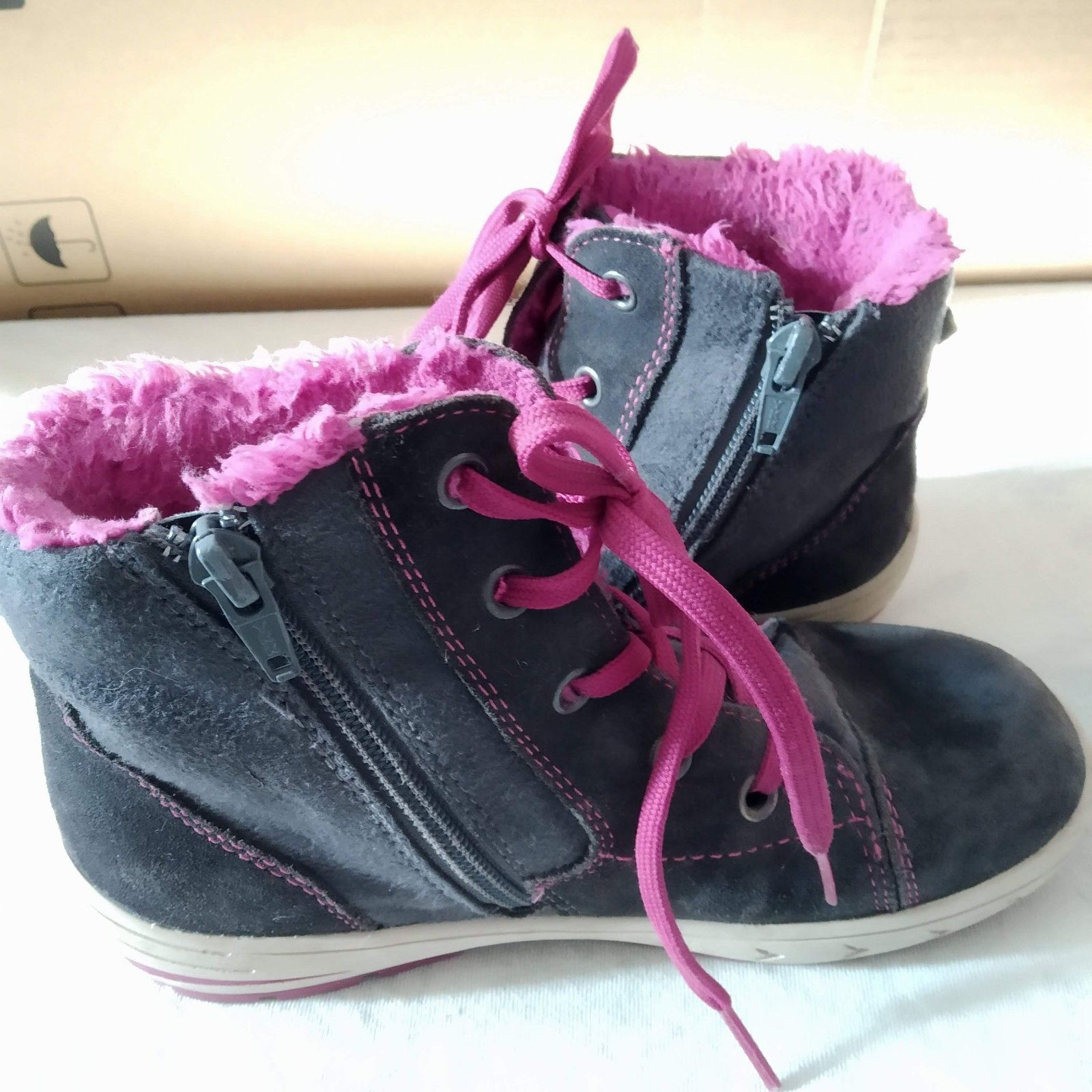 Sú tmavomodré s ružovou kožušinkou a šnúrkami