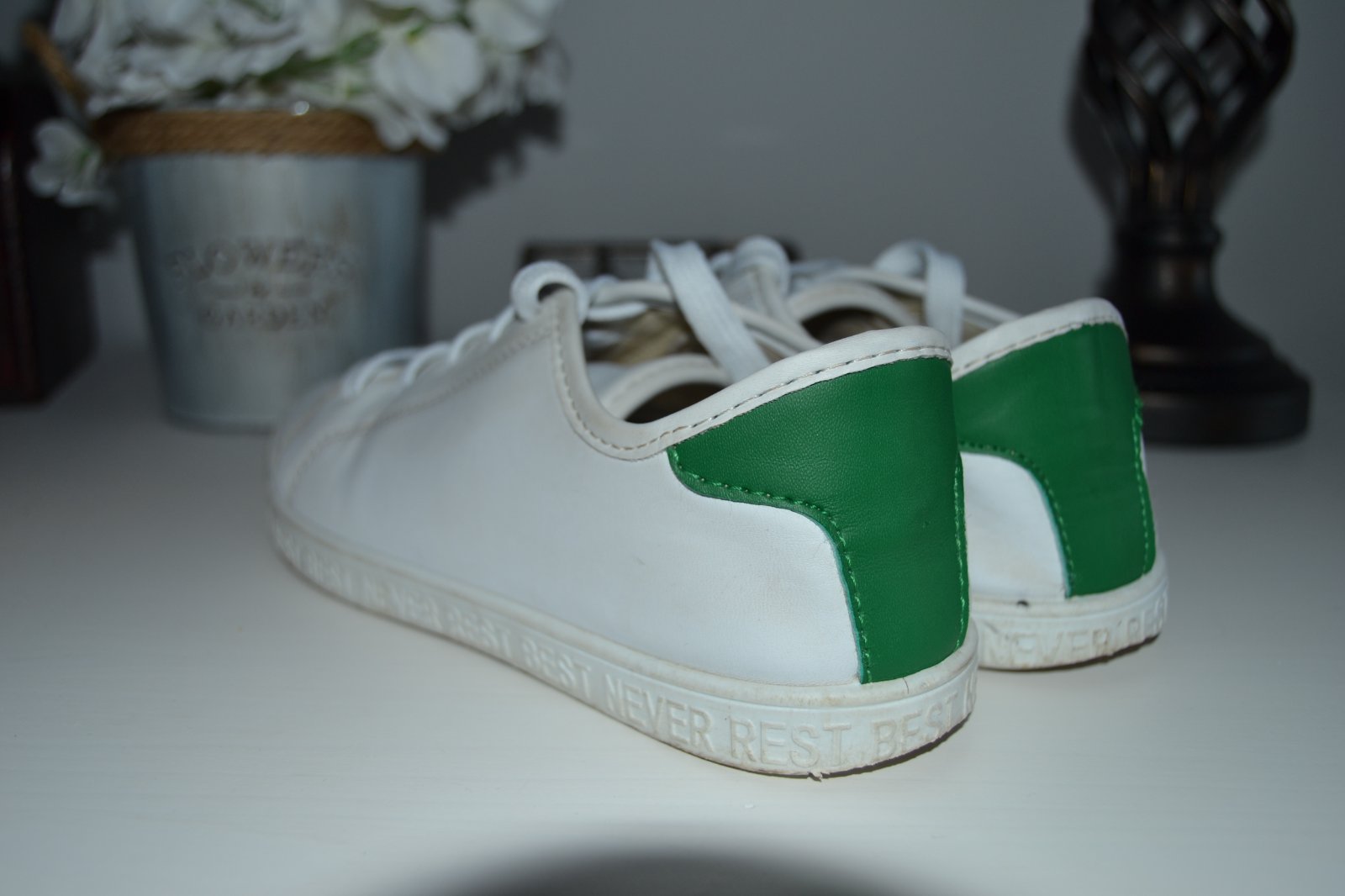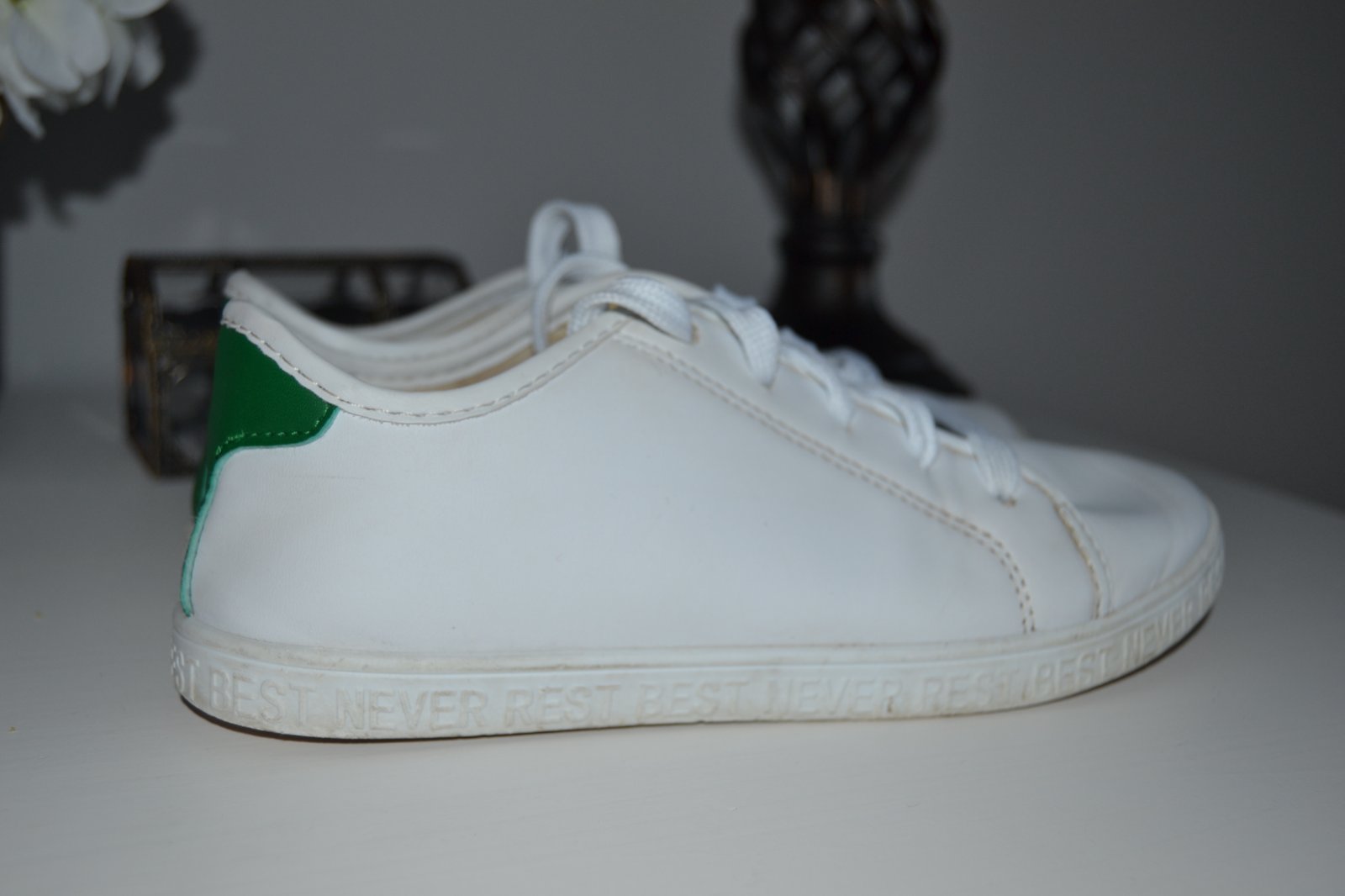 Biele tenisky na šnurovanie na zadnej strane zelený ozdobný pruh, veľkosť 34, vnútorná dĺžka 22,5 cm.