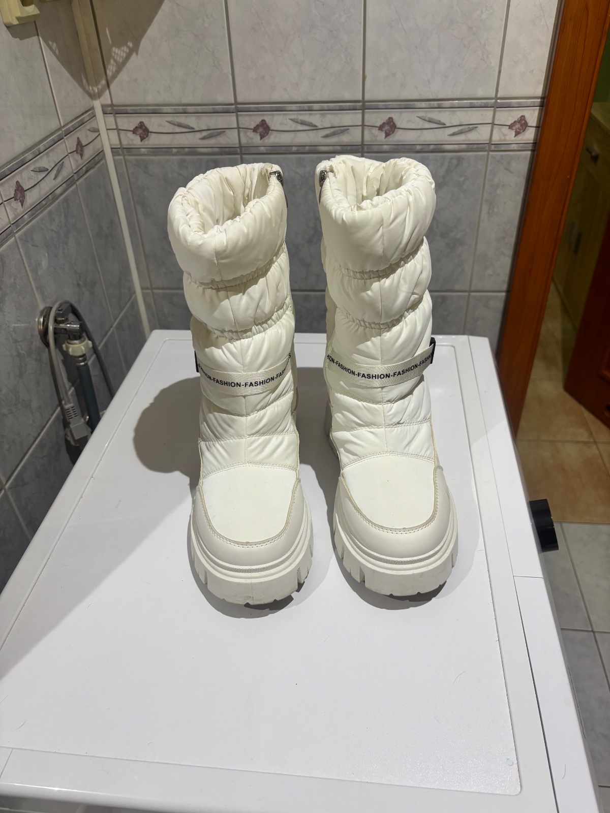 Predám biele kožené čižmy, veľkosť 38. Čižmy sú nové. V bezchybnom stave. Opatok je 9,5cm, platforma je 1cm. Šírka sary hore je 38cm. Výška sary nad pätou je 29cm. Čižmy sú zateplené.