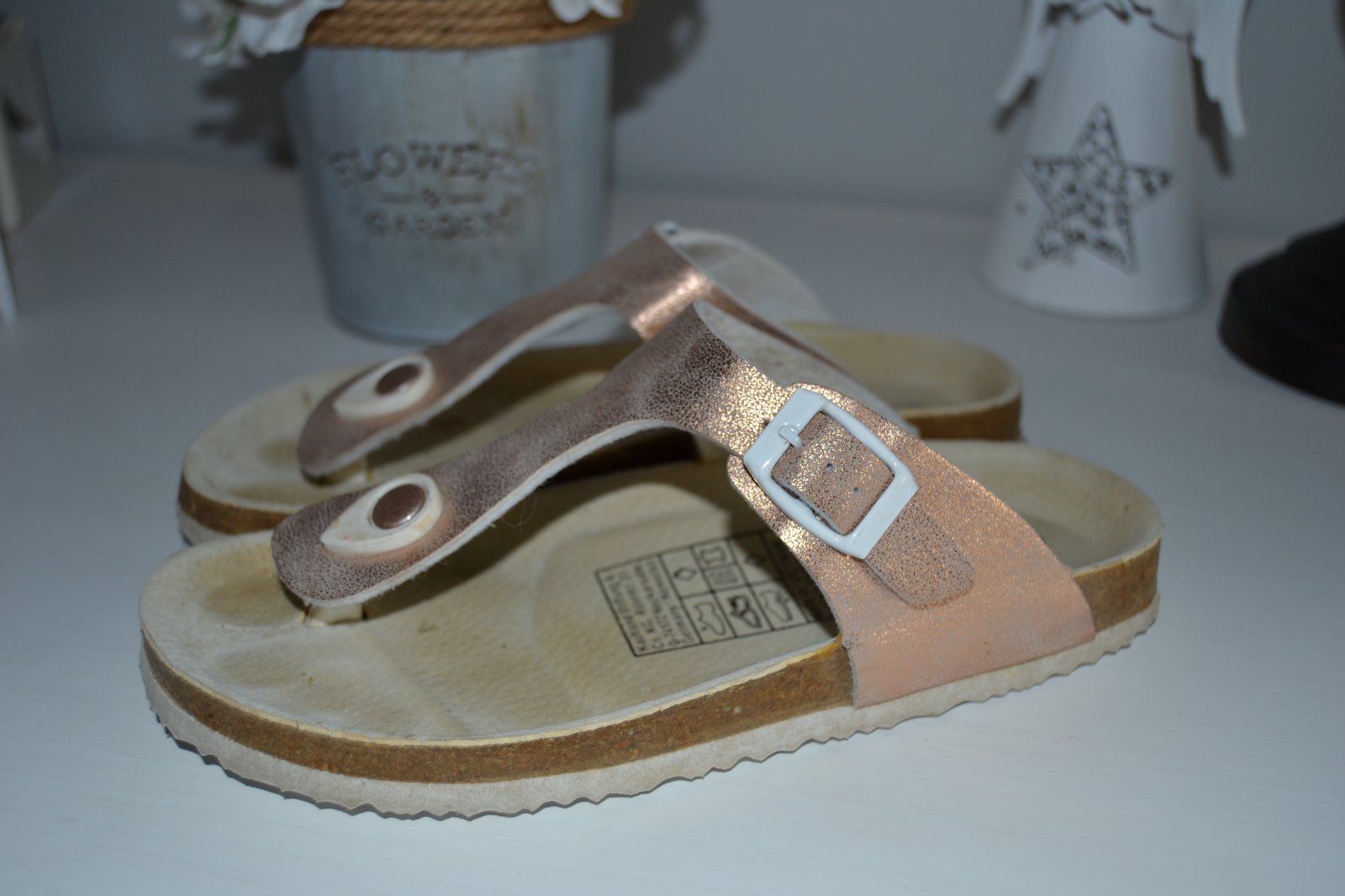 Detské metalické šľapke medzi prsty medenej farby, veľkosť 33, obvod cez nožičku sa dá nadstaviť prackou na boku, obuté 2 x.