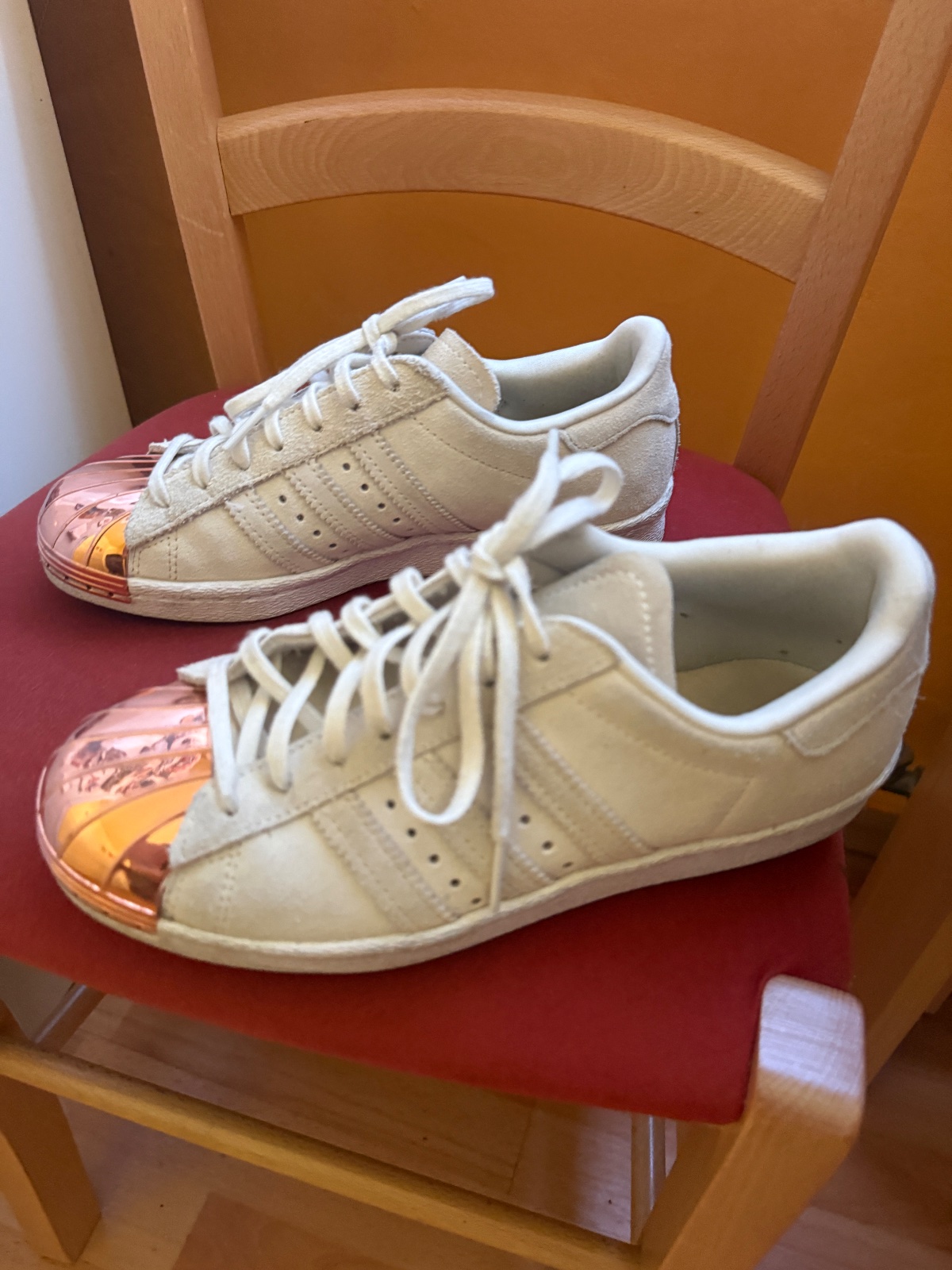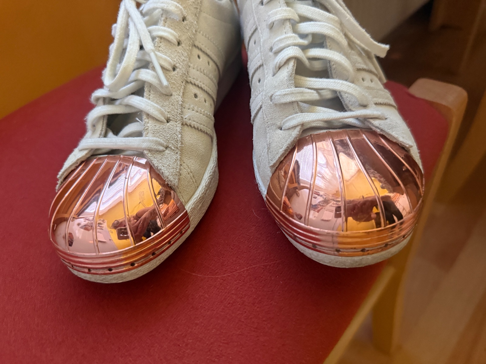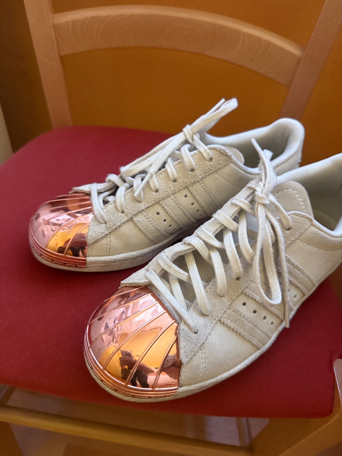 Profil: Ikonické tenisky adidas Superstar v prevedení z prémiového semišu a typickou špičkou, ktorá však nie je gumová, ako je u topánok Superstar zvykom, ale kovová. Lesklá špička tak dodáva topánkam úplne autentický vzhľad.