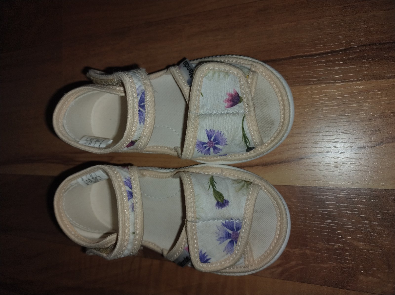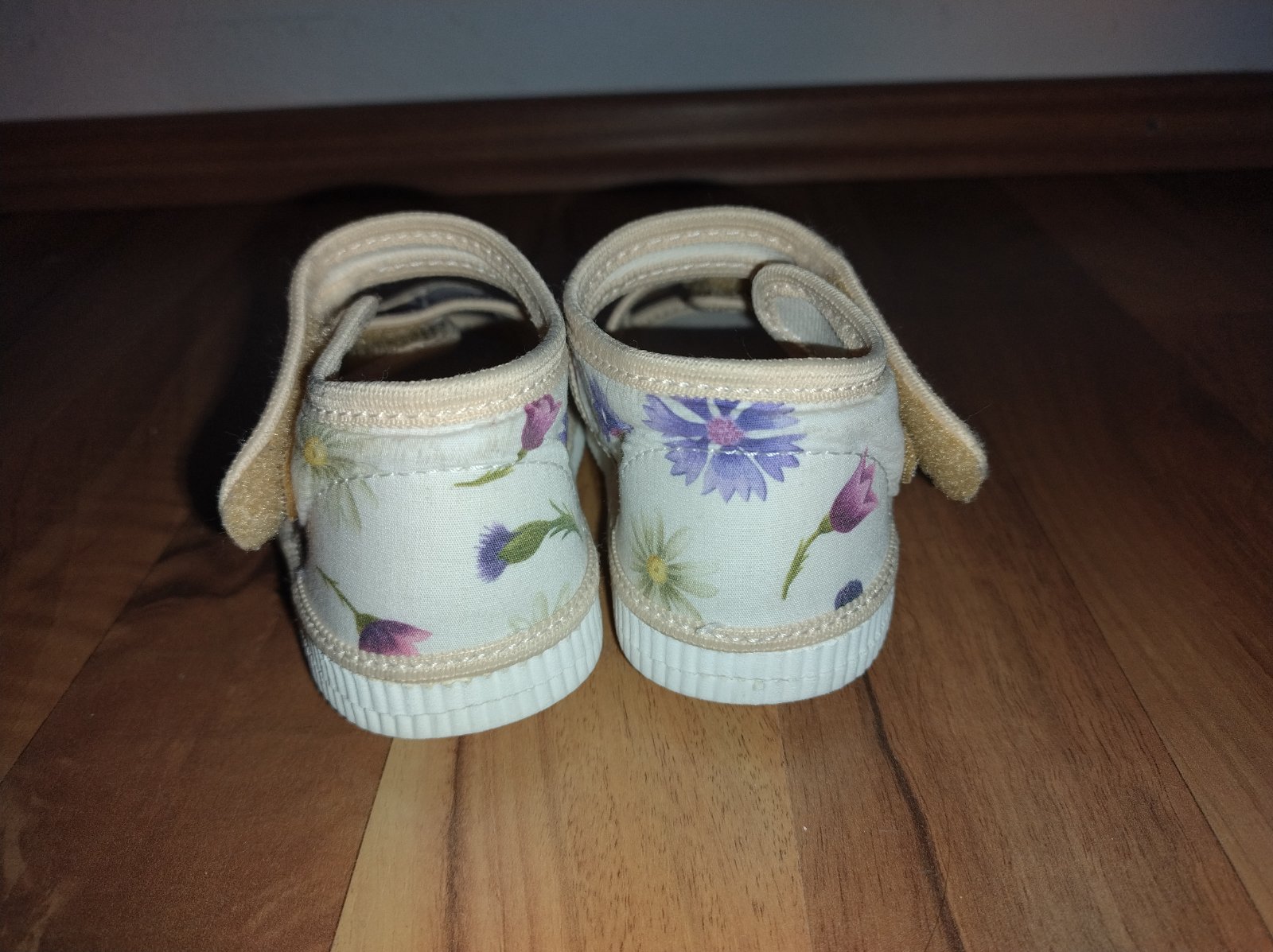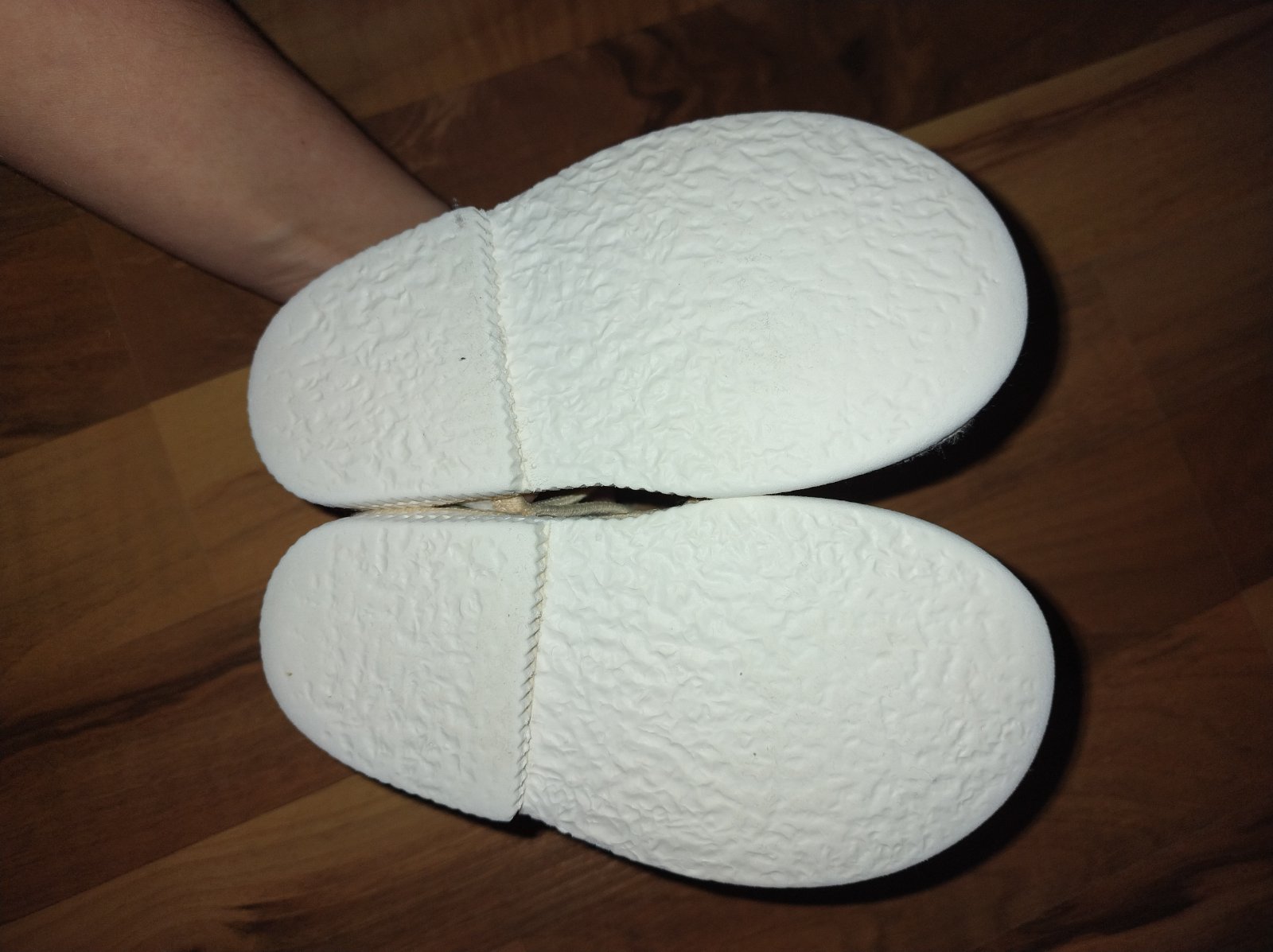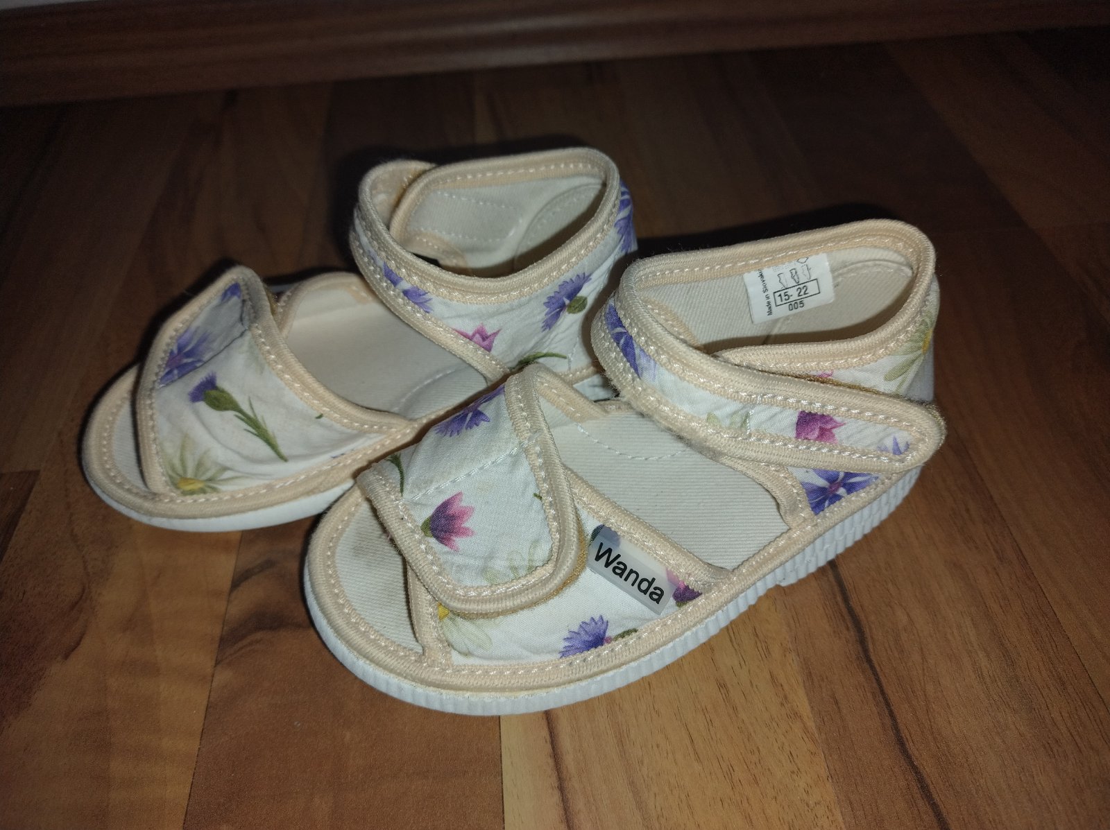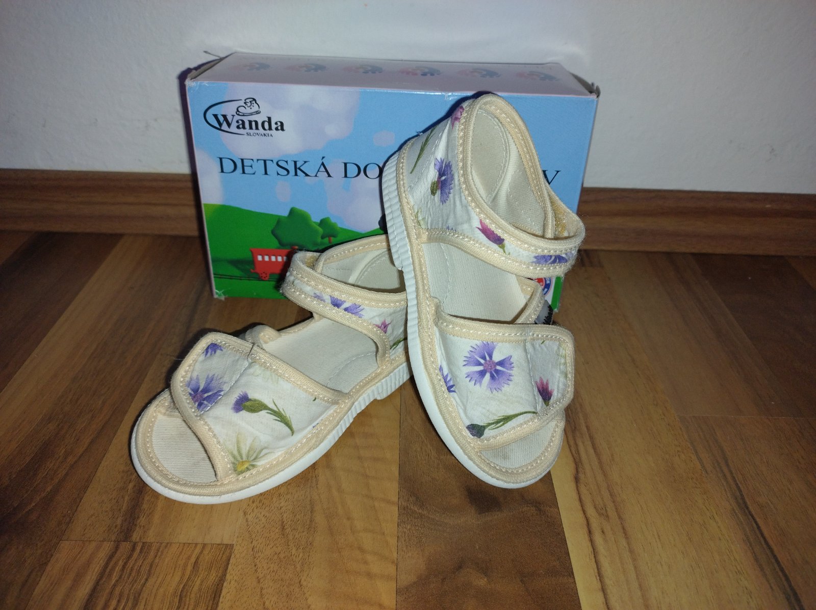 Papuče slovenskej značky Wanda. Majú spevnenú pätu, jemne tvarovanú stielku, regulovateľné suchým zipsom (cez členok aj nárt). VD pozri foto. Nosené 2 mesiace v škôlke, majú bežné známky nosenia.