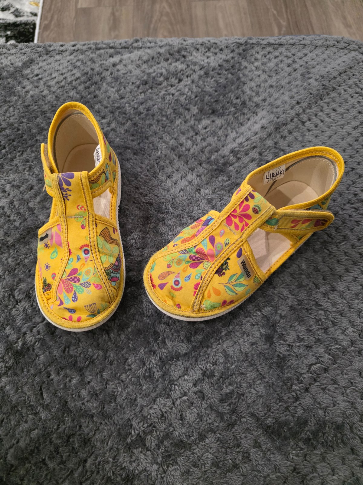 Detské papučky z prírodného textilného materiálu sandálkového typu so zatvorenou špičkou. Podošva je vyrobená z mäkkého, ale odolného styroporu. Uzatváranie je na suchý zips veľkosť 17 = vnútorná d...