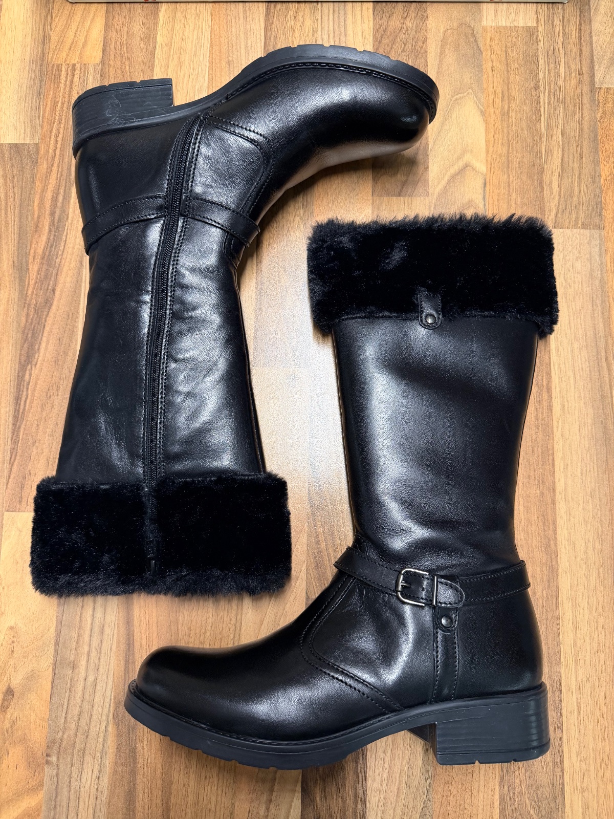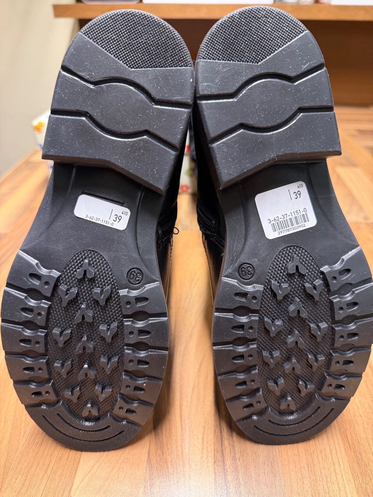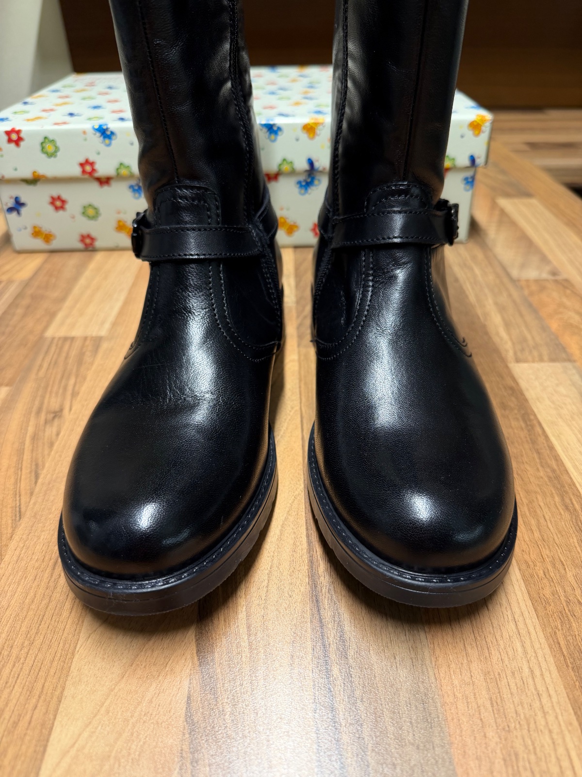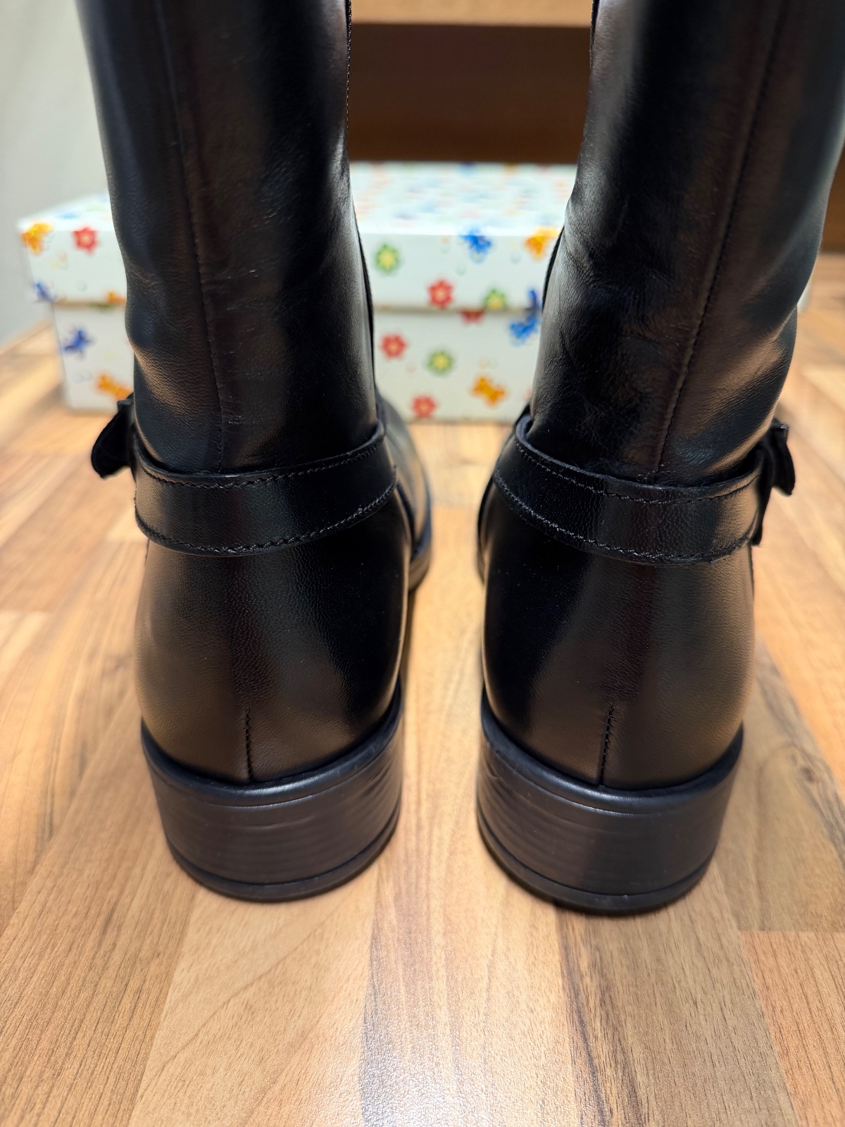 1x obuté, nízky pohodlný opätok, možnosť horné pracky utiahnuť alebo uvoľniť podľa šírky lýtka. Sú na úzke lýtka. Mne su malé, mám nohu 39, po pôrode mi narastla o číslo noha.
