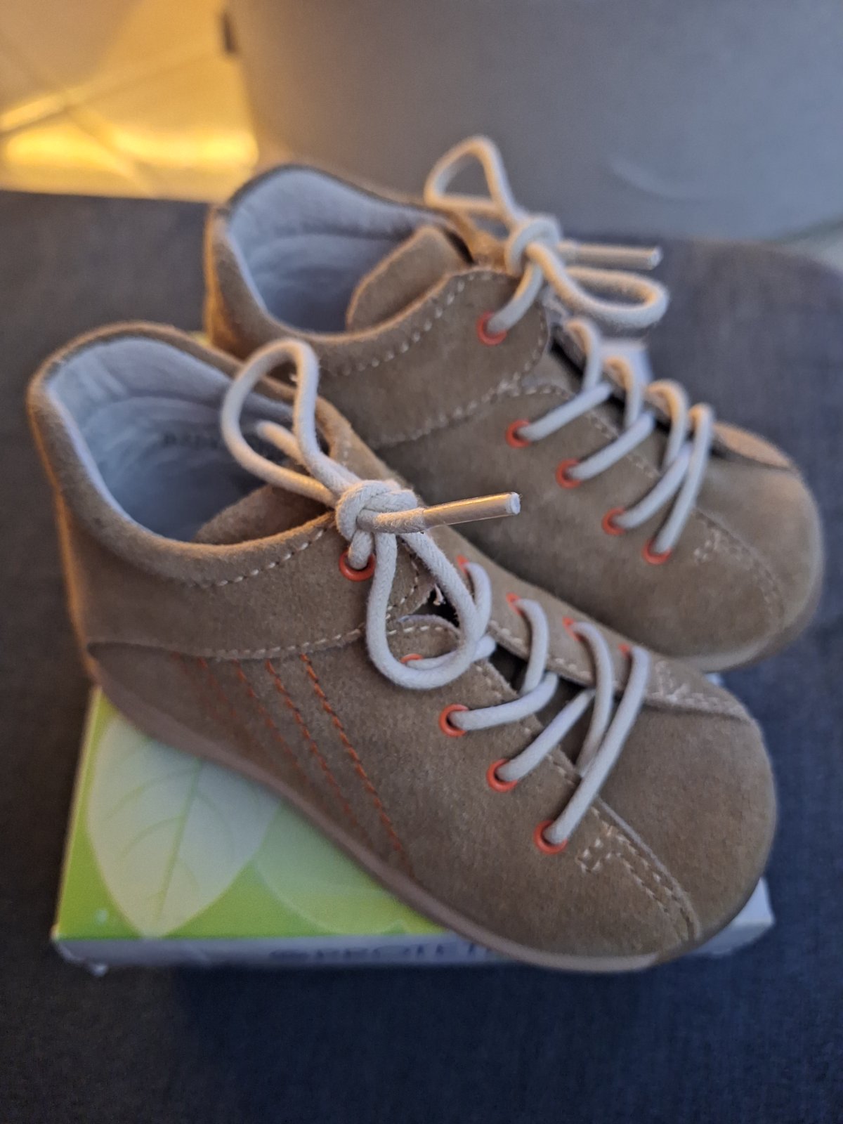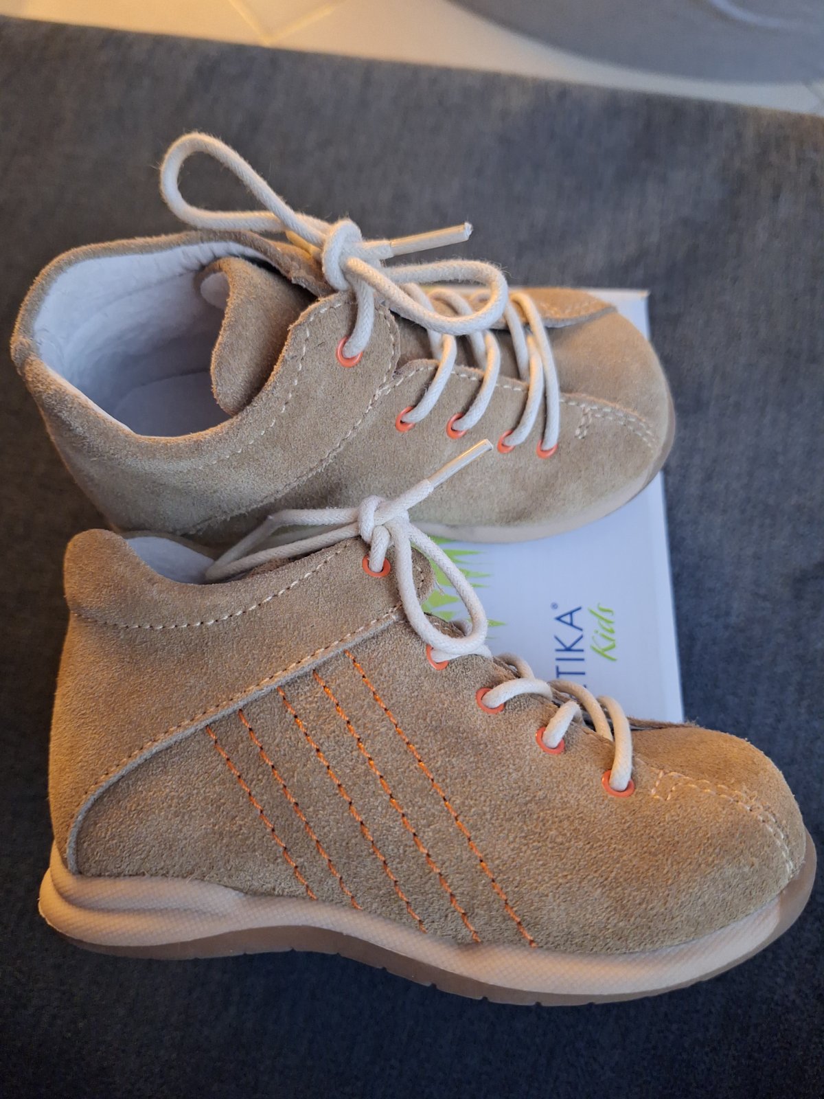 Chlapčenské topánky pre prvé krôčky sú vyrobené z brúsenej kože modrej farby, doplnené béžovým pásikom. Okolo členka je mäkký golierik. Majú klasické šnurovanie. Vo vnútri sa nachádza vyberateľná s...