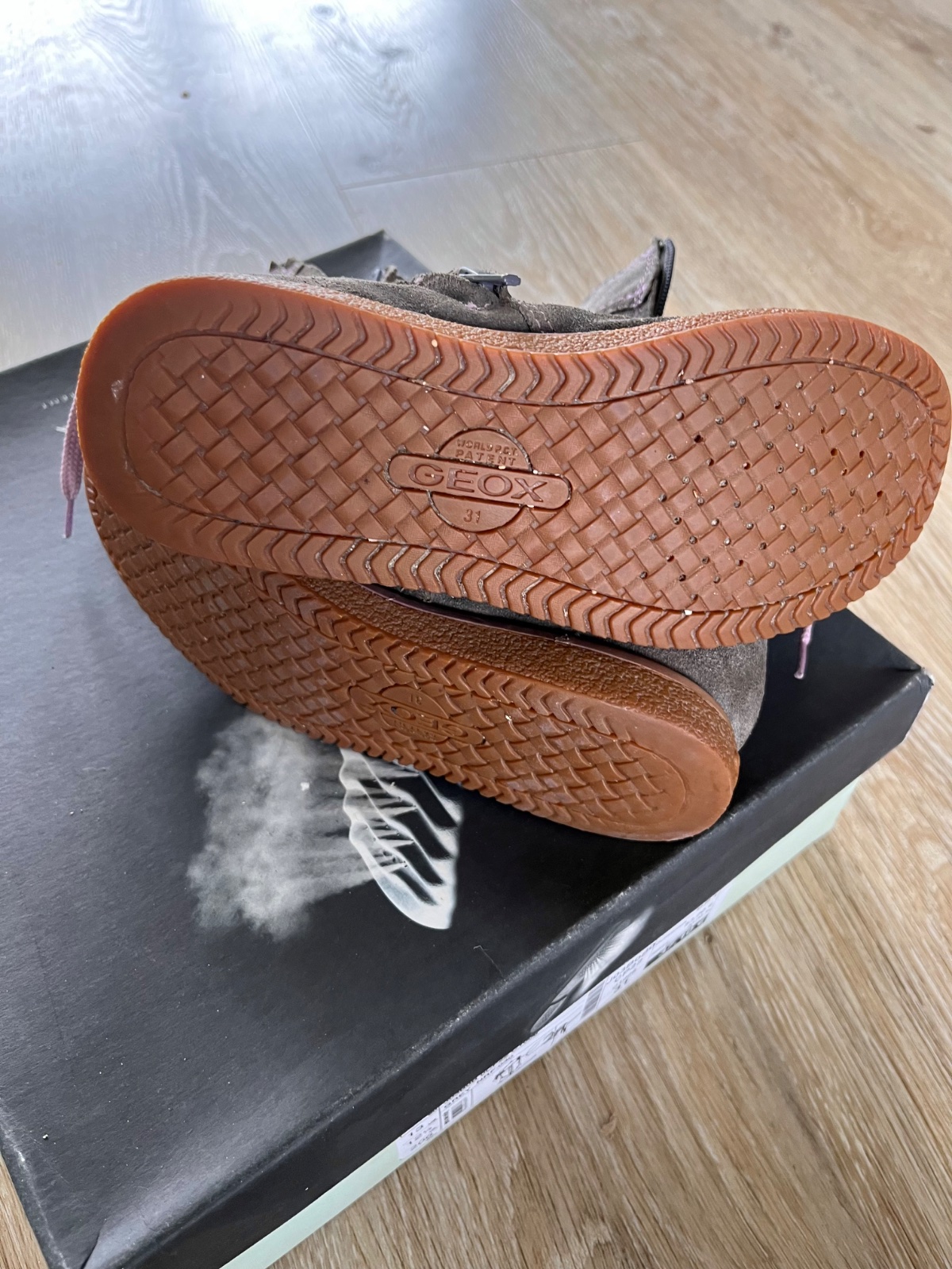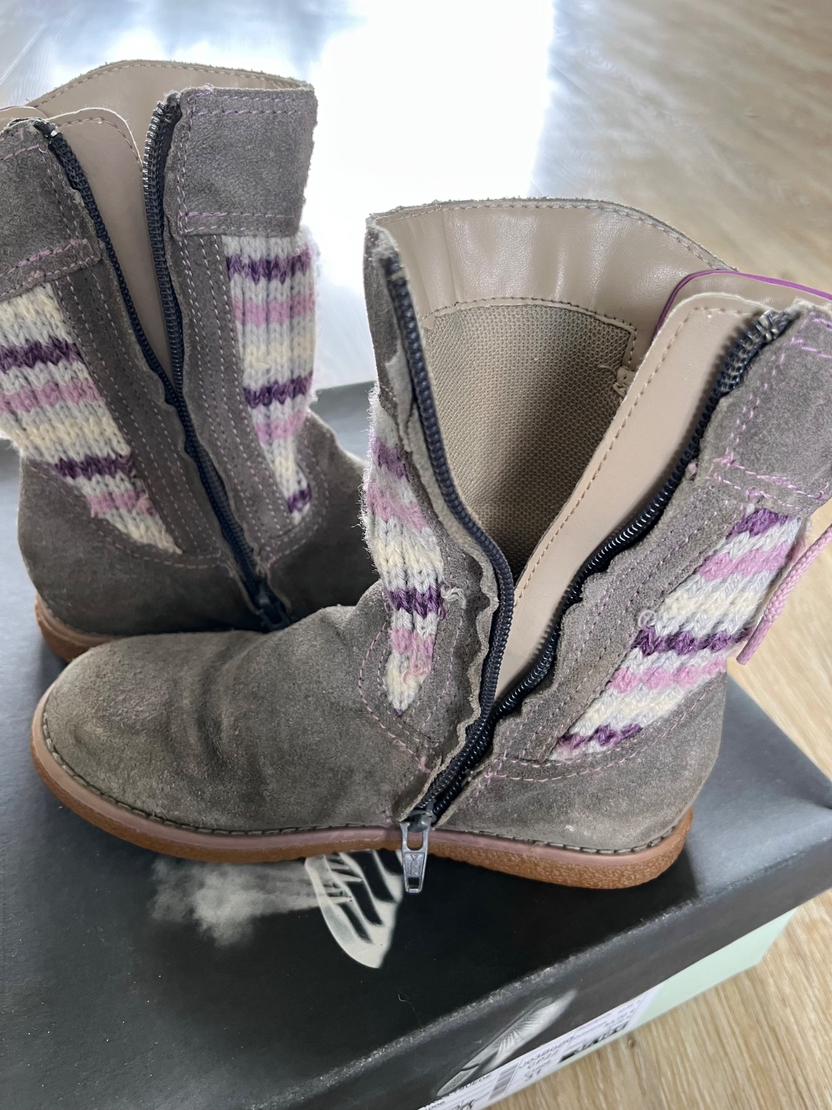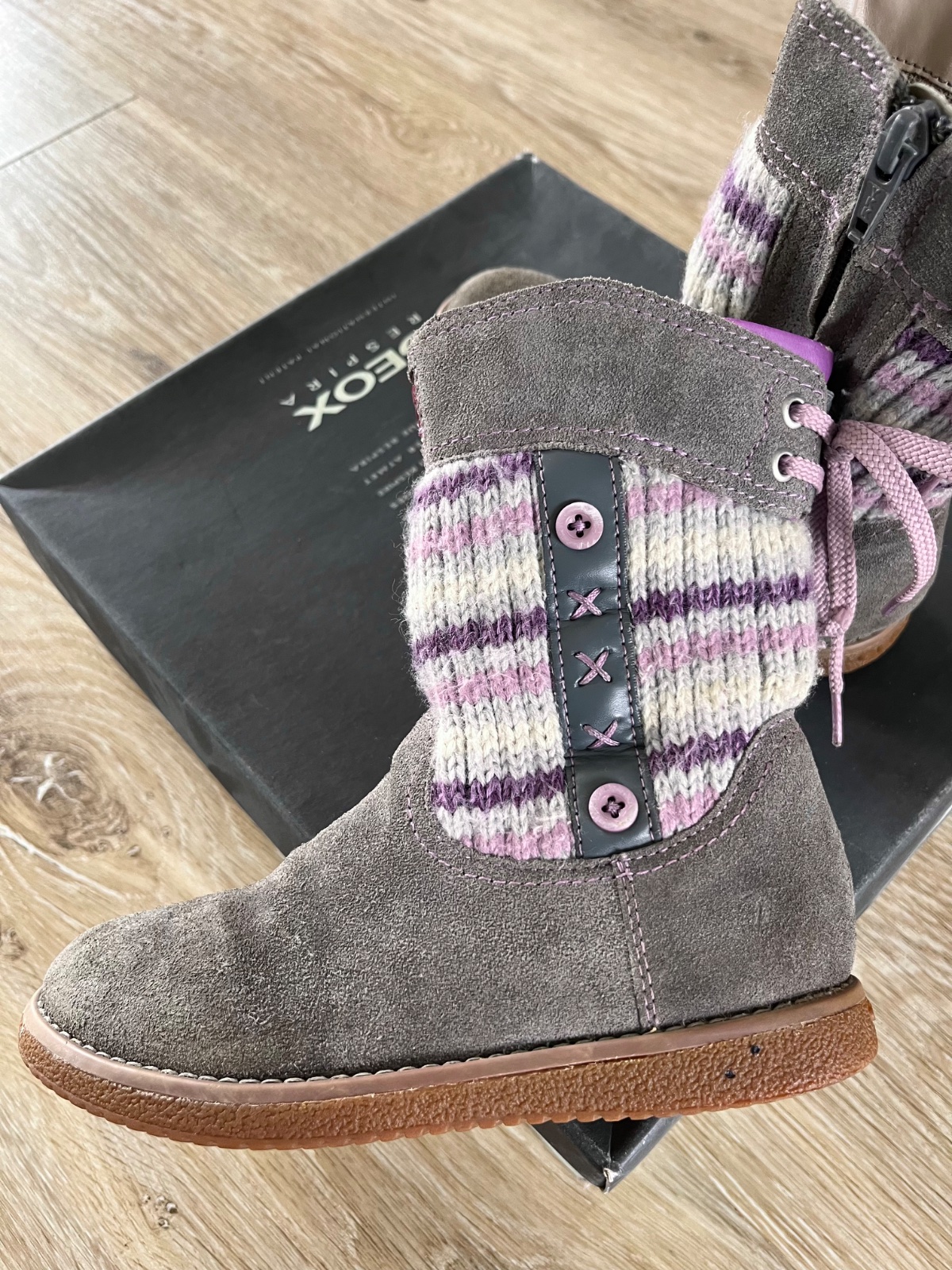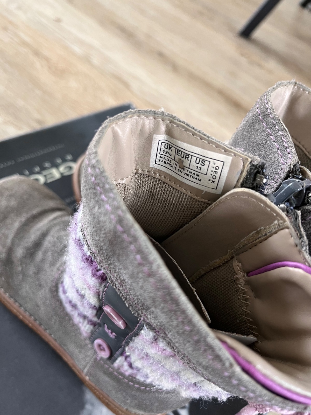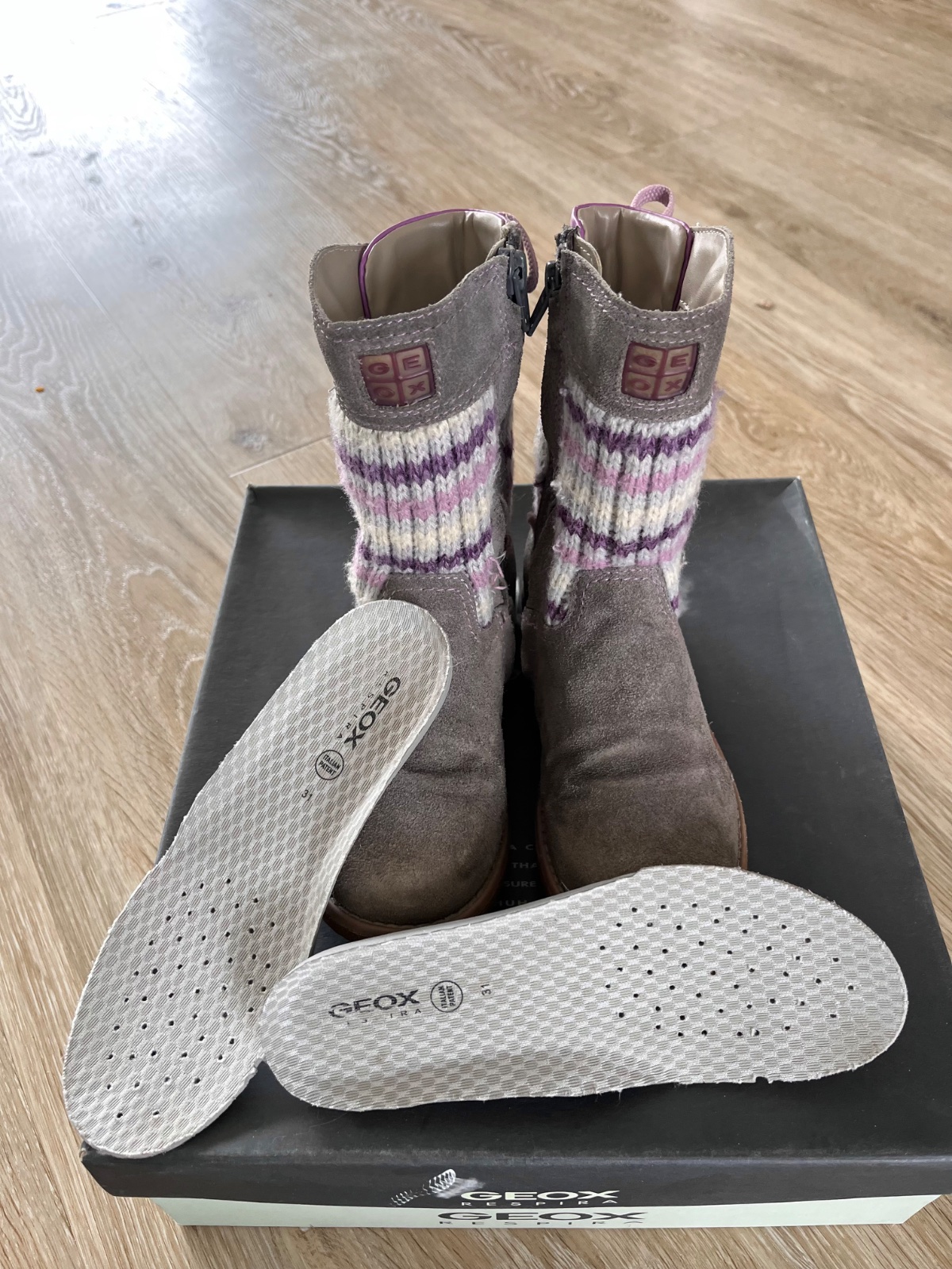 Brúsená koža prechodné čižmy. Uvádzaná veľkosť 31, ale sú ako 30 (geoxky sú menšie). Vyčistené, nosila druhá dcéra 1 sezónu, čiže chvíľu. Na zips.vnútorná dľžka 19,5 cm