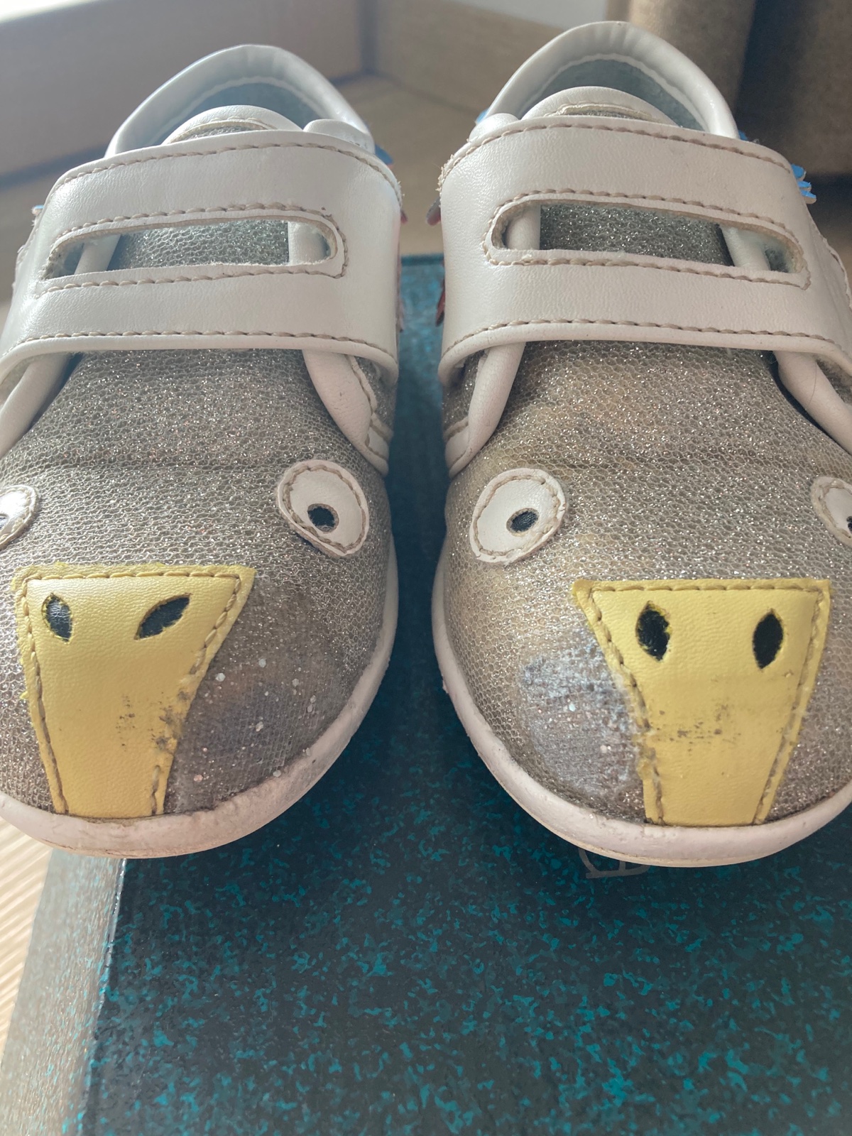 Sú v dobrom stave až na vnútornú stranu špičiek.Mala ich nosila aj v škôlke a tam ich na odrazadle osuchala no je to nositelne - je to trochu prekryté aby to nebolo tak viditeľne ale určite v škôlke dobre poslúžia pri detských hrách.